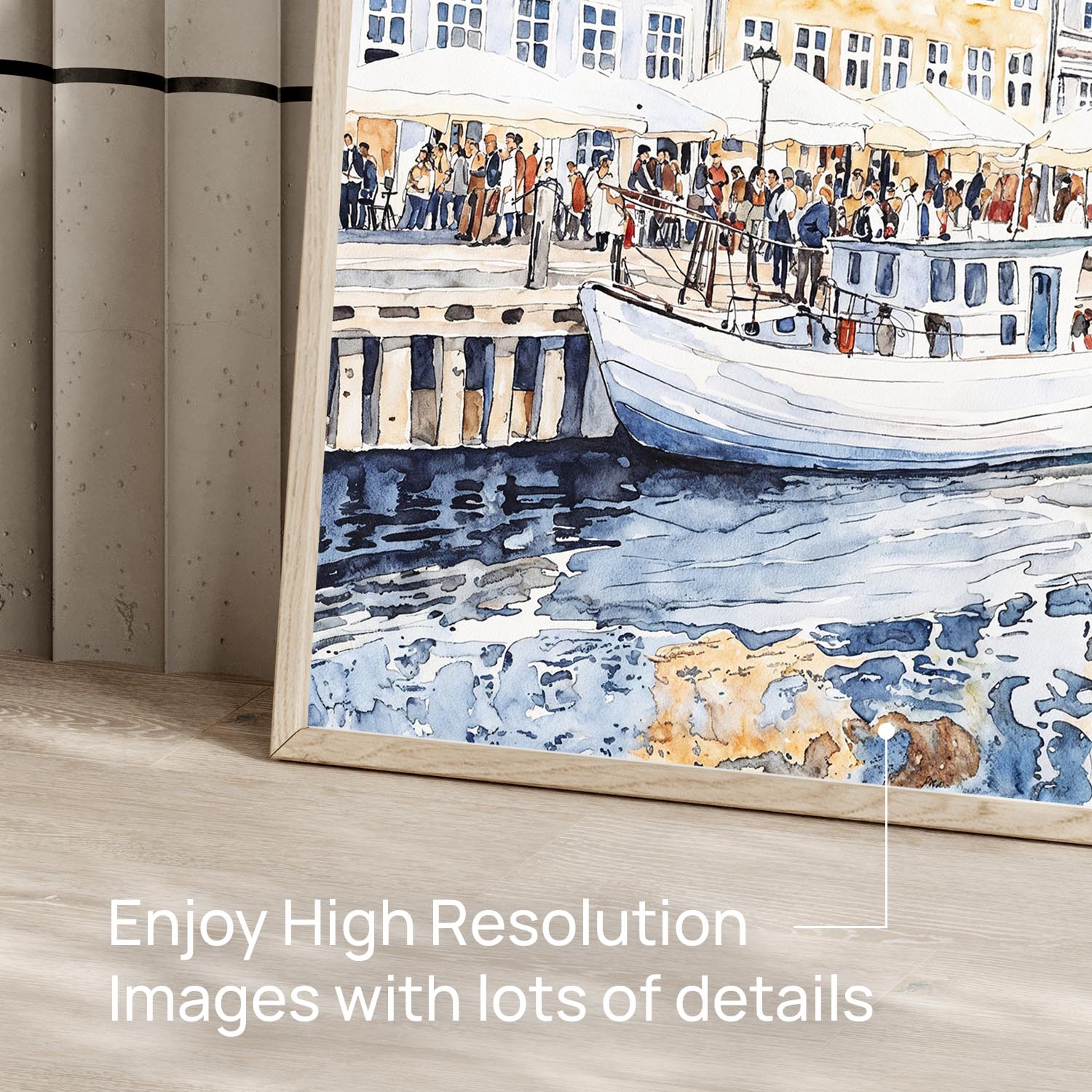 Enhance your space with this Copenhagen Harbor digital download wall art. The vibrant watercolor captures the lively waterfront and colorful buildings, making it easy to print and display in any room. Enjoy instant access and flexibility in printing.