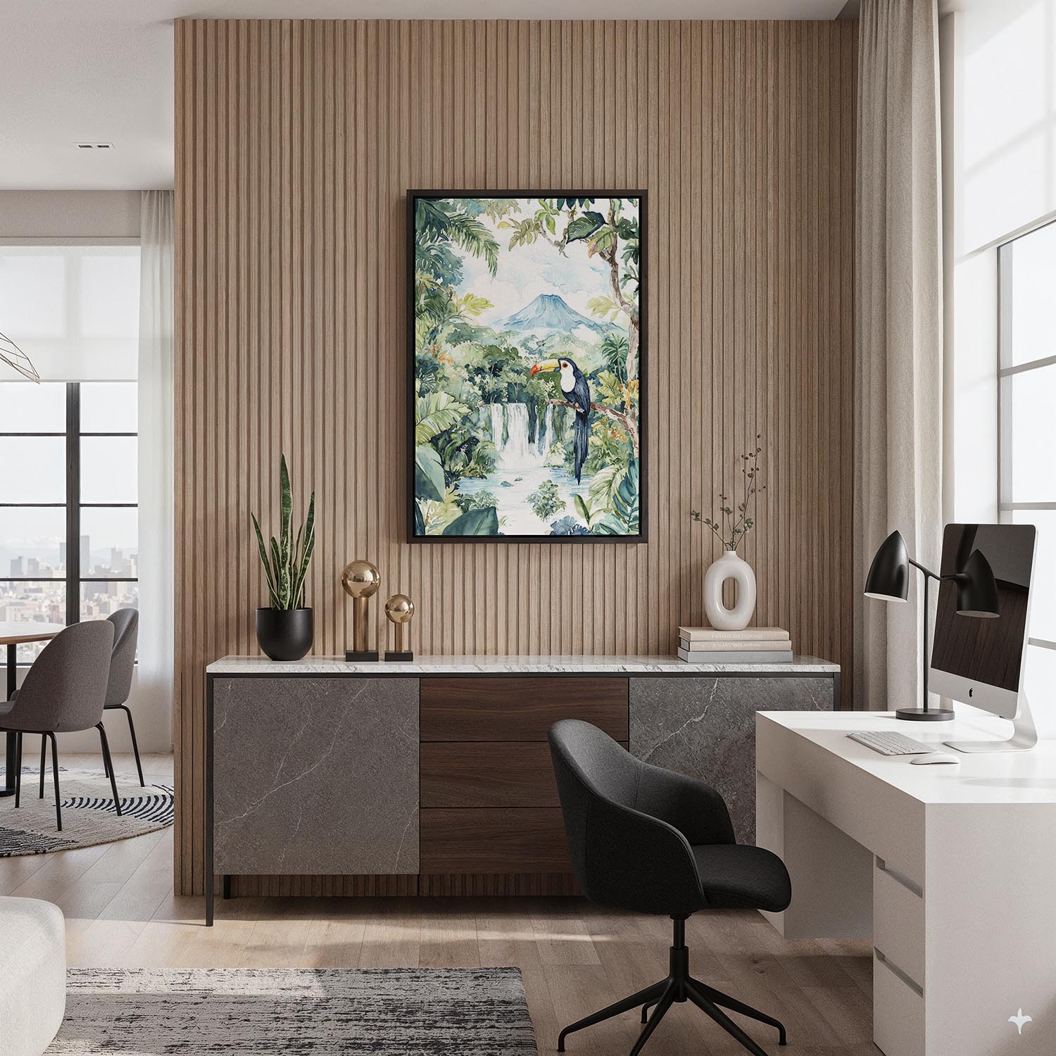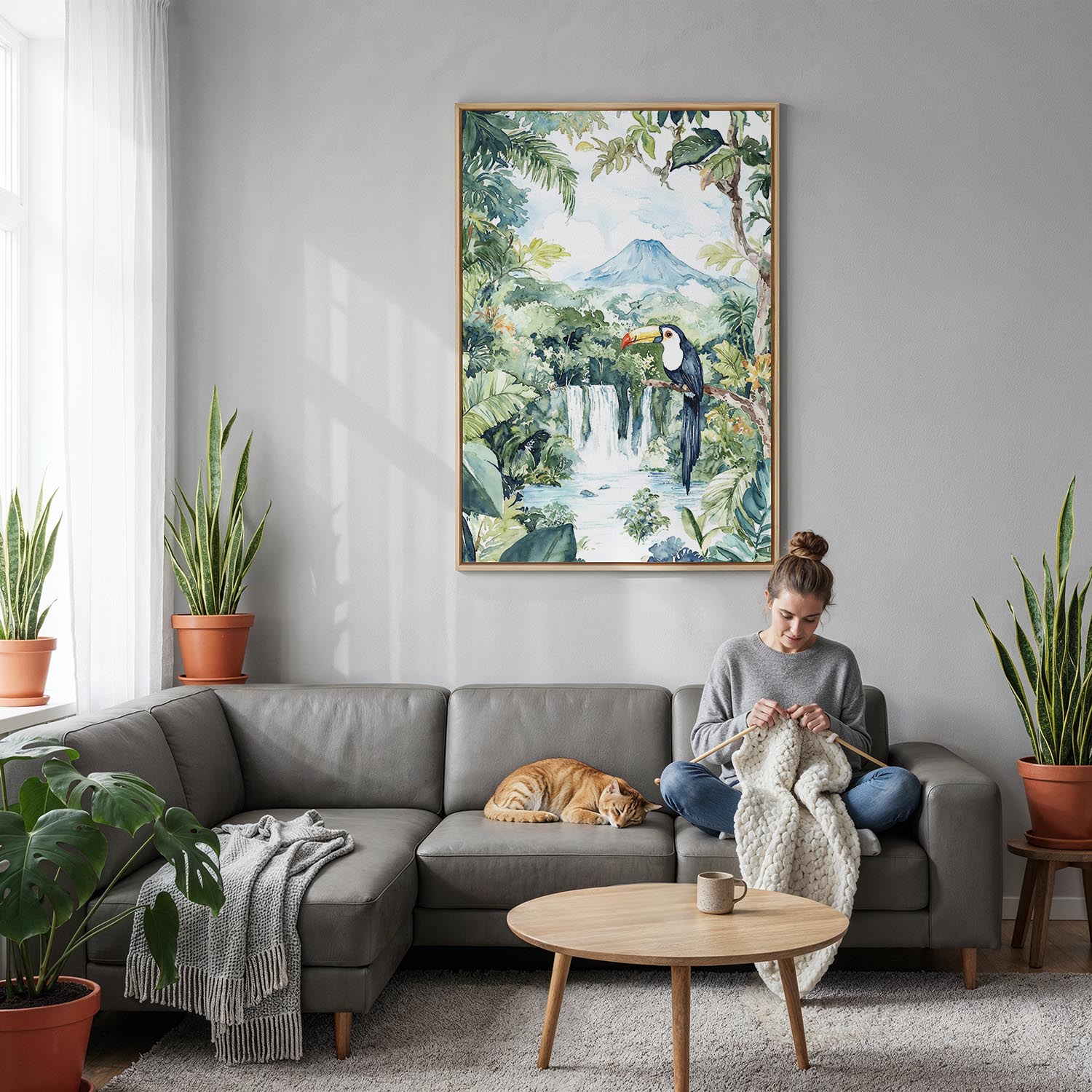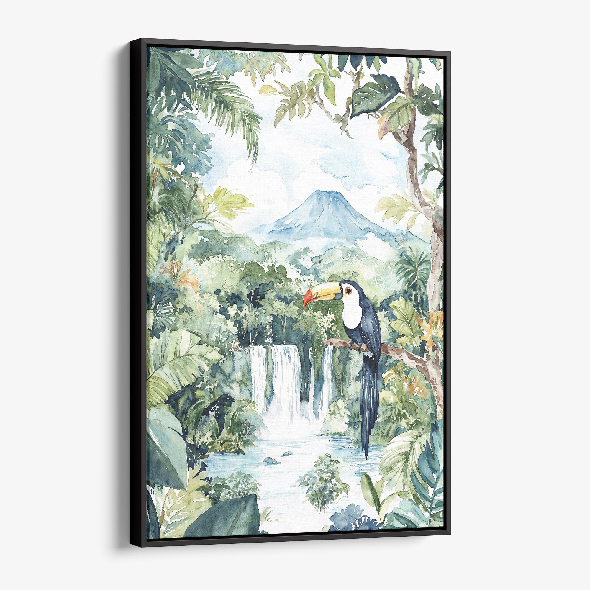 Immerse yourself in the enchanting landscapes of Costa Rica with this watercolor canvas print of the iconic Arenal Volcano. Capturing a harmonious blend of vibrant greenery and tranquil waterfalls, this artwork brings a slice of tropical paradise to your wall.