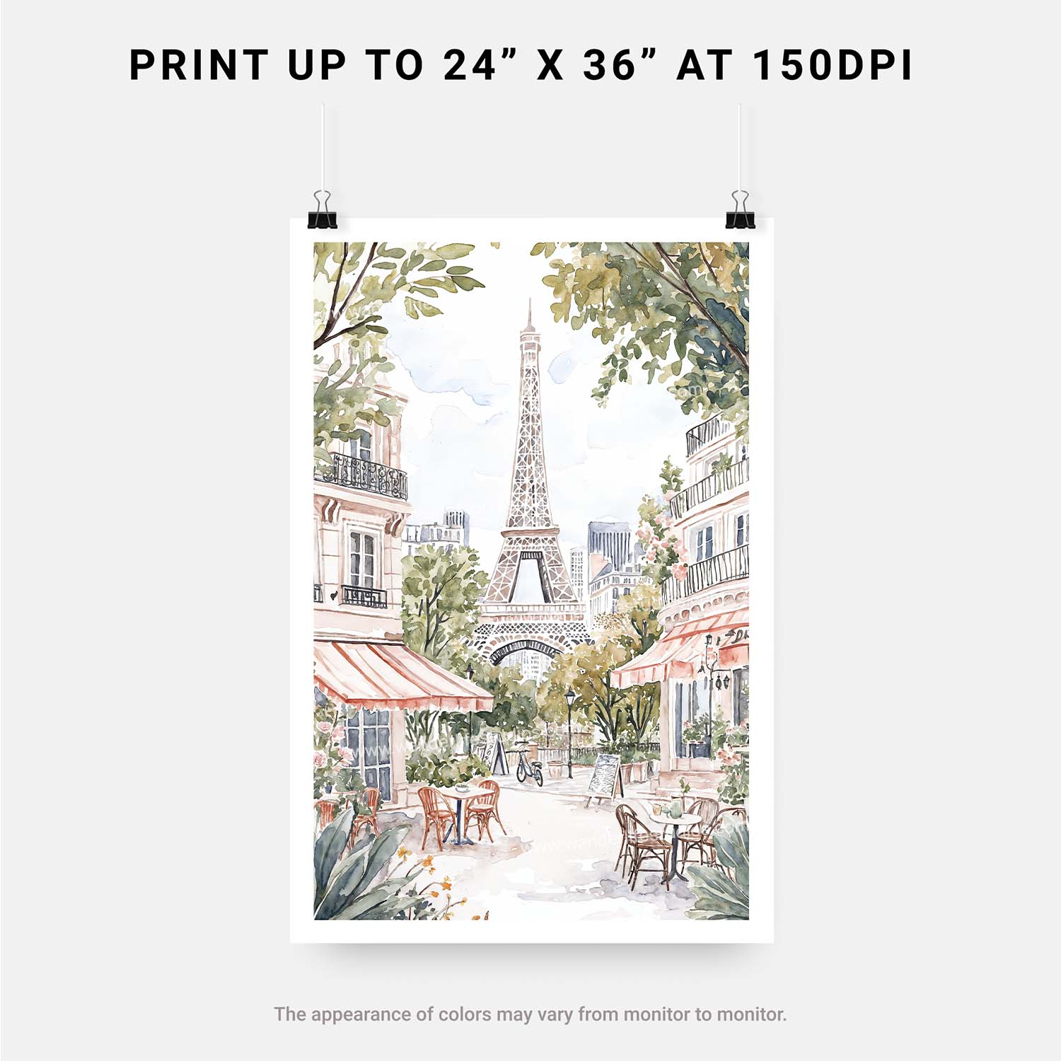 Transform your space with this cozy Paris cafe scene digital download. Featuring the Eiffel Tower, this watercolor art offers instant access for easy printing at home or your local shop.