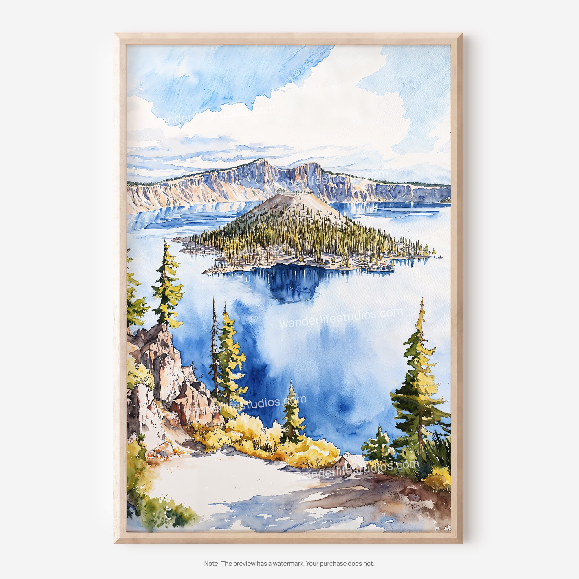 Crater Lake Watercolor Art – Scenic Digital Download Wall Art