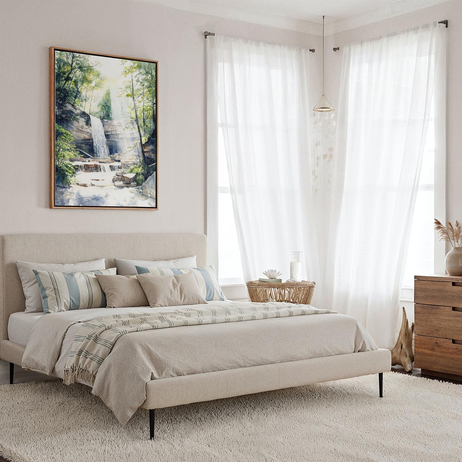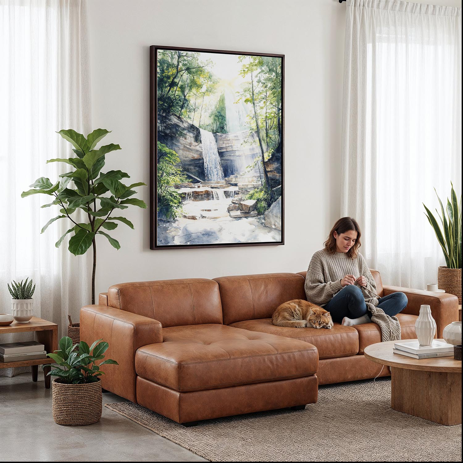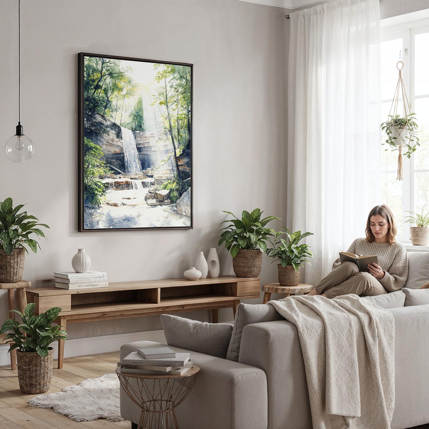 Step into the lush landscapes of Cuyahoga Valley National Park with this striking watercolor canvas print. It beautifully captures the light filtering through trees and the gentle flow of waterfalls, embodying the serene essence of this Ohio treasure.