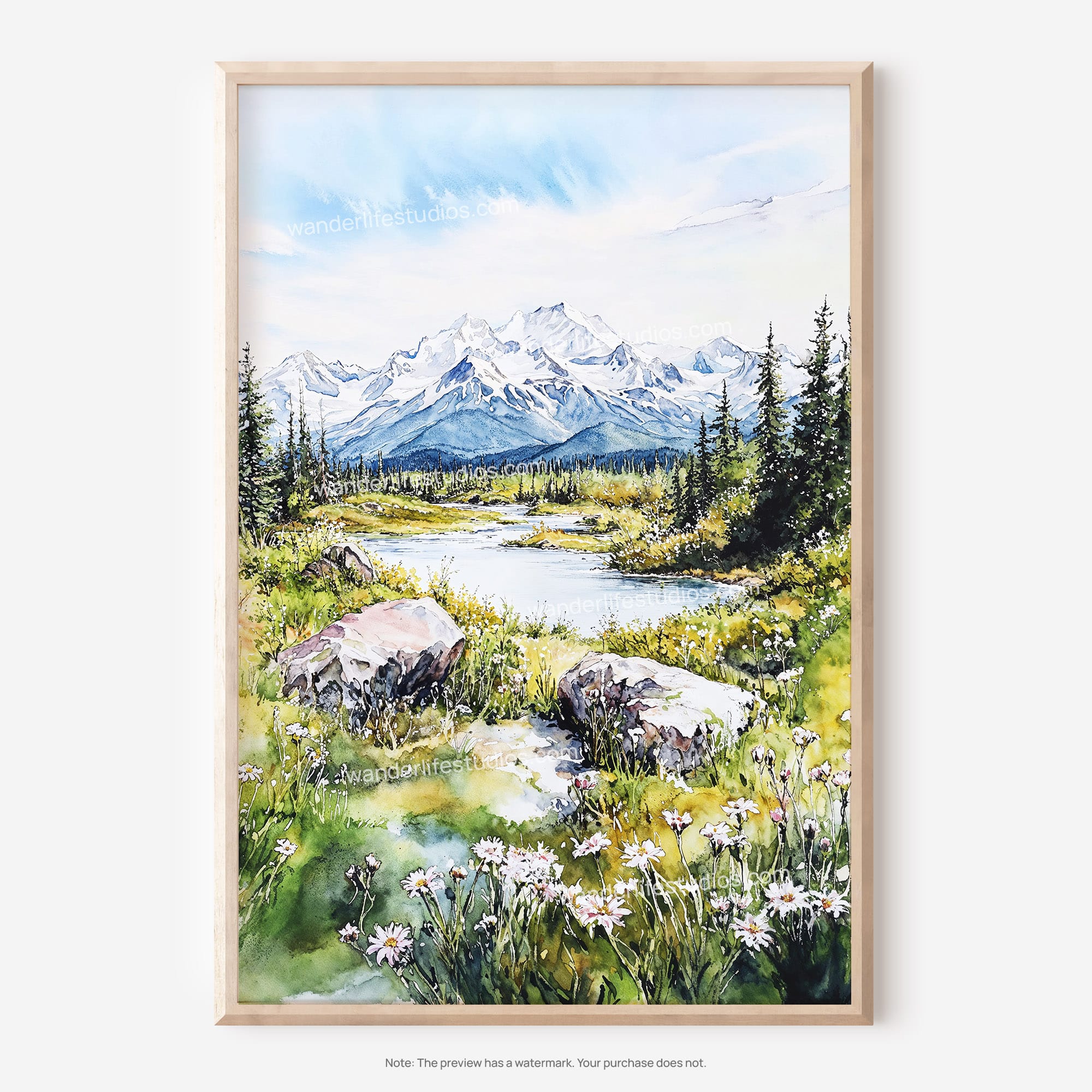 Immerse yourself in the breathtaking scenery of Denali National Park with this beautiful watercolor artwork. The lush greenery and towering mountains create a refreshing atmosphere, evoking feelings of adventure and serenity. This high-resolution digital file allows you to easily print it at home or through your local print shop. Ideal for living rooms, bedrooms, or offices, this artwork brings the spirit of the great outdoors into your space. Enjoy the flexibility of instant access to transform your walls immediately.