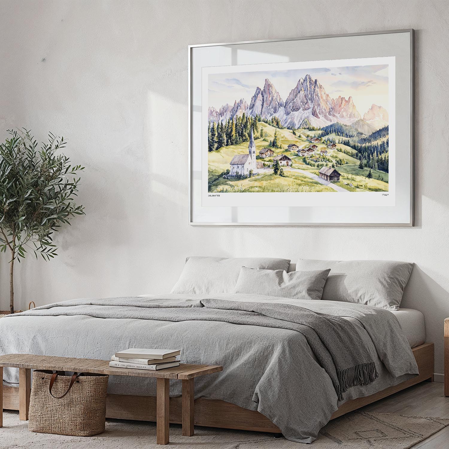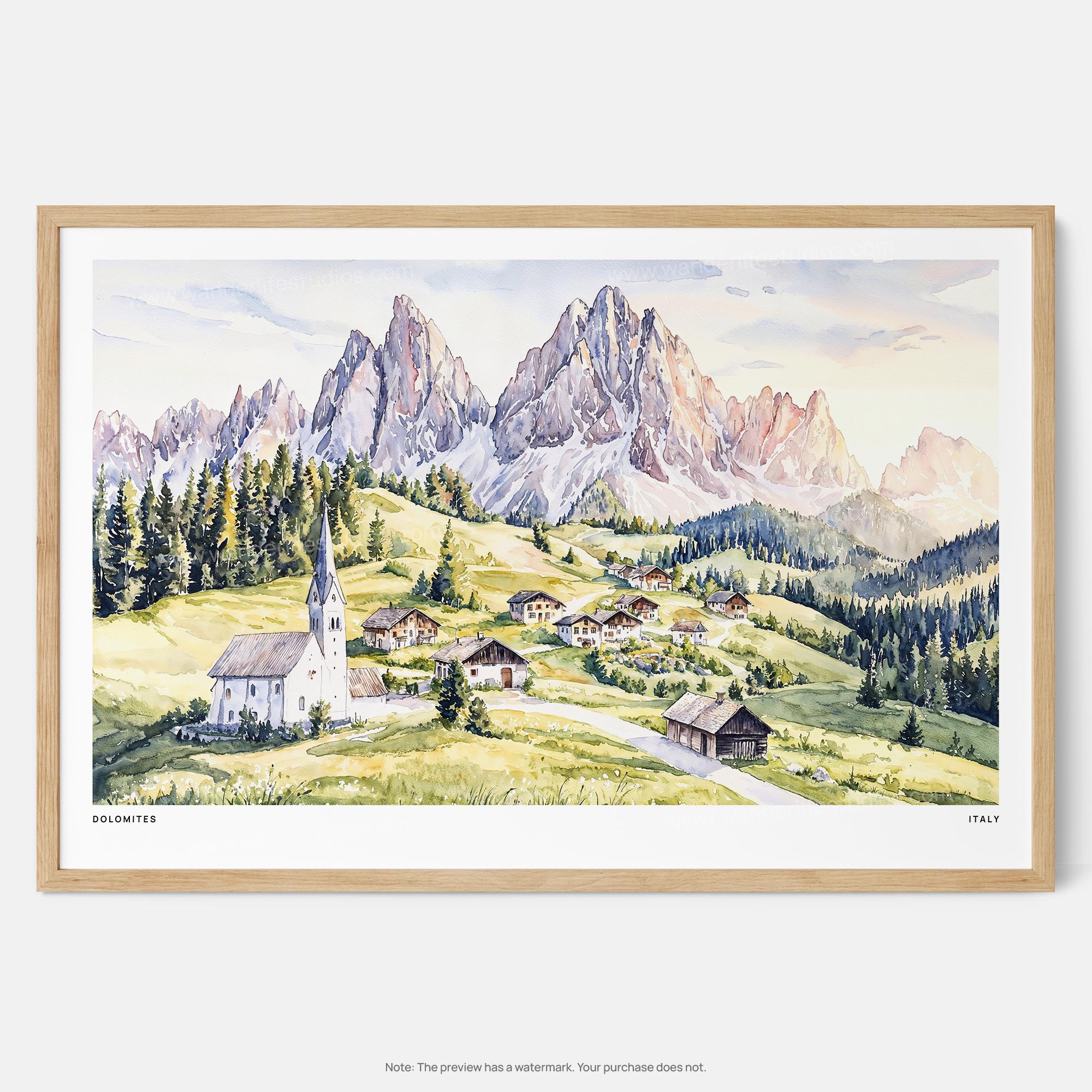 Invite the charm of the Dolomites into your space with this watercolor art print. It features stunning mountains and a quaint church, perfect for enhancing your living room or office.