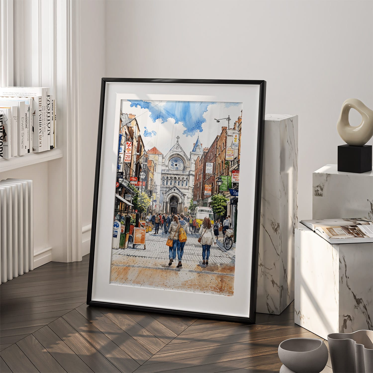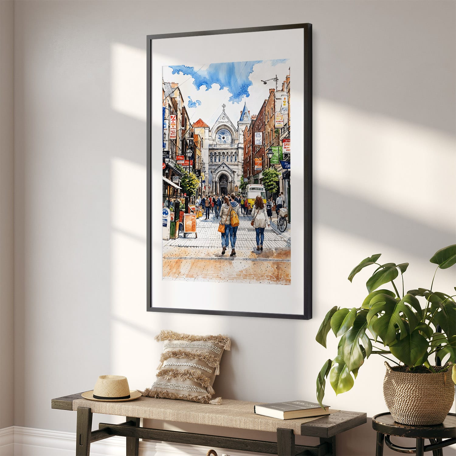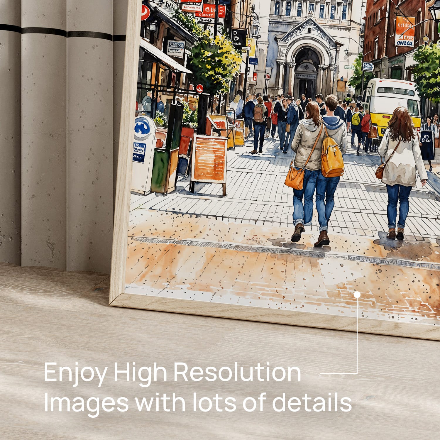 Transform your space with this Dublin cityscape digital download wall art. This lively watercolor illustration features bustling streets and charming architecture, allowing you to easily print and display in any environment.