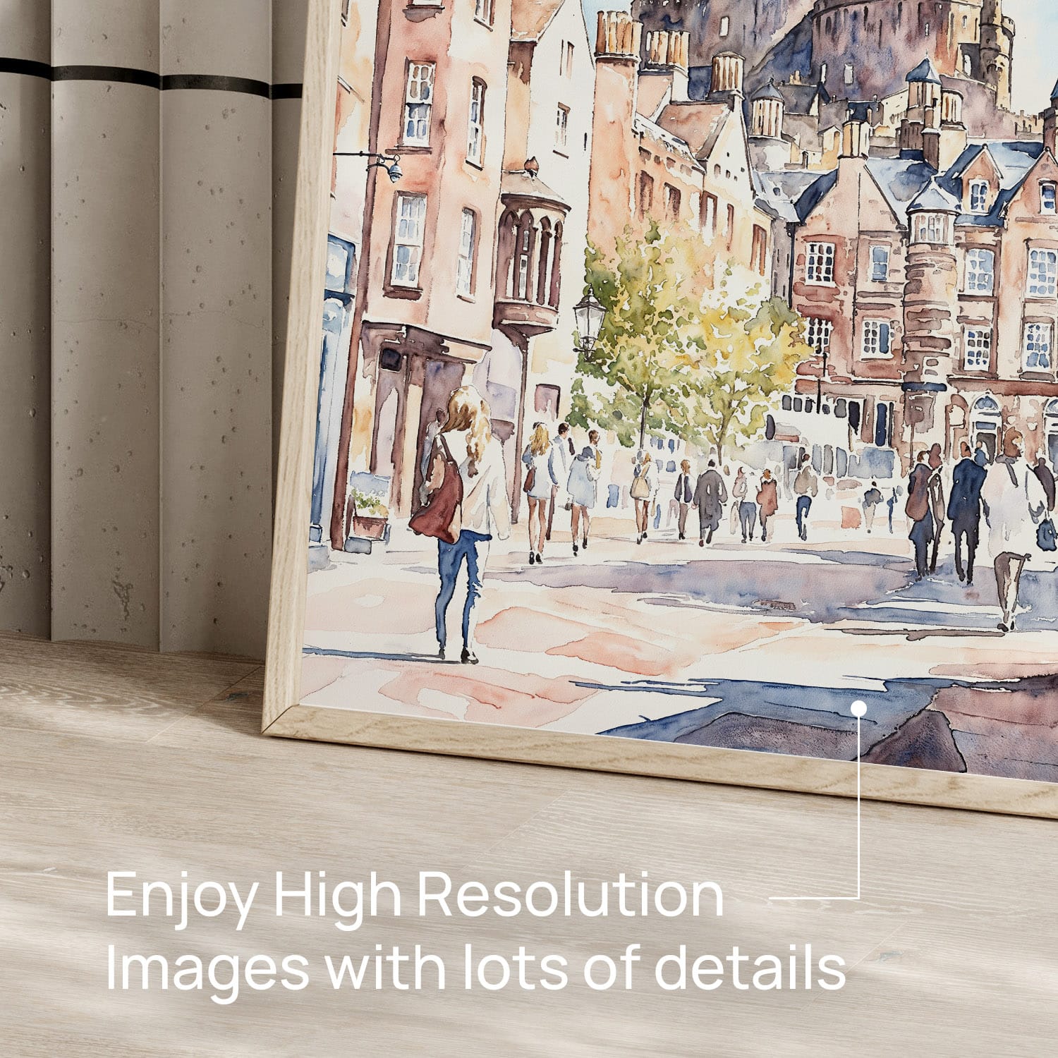 This artwork showcases the iconic Edinburgh Castle, nestled atop the vibrant streets filled with activity. The warm hues and detailed architecture evoke a sense of memory and adventure, making it perfect for any living space. Available as a high-resolution digital file, you can easily print it at home or through a local shop, bringing a piece of Scotland into your home. Ideal for travelers, history lovers, or anyone looking to add character to their decor, you can enjoy instant access and the flexibility to refresh your walls effortlessly.