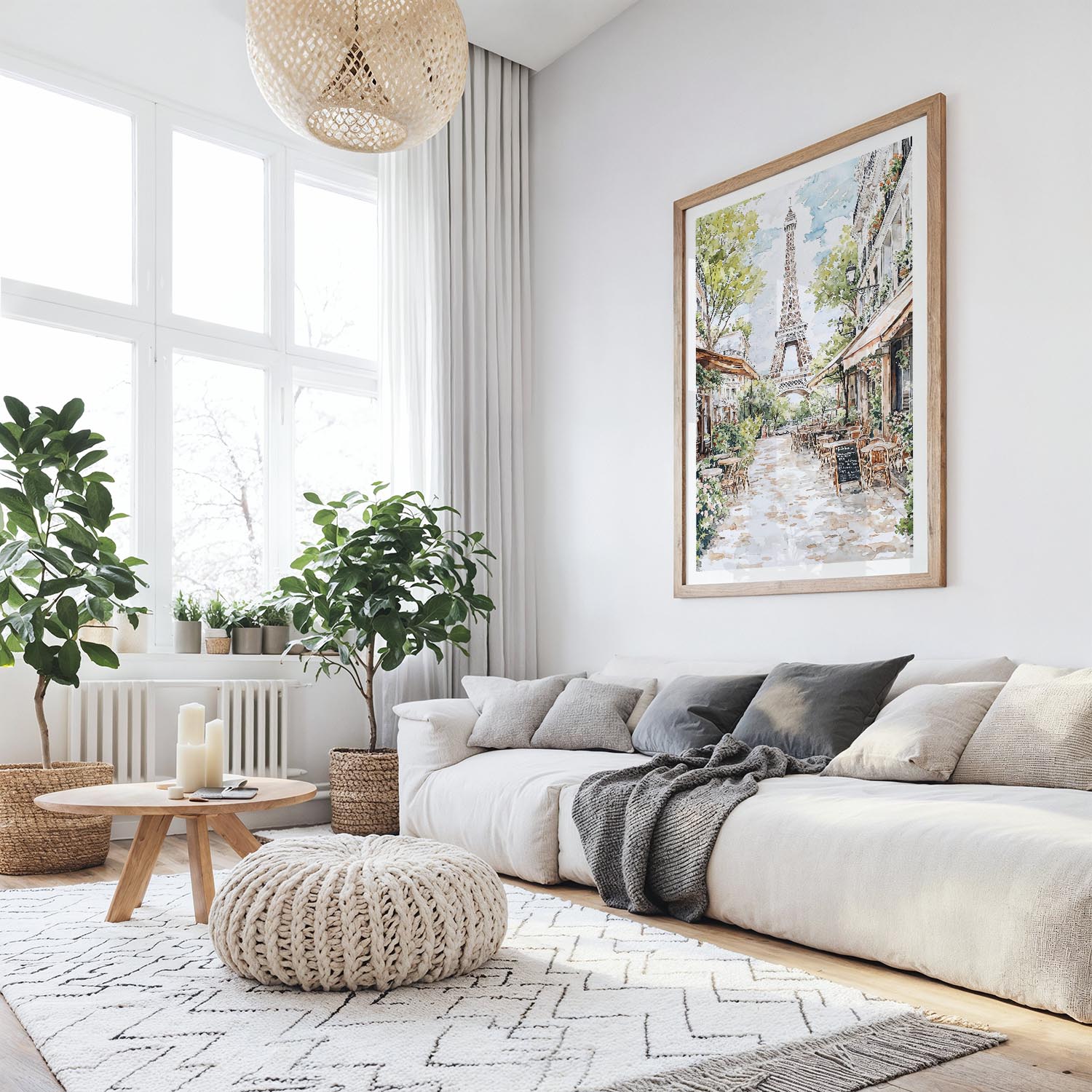 Add a touch of Parisian charm to your home with this watercolor art print featuring a lively cafe scene beneath the iconic Eiffel Tower. Ideal for brightening up your living room or office.