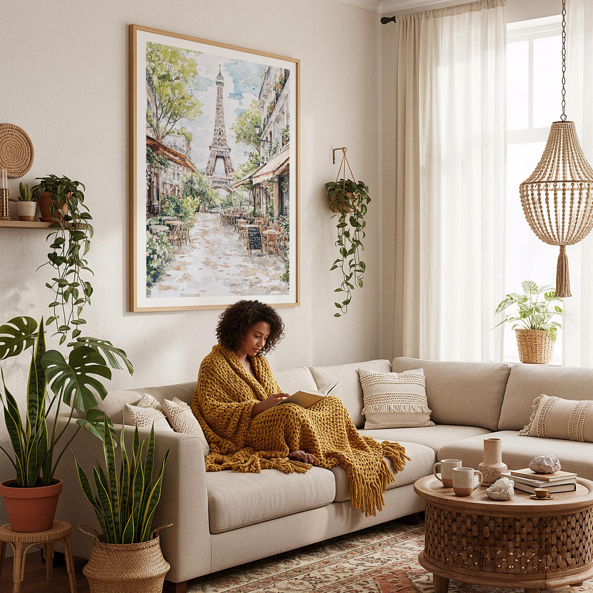 Step into the heart of Paris with this watercolor art print showcasing a vibrant cafe scene under the Eiffel Tower. The gentle colors bring the bustling atmosphere of a Parisian street to life, inviting you to imagine the clinking of glasses and soft chatter of patrons.