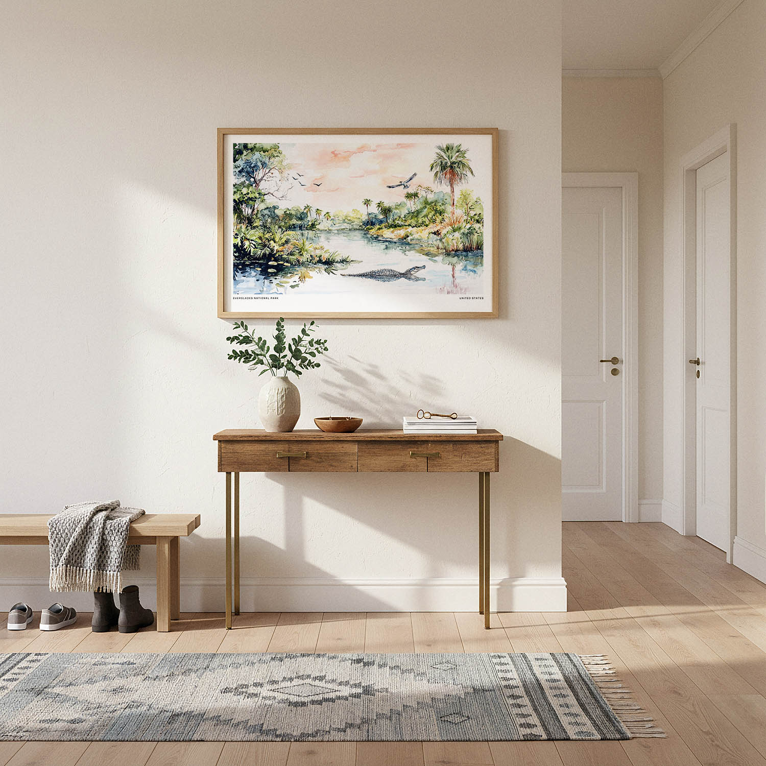 This artwork showcases the enchanting landscape of Everglades National Park, where rich greens meet shimmering waters. The gentle hues evoke a sense of calm and connection to nature, making it a perfect addition to a living room, office, or hallway. It’s a delightful choice for wildlife enthusiasts and anyone with a passion for travel. This print also serves as a thoughtful gift for friends who adore exploring the beauty of the outdoors.