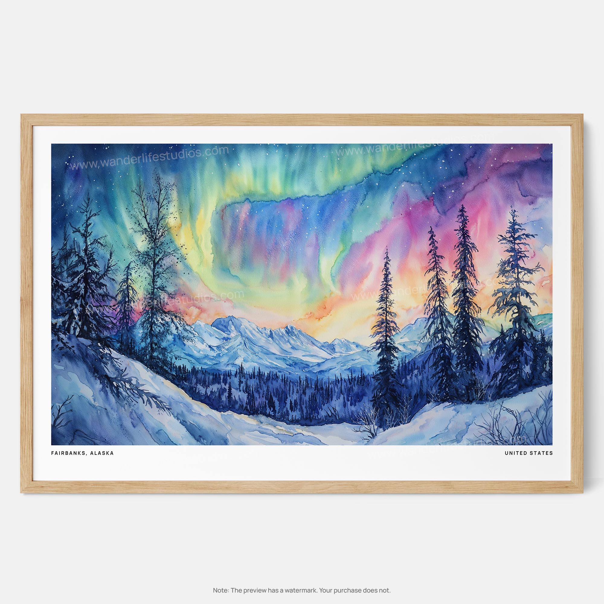 This watercolor art print captures the mesmerizing display of the Northern Lights over the rugged landscape of Fairbanks, Alaska. The swirling hues of greens, purples, and blues dance across the sky, complemented by the serene silhouettes of towering mountains and evergreens below.