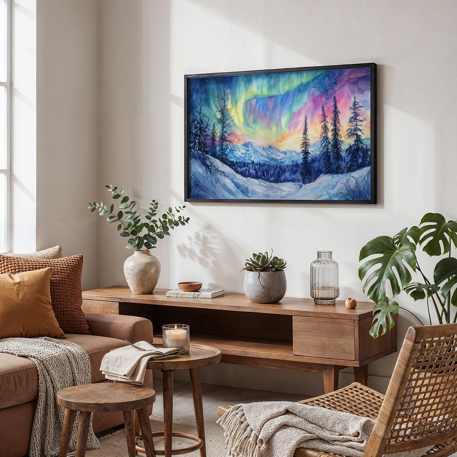 Transform your space with this Fairbanks, Alaska digital download wall art featuring the enchanting Northern Lights. The vibrant colors and serene winter landscape are easy to print and display, bringing nature’s beauty into your home instantly.