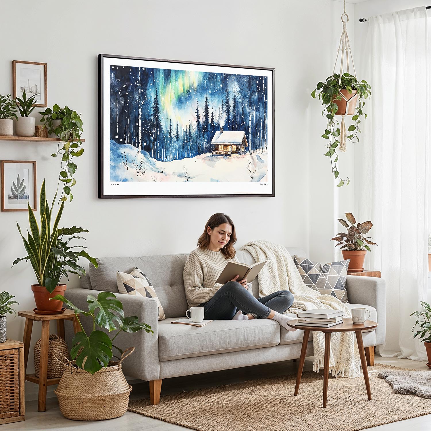 Experience the magic of Finland’s Lapland through this watercolor canvas print. It captures the mesmerizing dance of the aurora borealis above a cozy cabin nestled in a snowy forest. The soft blues and whites create an inviting atmosphere that brings a touch of winter wonder into your space.