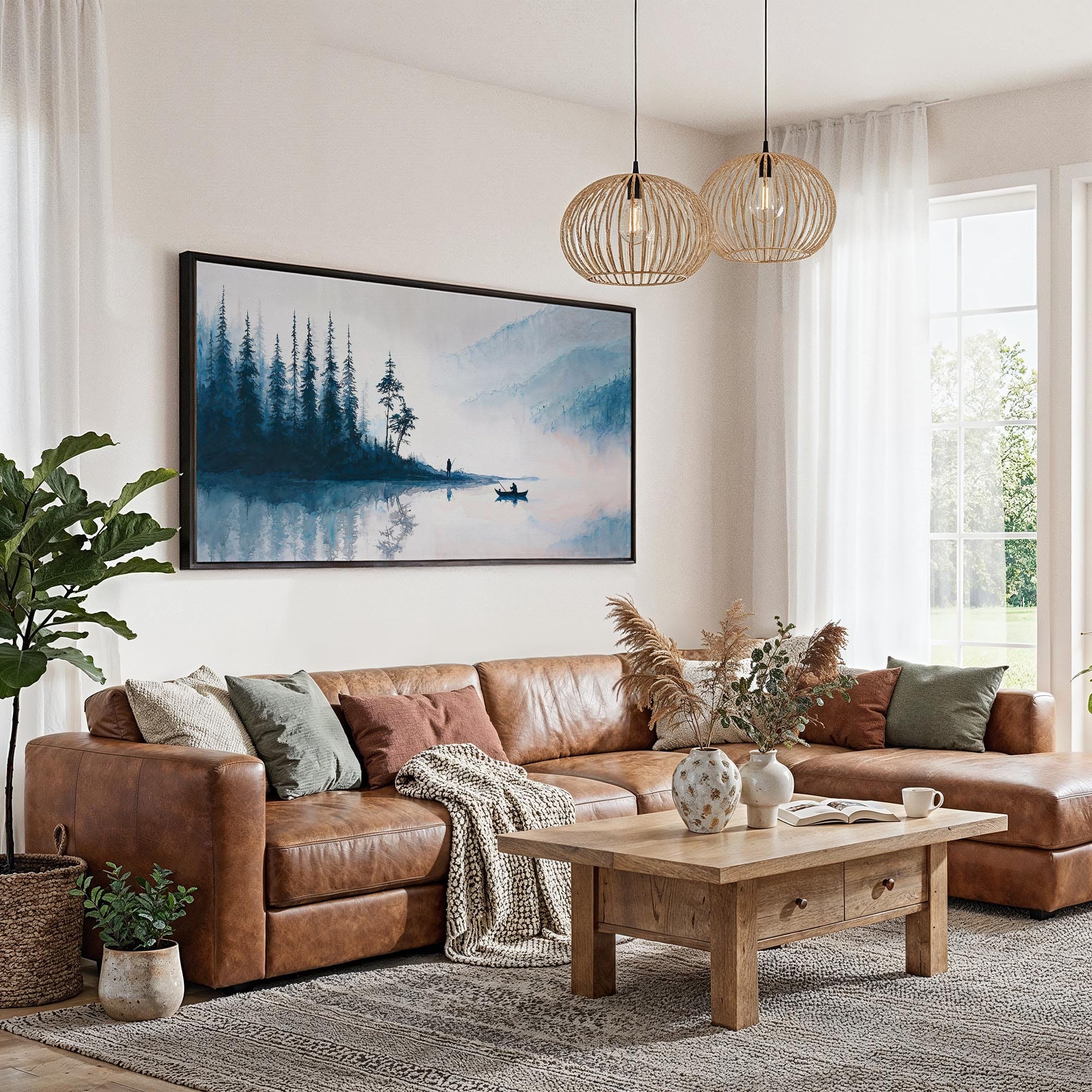 Bring the tranquility of a misty morning fishing scene into your space with this panorama canvas print. Its wide format perfectly captures the serene waters and towering trees, making it a thoughtful addition to living rooms or calm office environments.