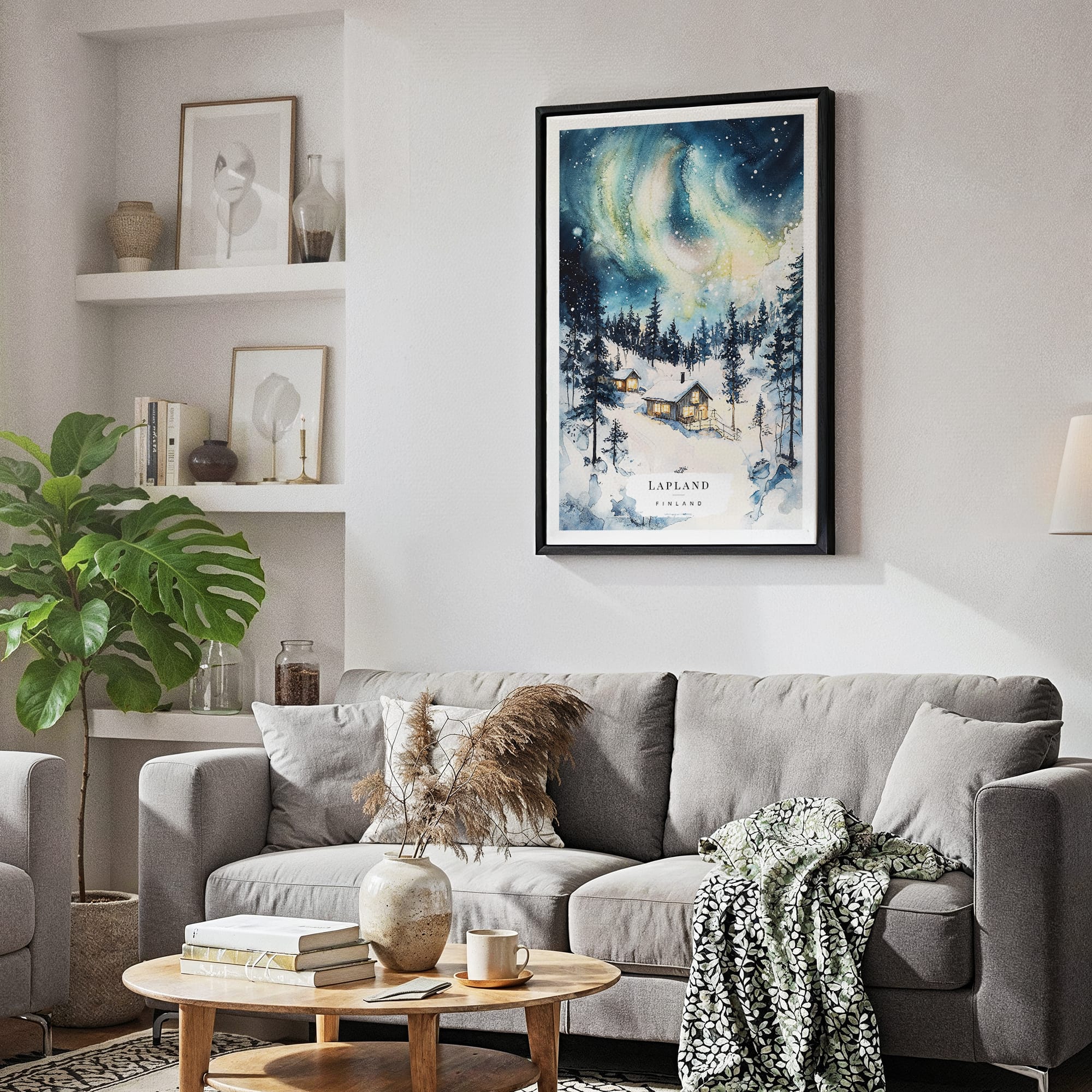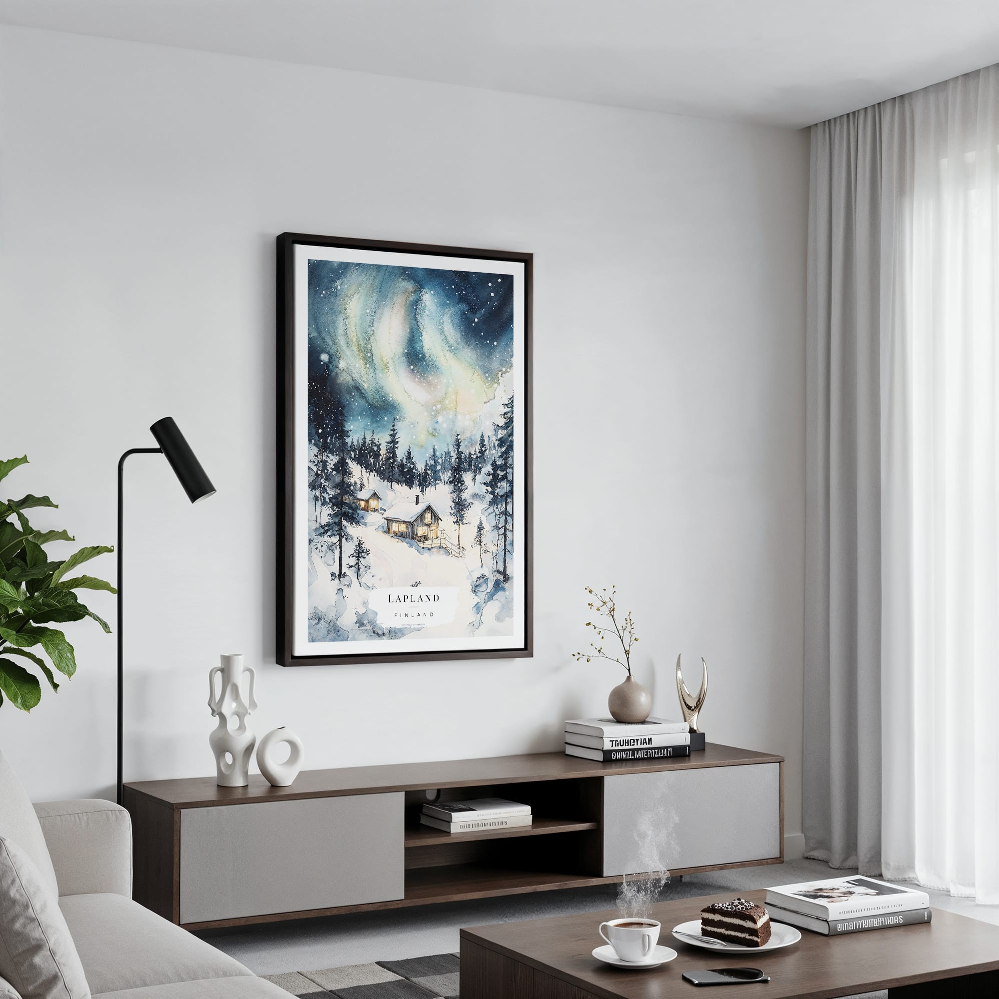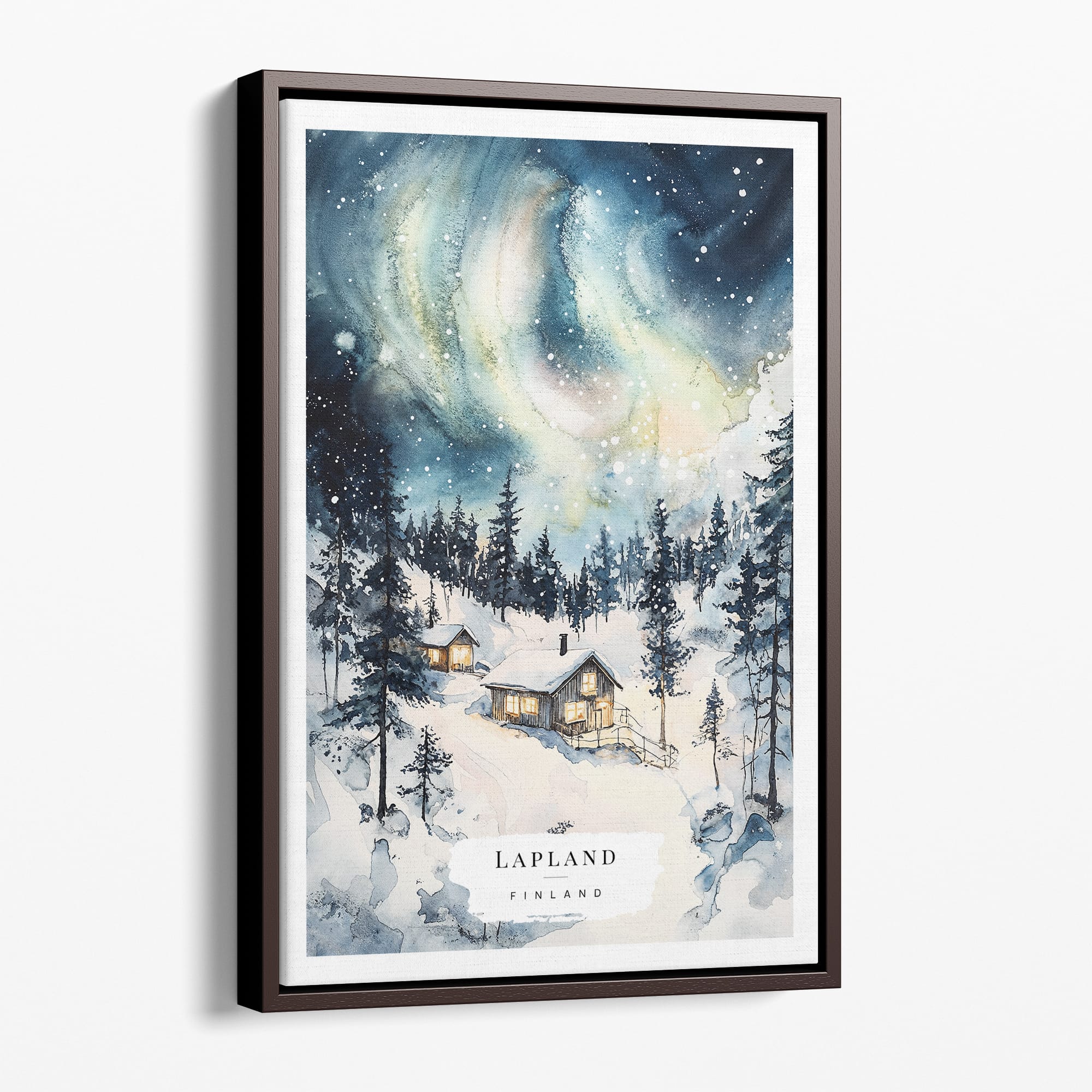 Framed Aurora Lapland Finland Watercolor Canvas Print – Winter Landscape Wall Art