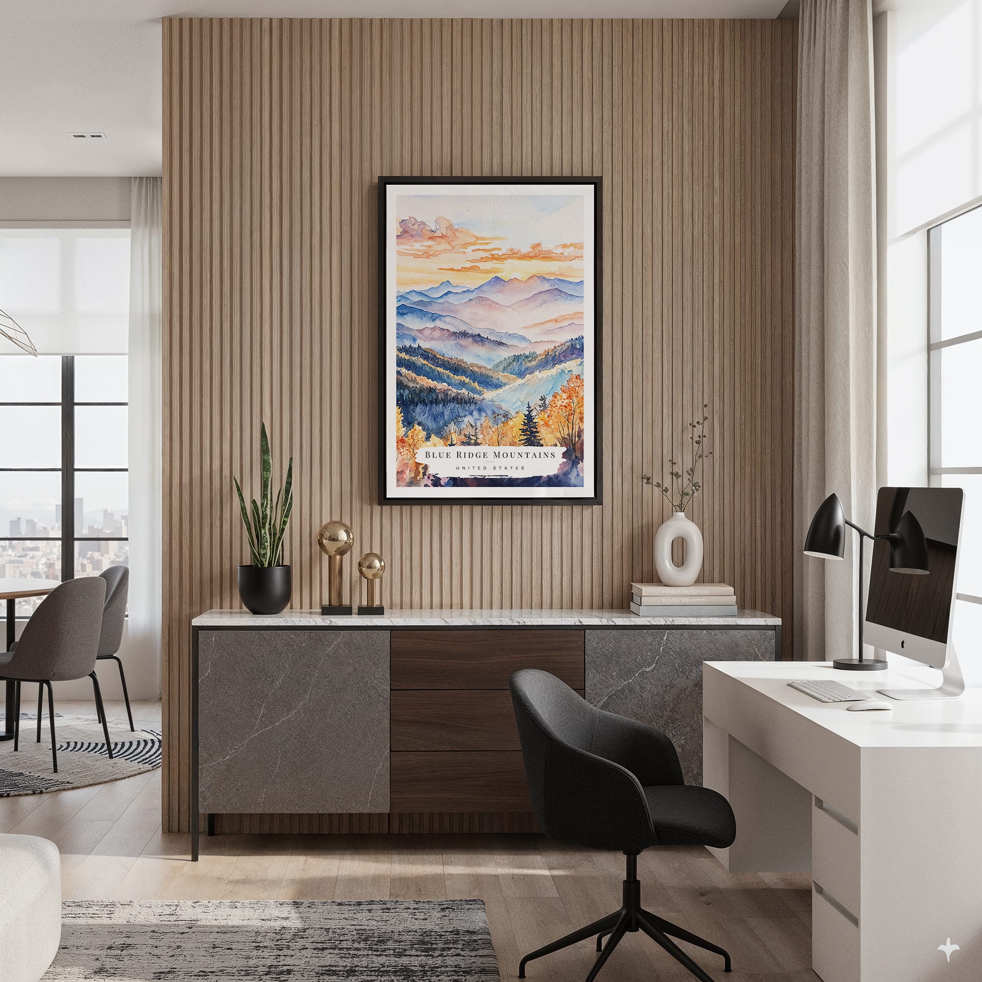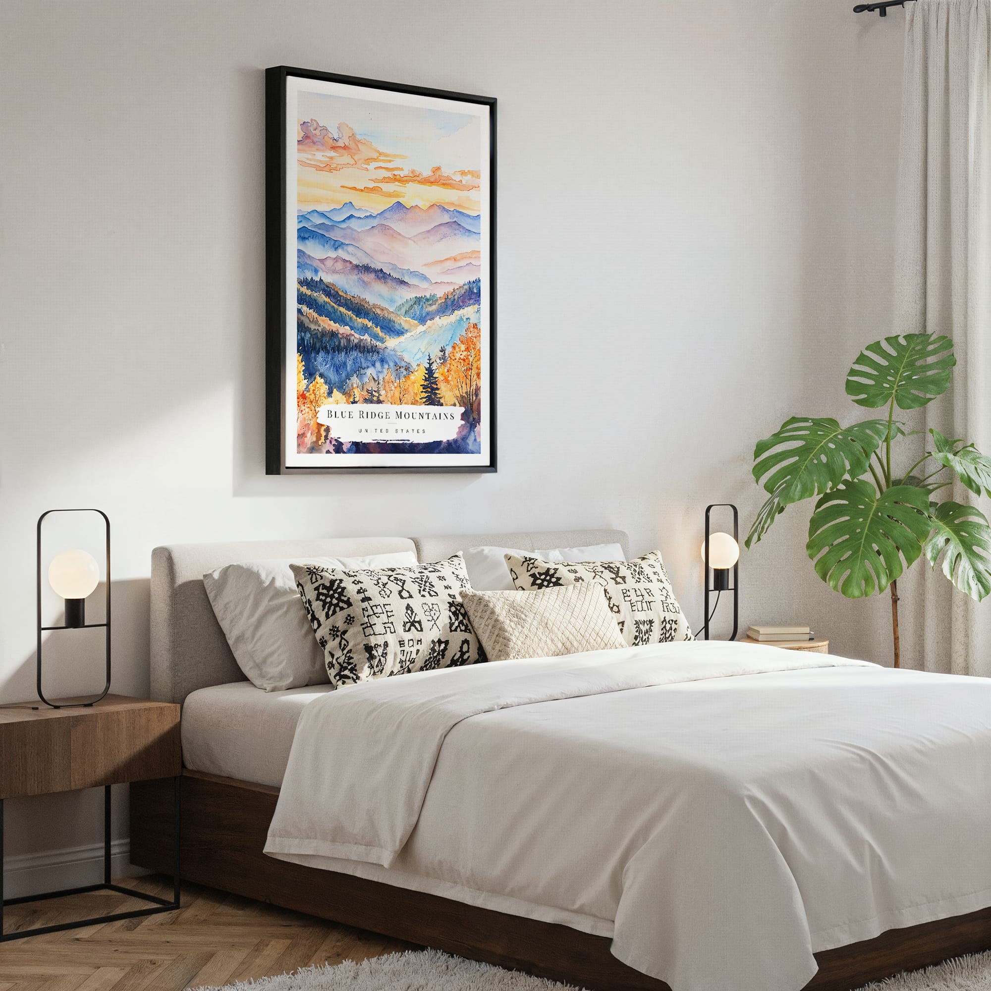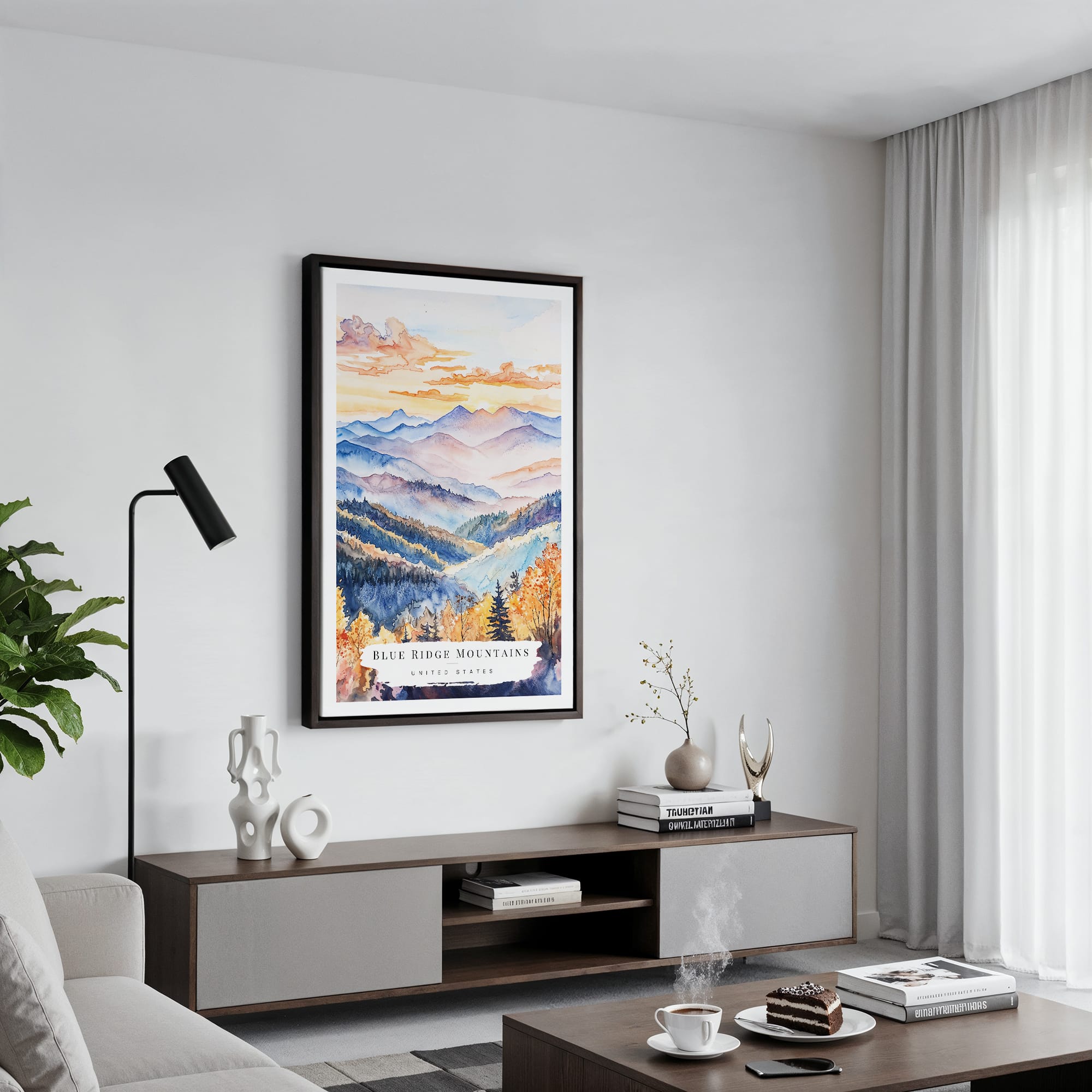 Framed Blue Ridge Mountains Watercolor Canvas Print – Nature Inspired Wall Art
