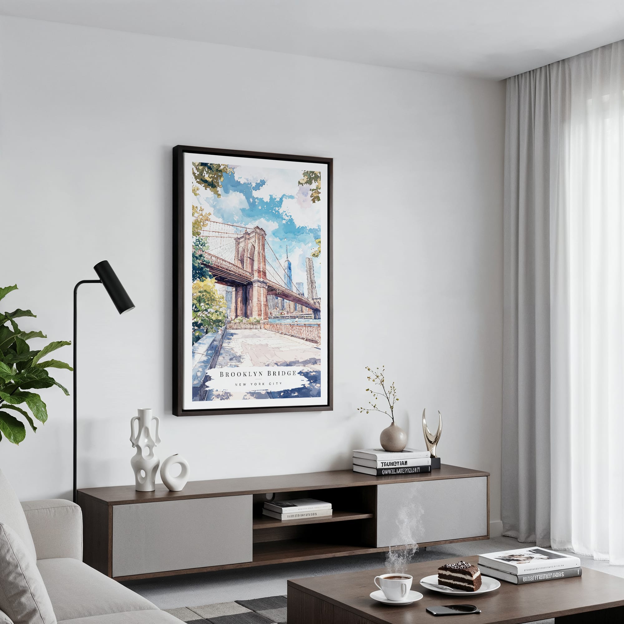 Framed Brooklyn Bridge Watercolor Canvas Print – Charming New York City Wall Art