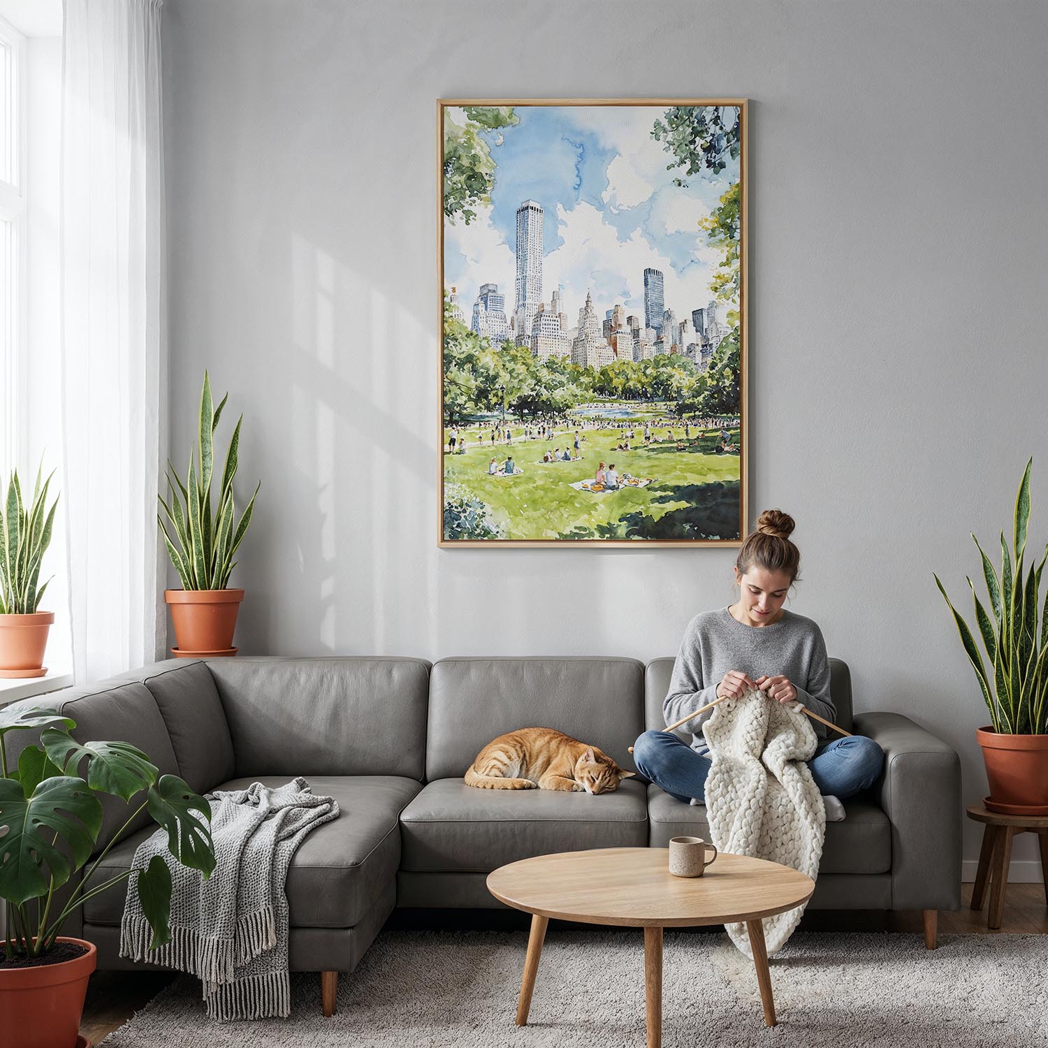 Delight in the lively atmosphere of Central Park, where greenery meets the vibrant skyline of New York City. This watercolor print beautifully showcases lush lawns and city towers under a bright blue sky, evoking the energy of this urban oasis.