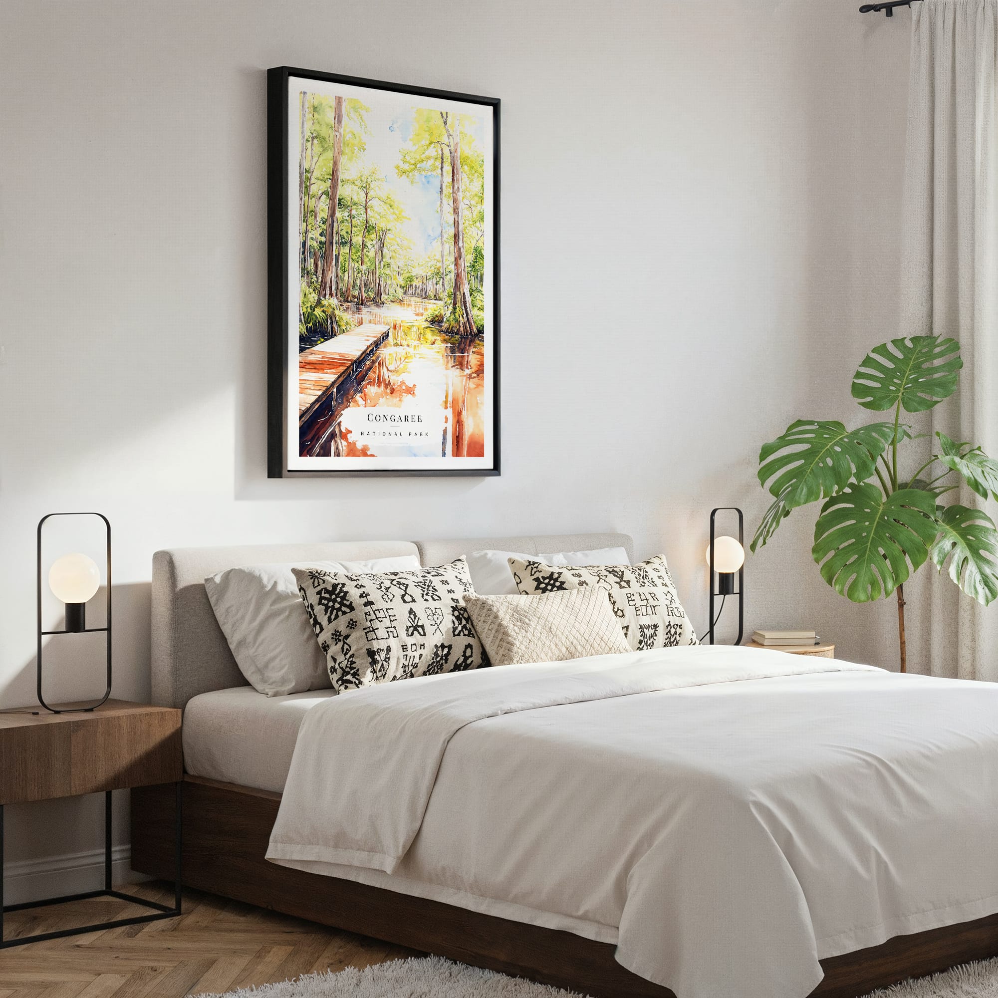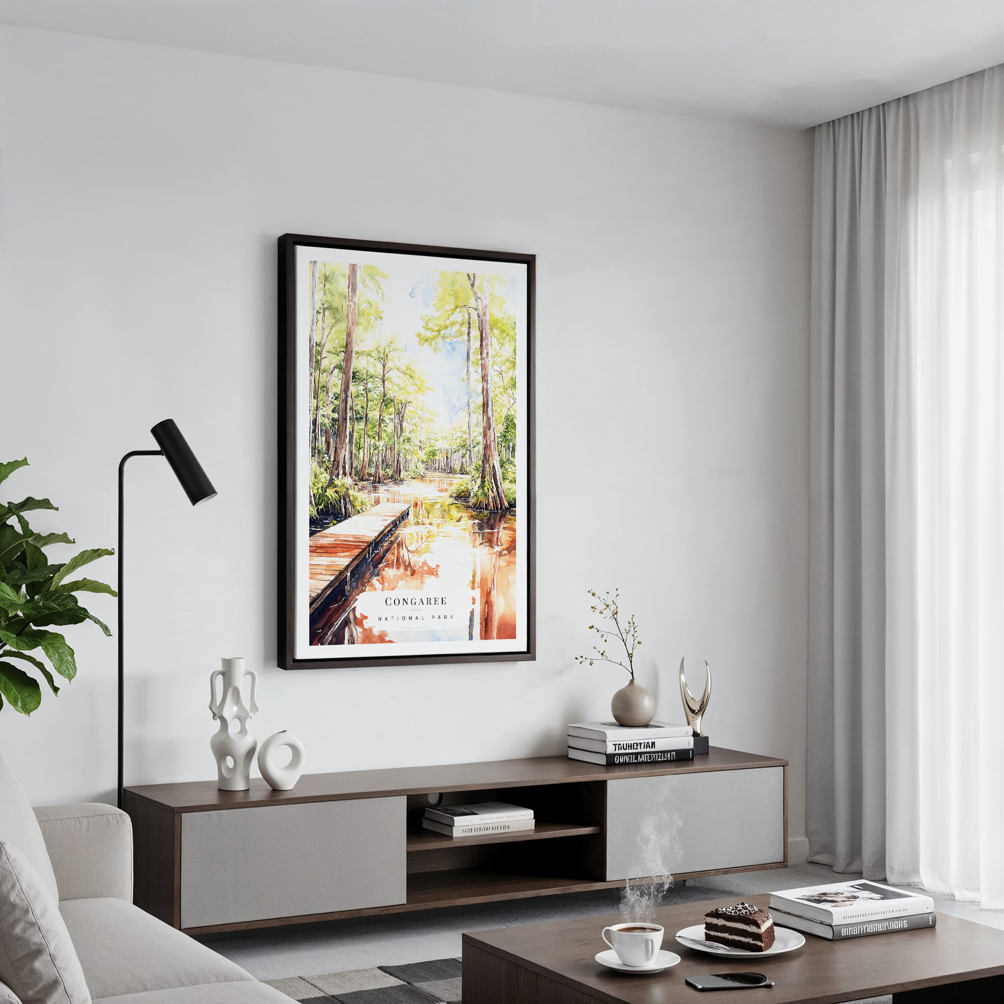 Framed Congaree National Park Watercolor Canvas Print – Lush Green Landscape Wall Art