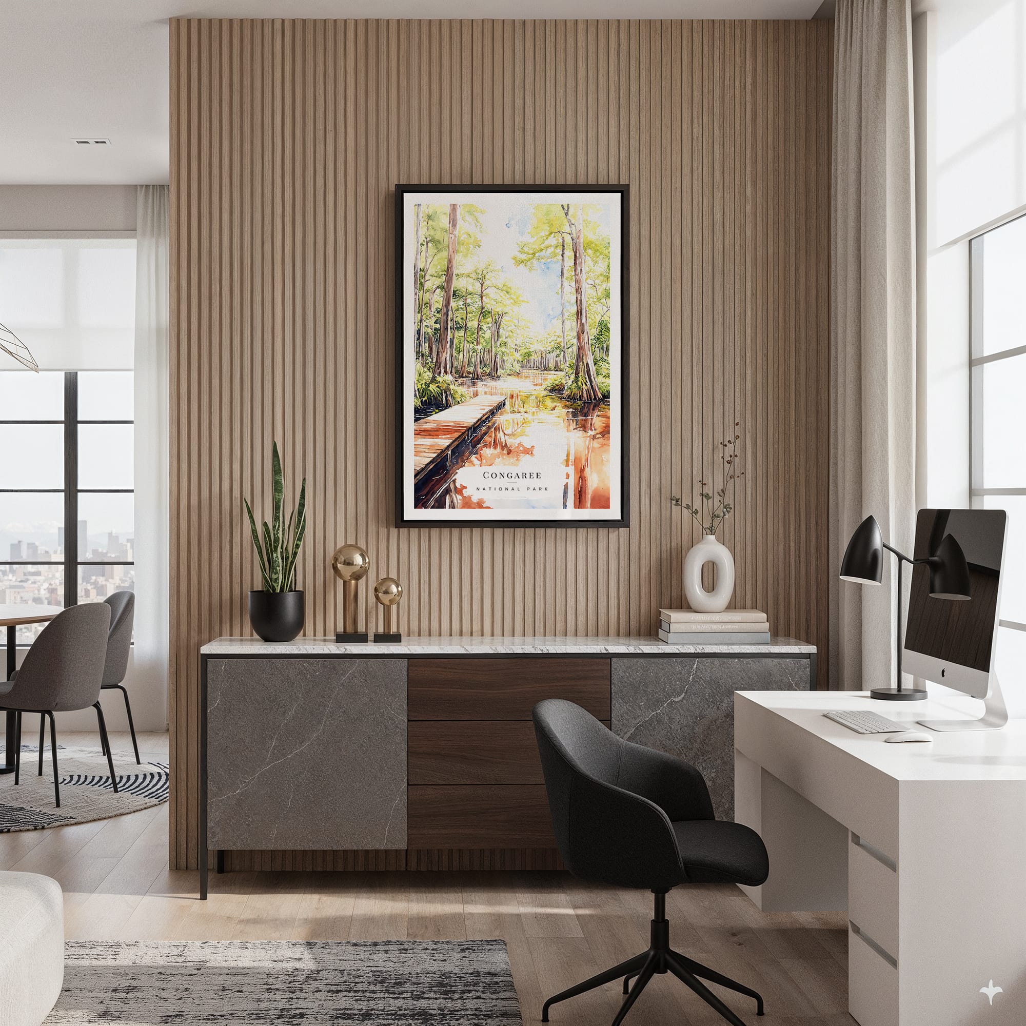 This Congaree National Park canvas art print features vibrant greens and soft water hues that bring nature indoors. It’s an easy addition to living spaces and makes a thoughtful gift for nature enthusiasts.