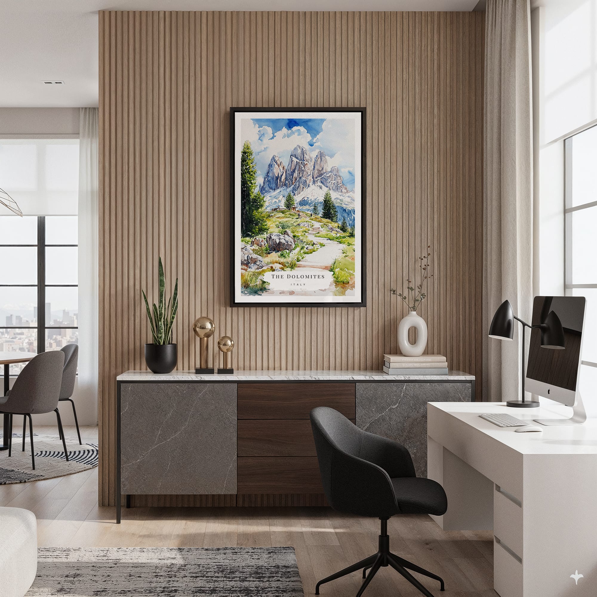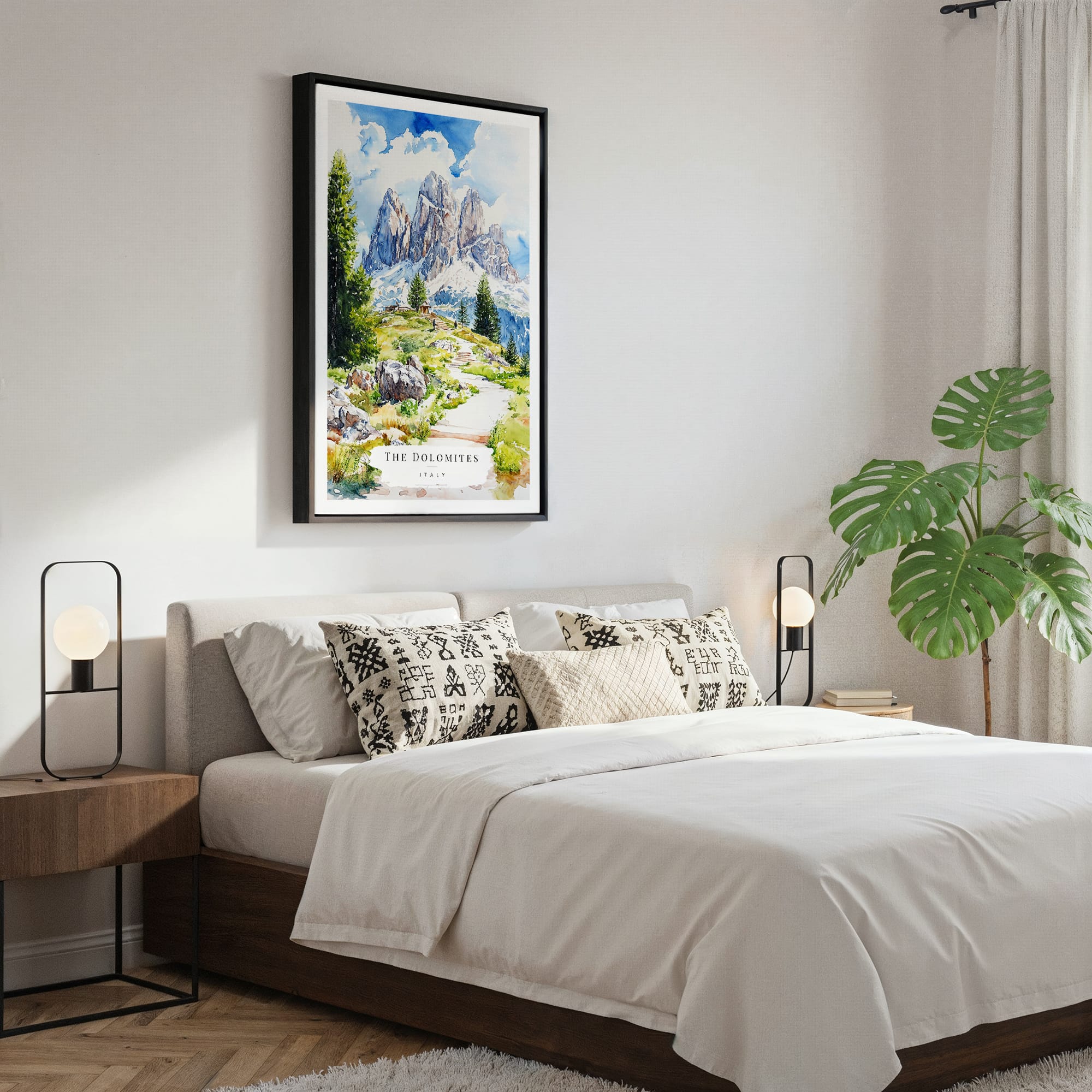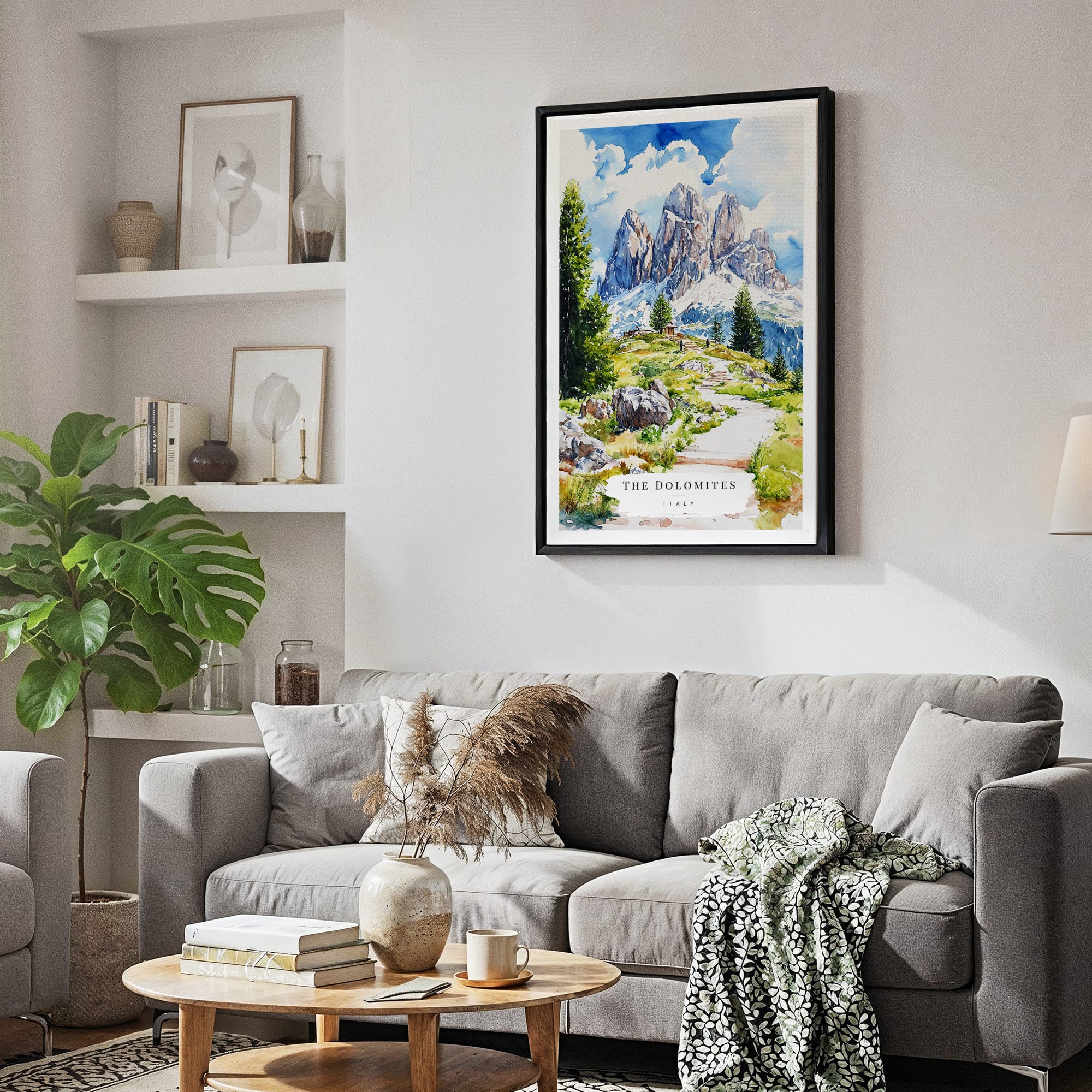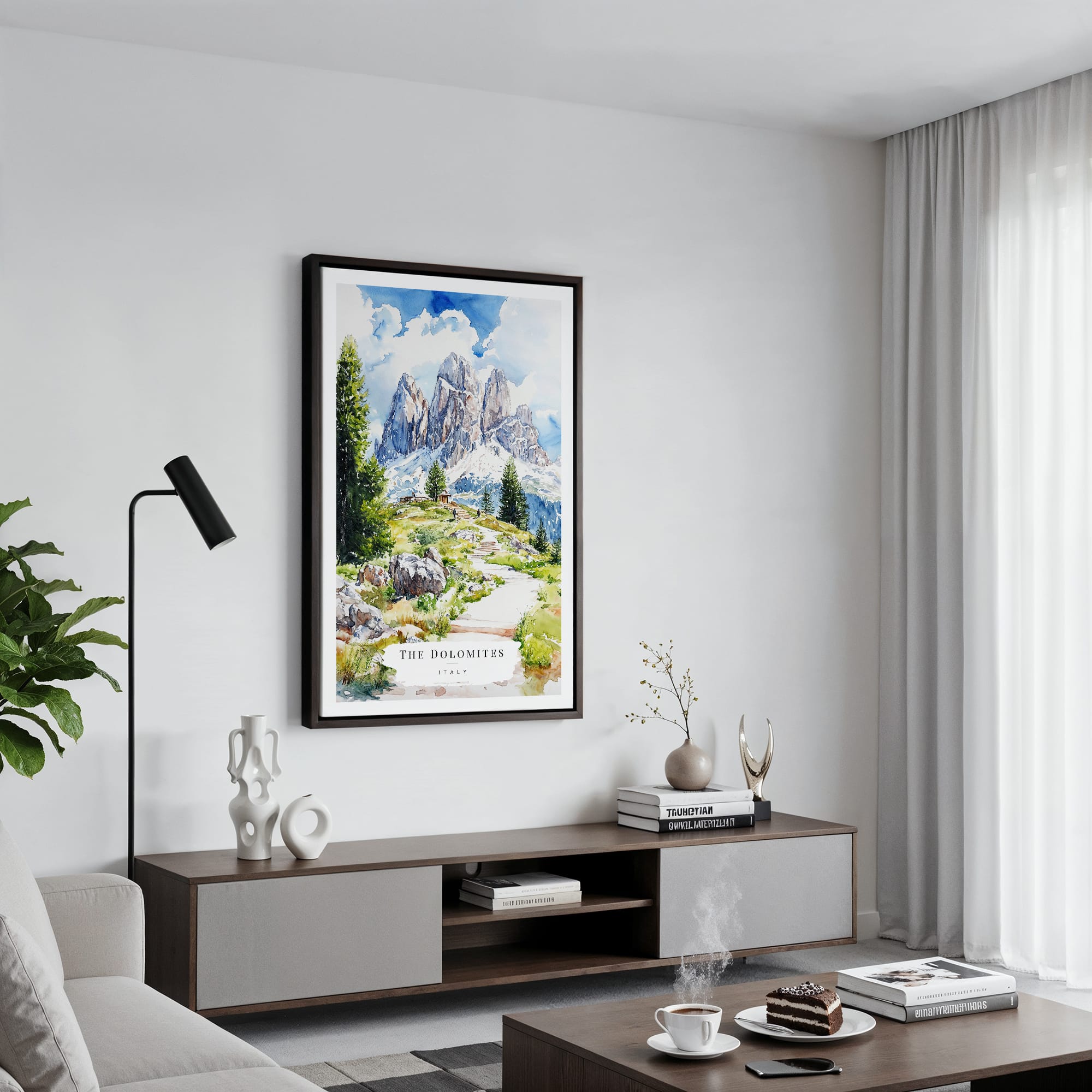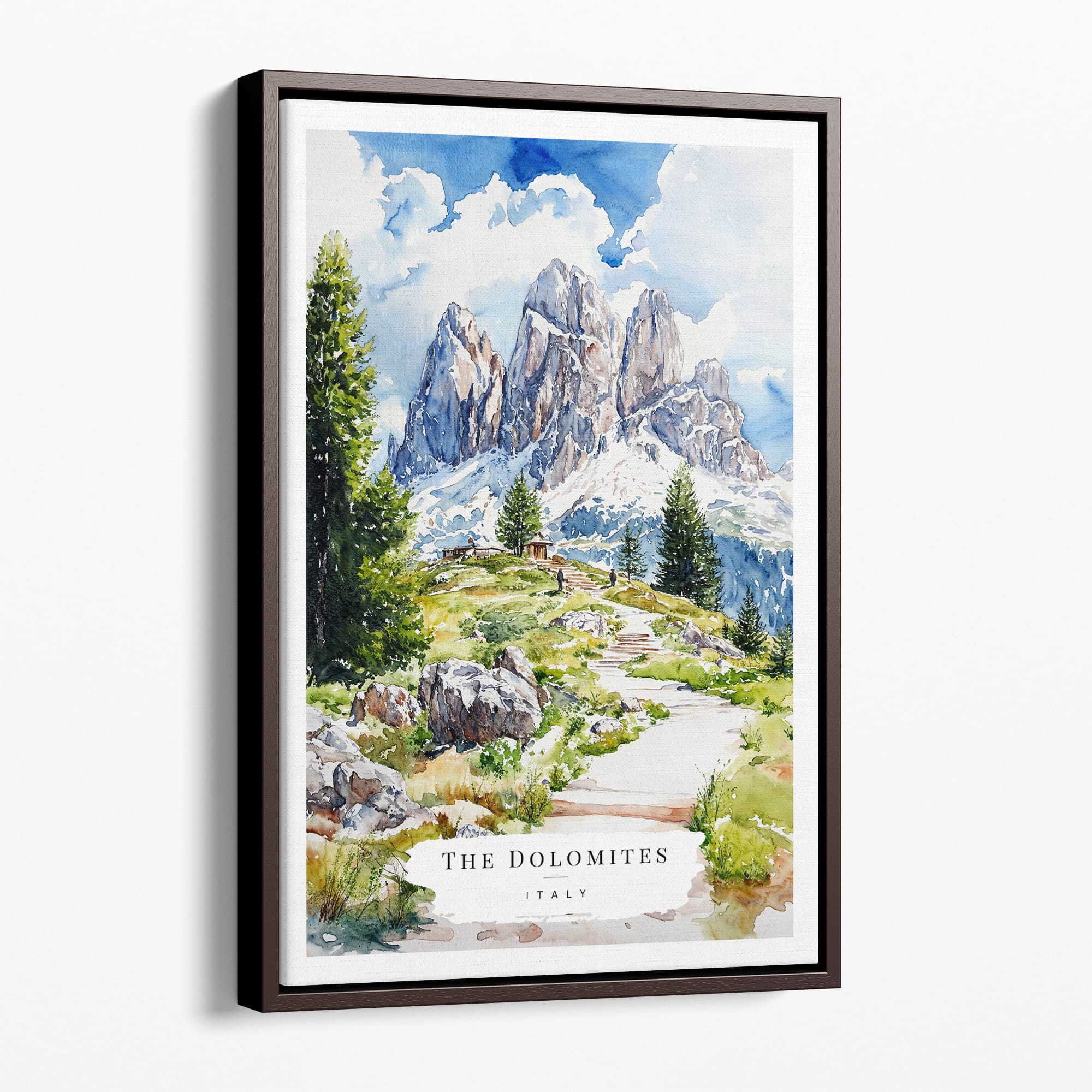 Framed Dolomites Hiking Canvas Print – Scenic Watercolor Artwork for Nature Lovers