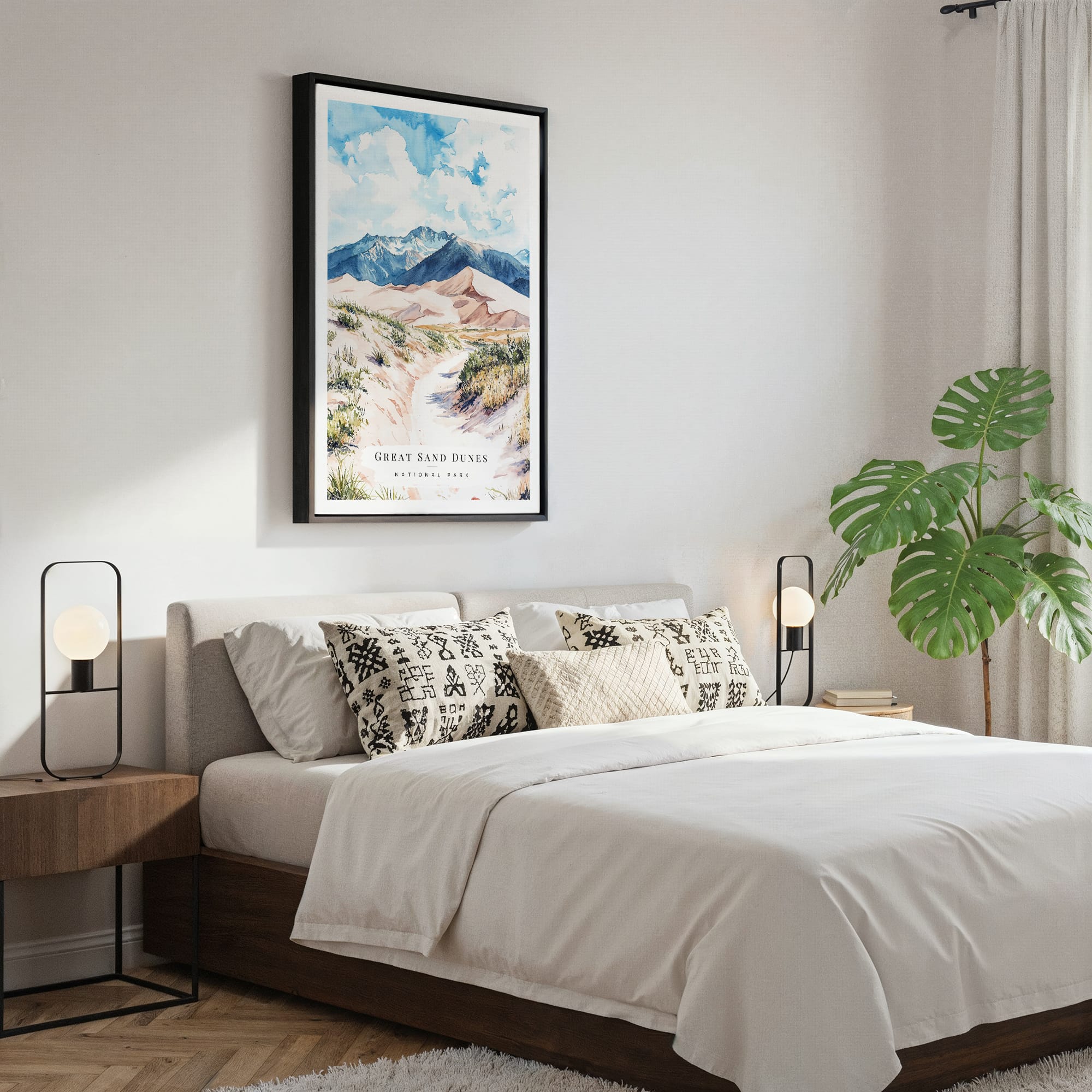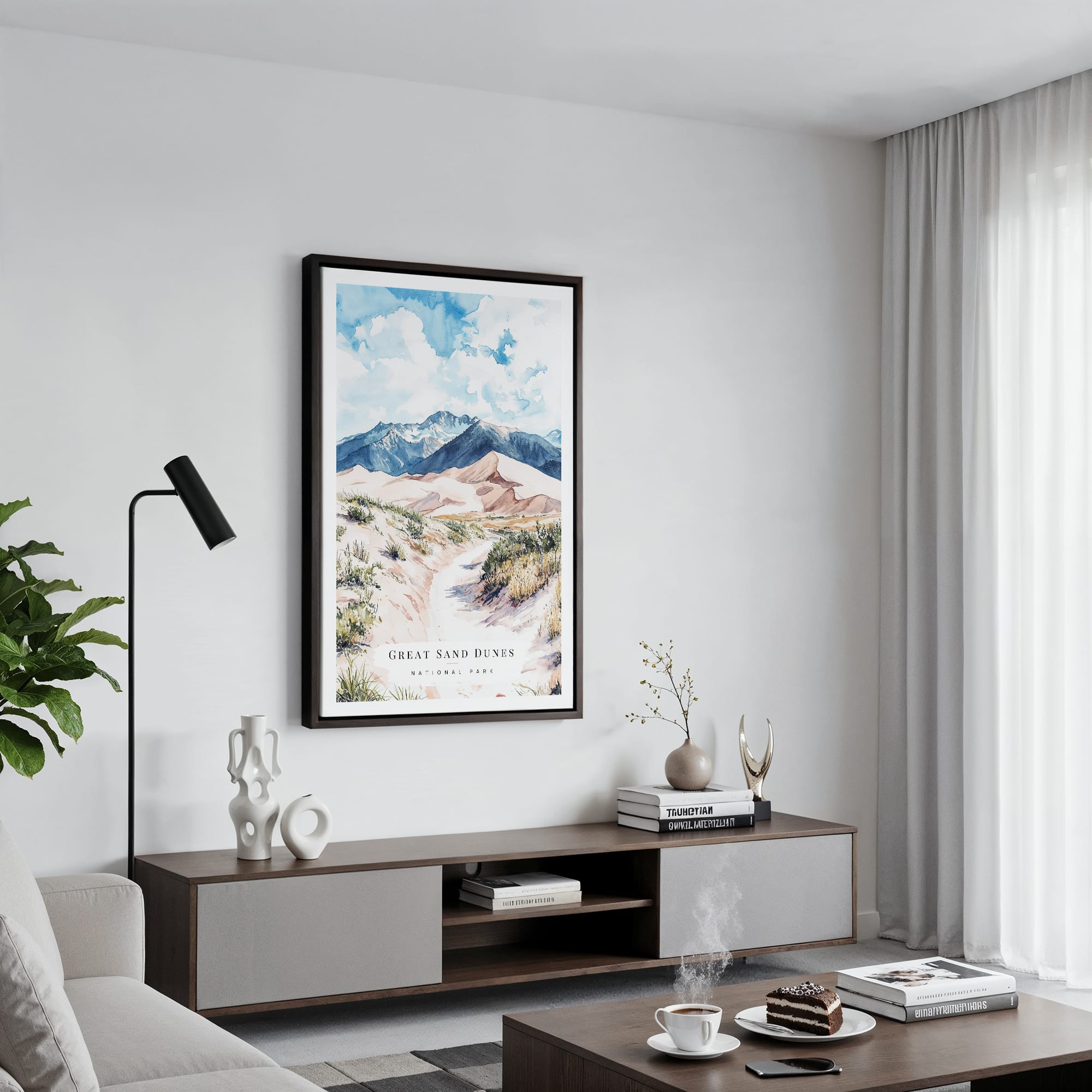 Framed Great Sand Dunes National Park Watercolor Canvas Print – Serene Desert Landscape Art