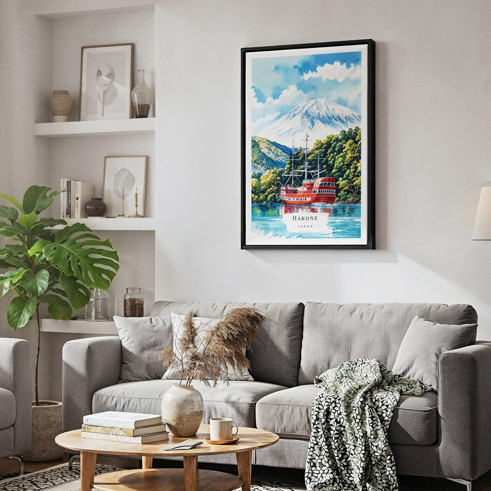 This Hakone canvas art print captures the tranquil scene of Mount Fuji with vibrant blues and greens. It brings a refreshing touch to your space, making it a lovely addition to any room or a thoughtful gift for nature lovers.