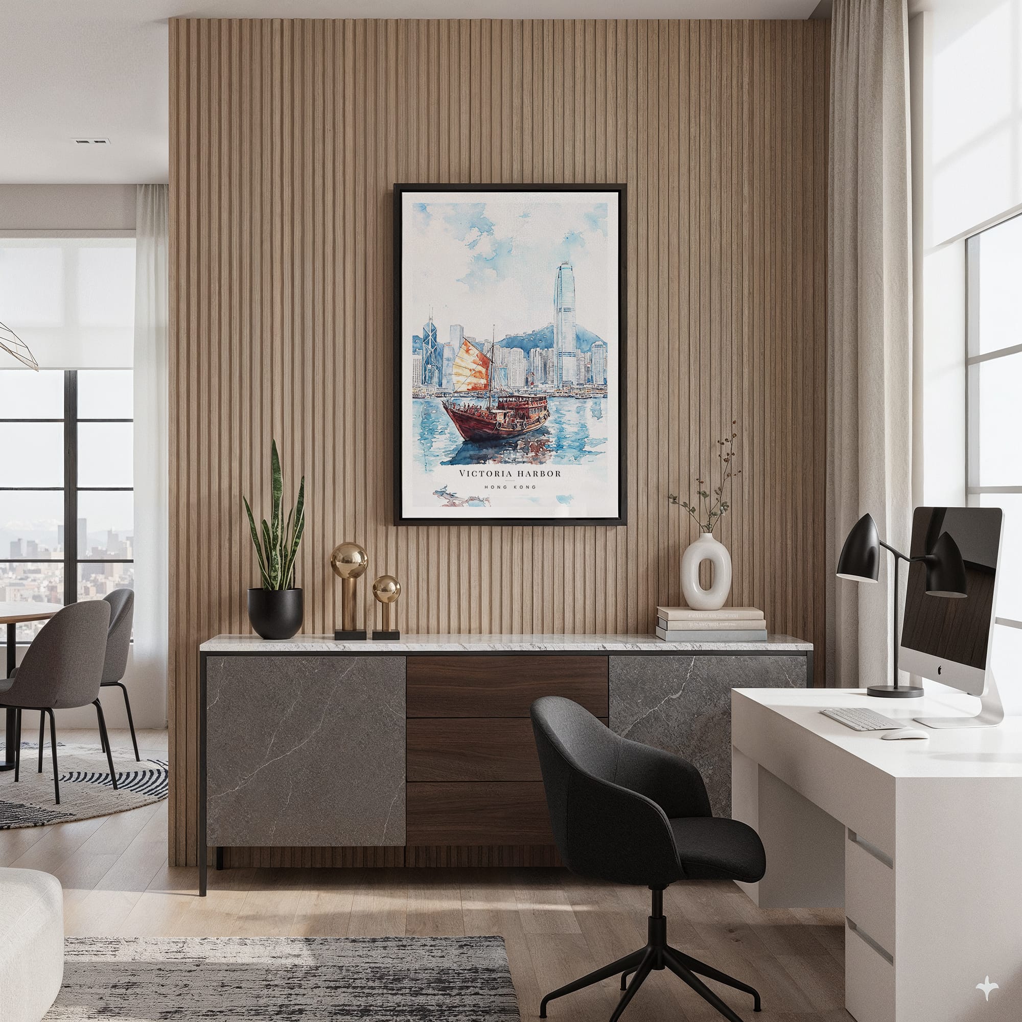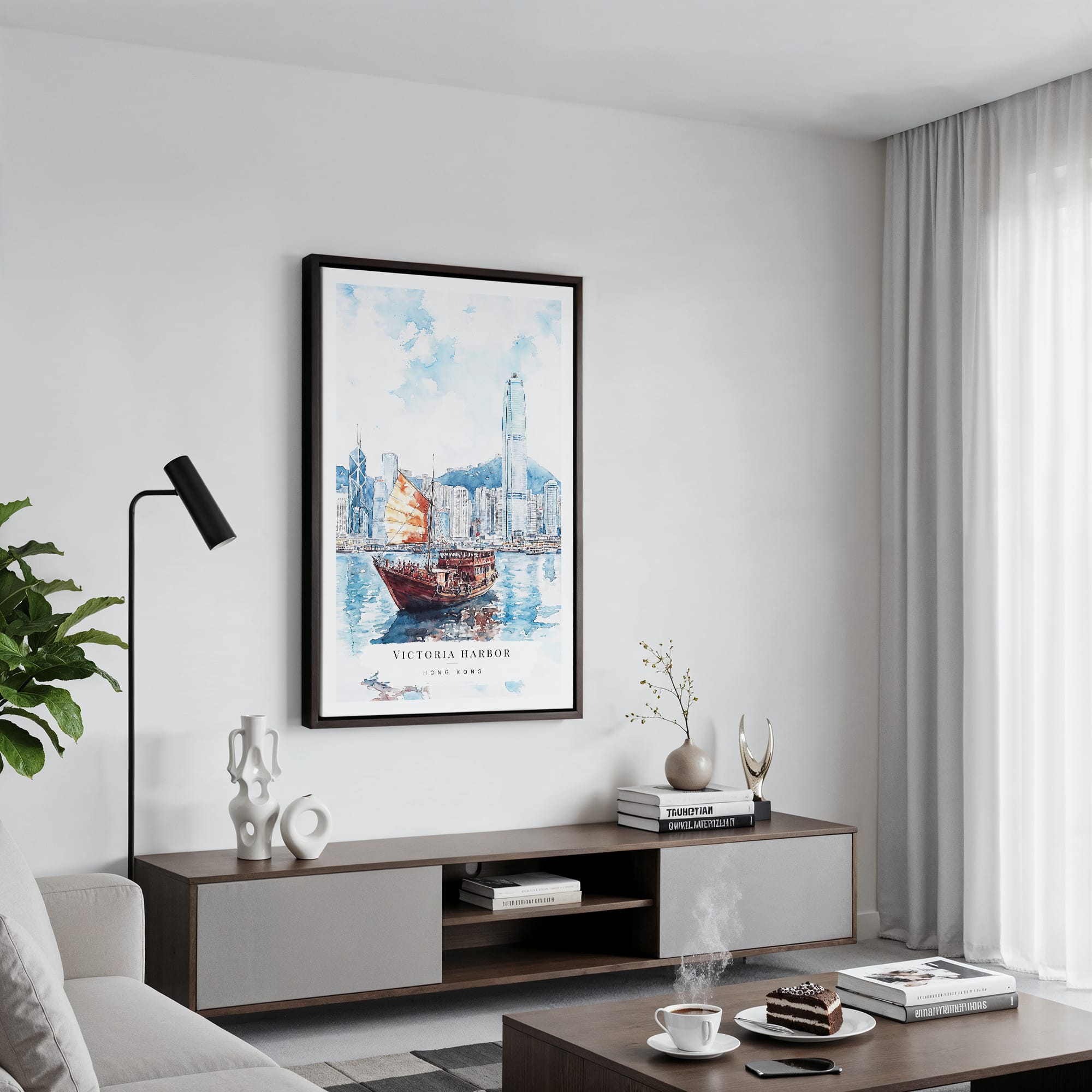 Framed Hong Kong Watercolor Canvas Print – Vibrant Victoria Harbor Artwork