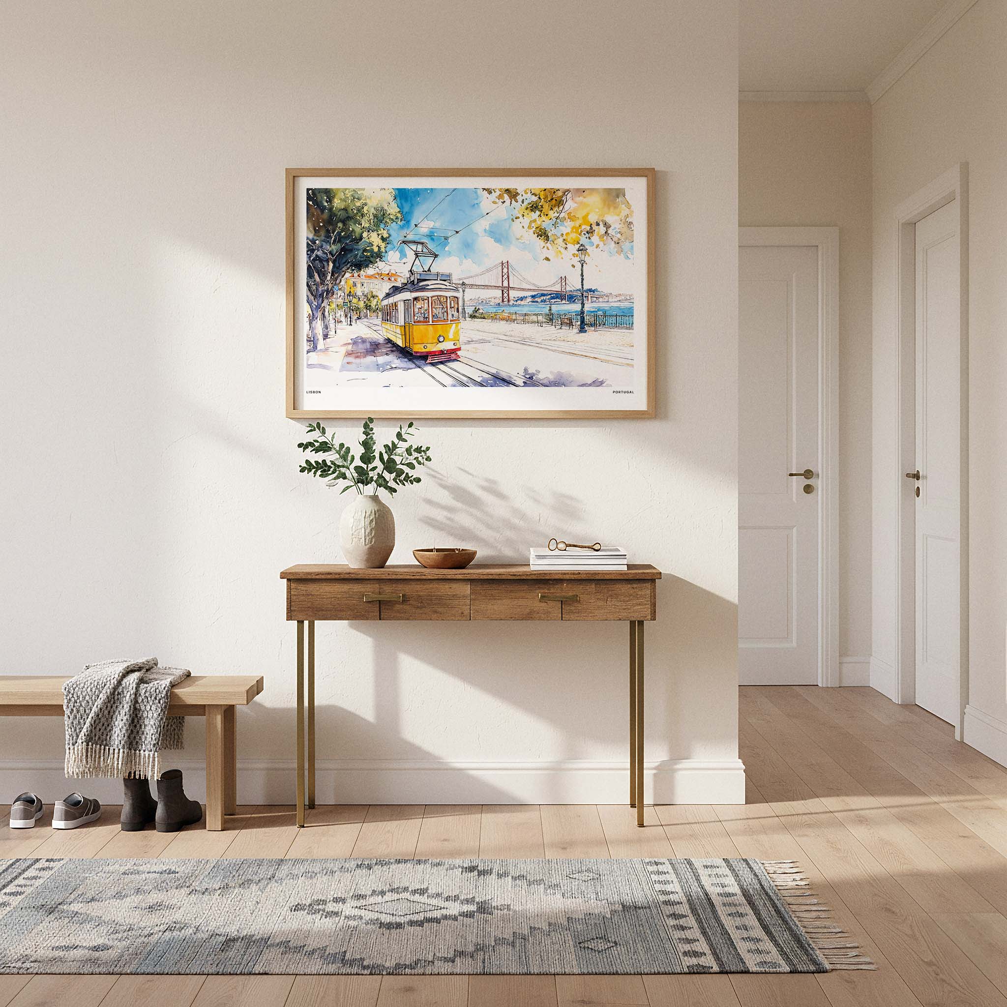 Framed Lisbon Portugal Yellow Tram Watercolor Art Print – Scenic Cityscape Wall Decor