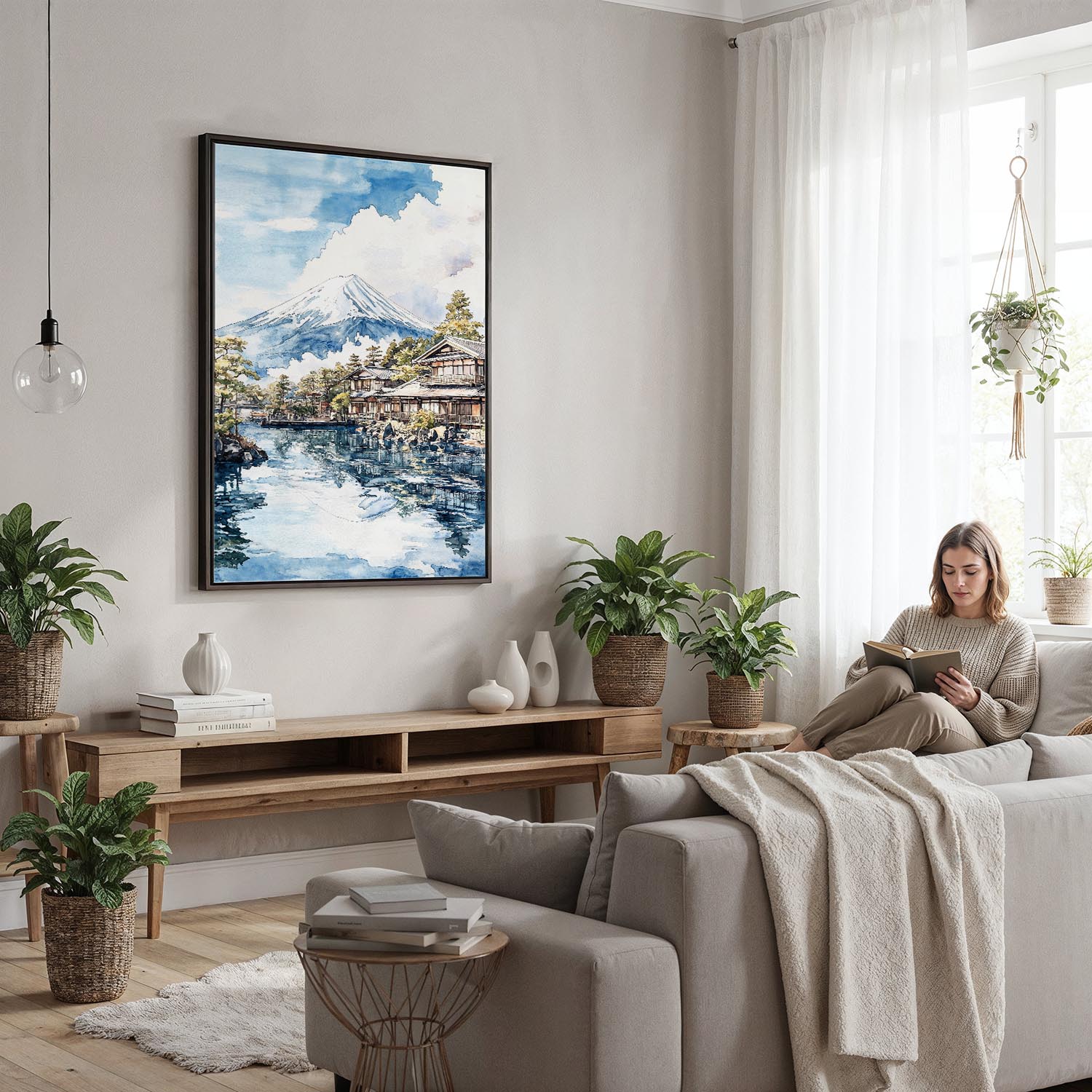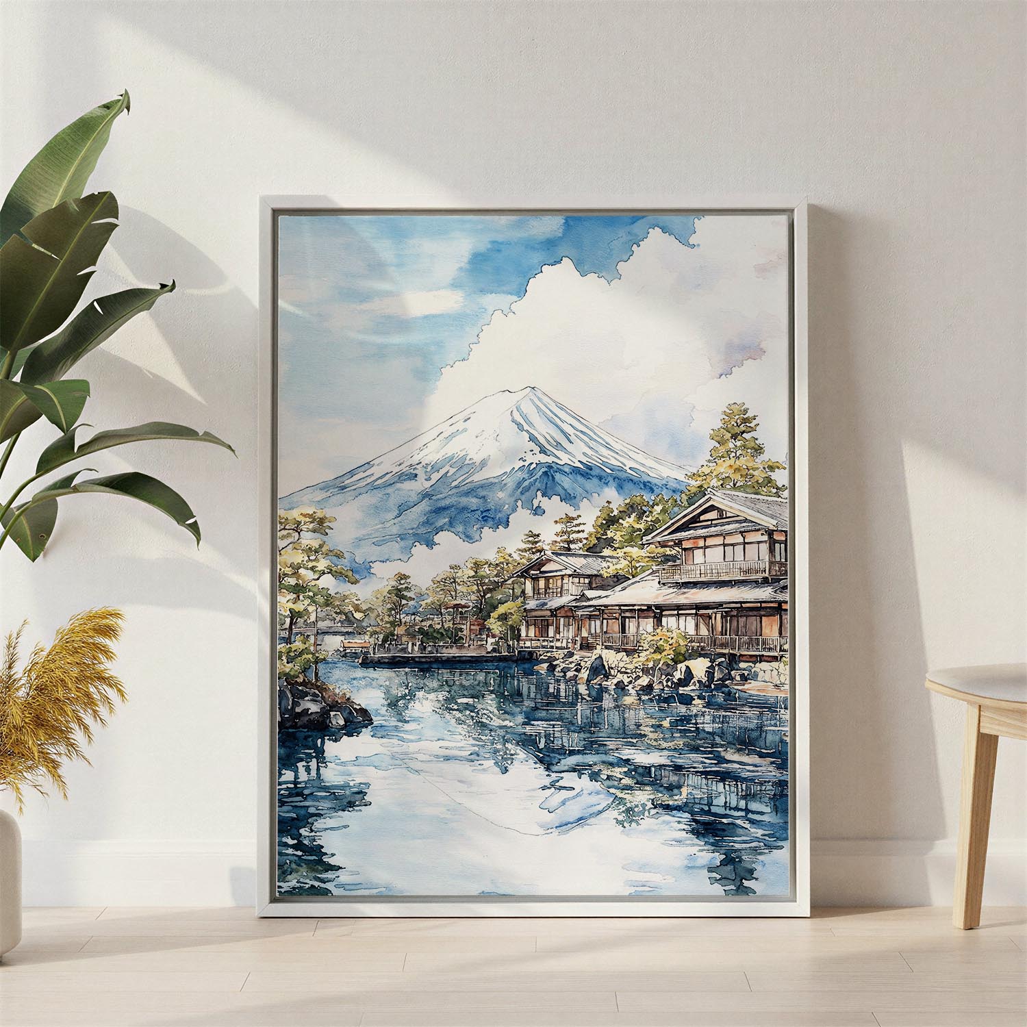 Transform your space with this watercolor canvas print of Mount Fuji. Featuring serene reflections and traditional homes, it’s an elegant choice for living rooms or offices, and comes ready to hang.
