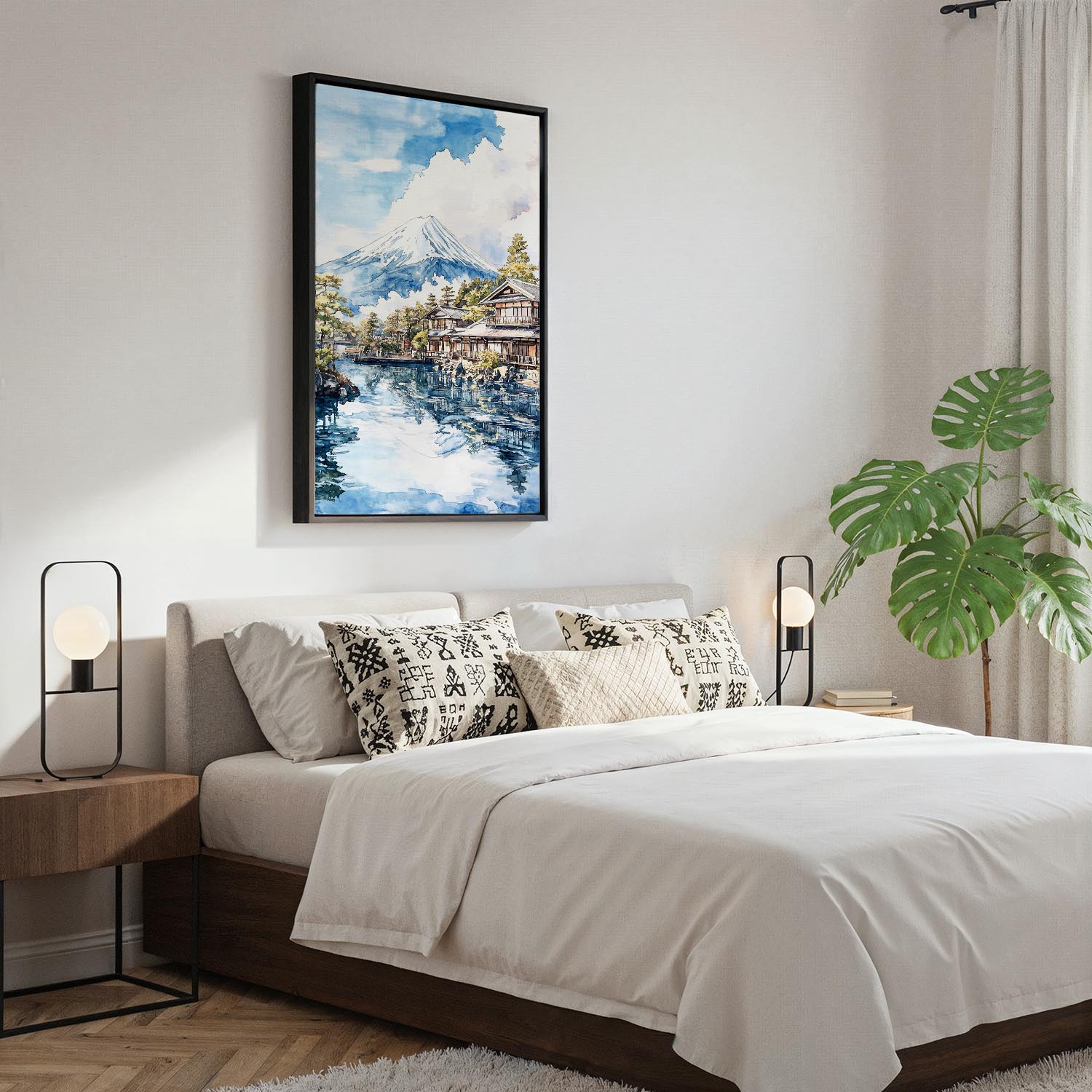 Explore the beauty of Japan with this captivating watercolor print of Mount Fuji. The artwork captures tranquil reflections and charming traditional architecture, evoking the peaceful essence of this iconic location. Available in various finishes, including unframed and floater frame, it’s printed on high-quality hand-stretched canvas using fade-resistant inks.