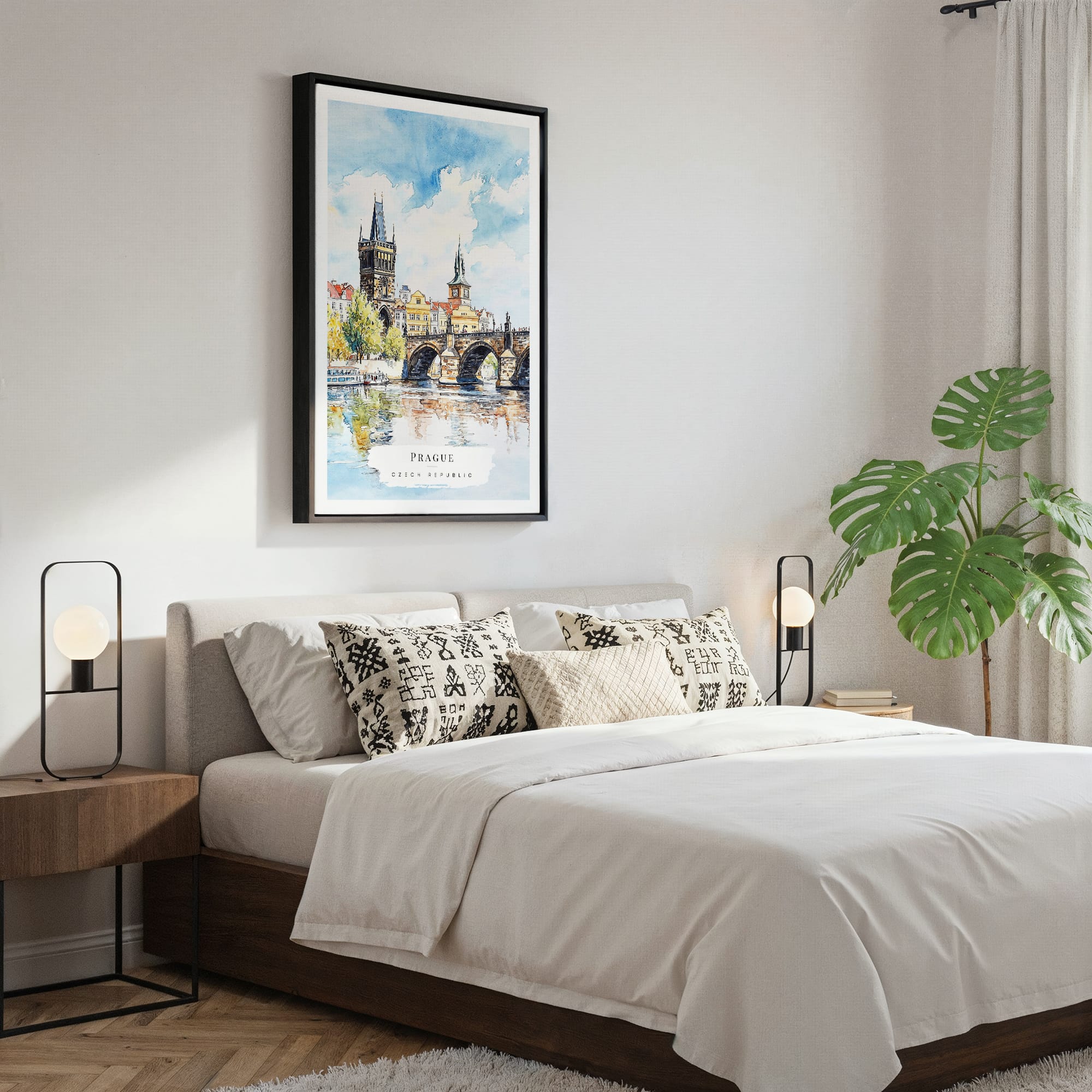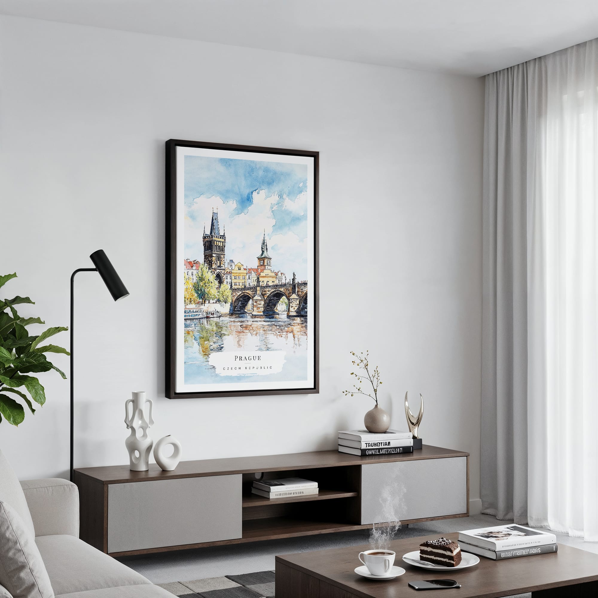 Framed Prague Charles Bridge Watercolor Canvas Print – Timeless Cityscape Wall Art