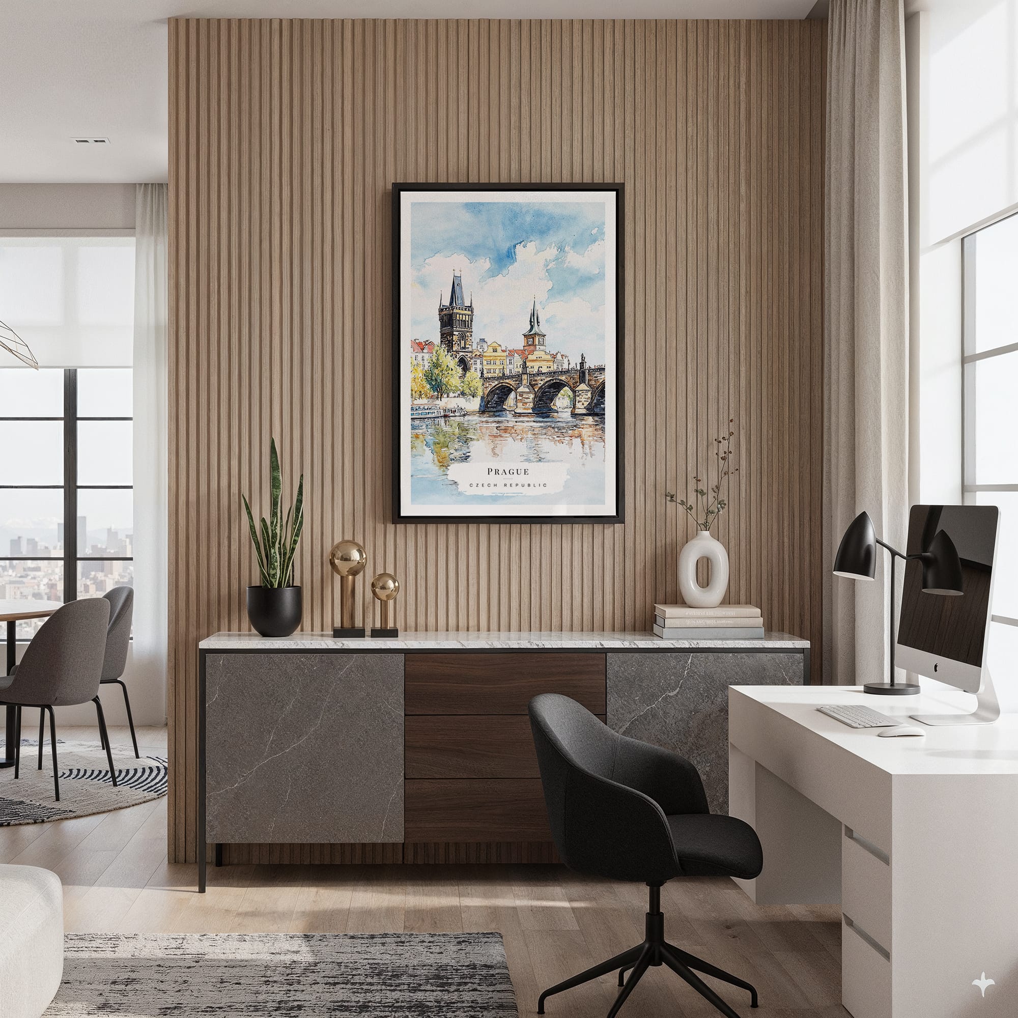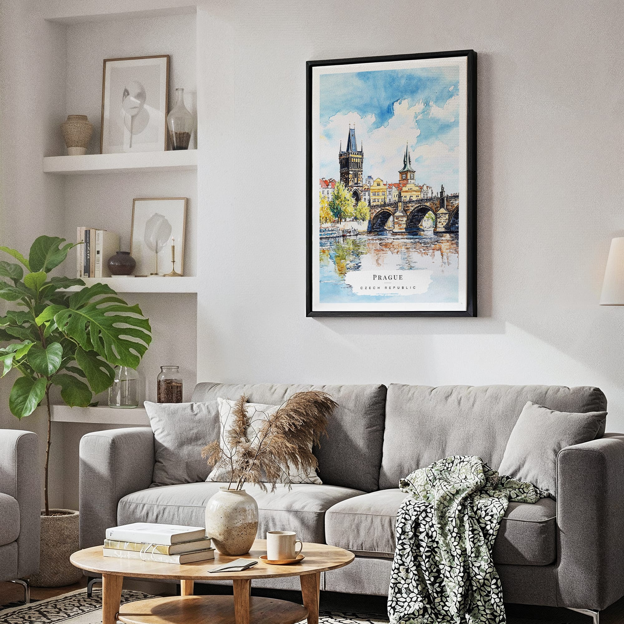 This watercolor print captures the iconic Charles Bridge in Prague, showcasing its historic towers and serene reflections in the river. The calming colors and delicate details create a relaxed atmosphere in any room. Crafted on high-quality canvas with fade-resistant inks, it arrives ready to hang. Ideal for living rooms, offices, or as a delightful addition to a travel enthusiast’s collection, it’s a wonderful way to enjoy a glimpse of this beautiful city every day.
