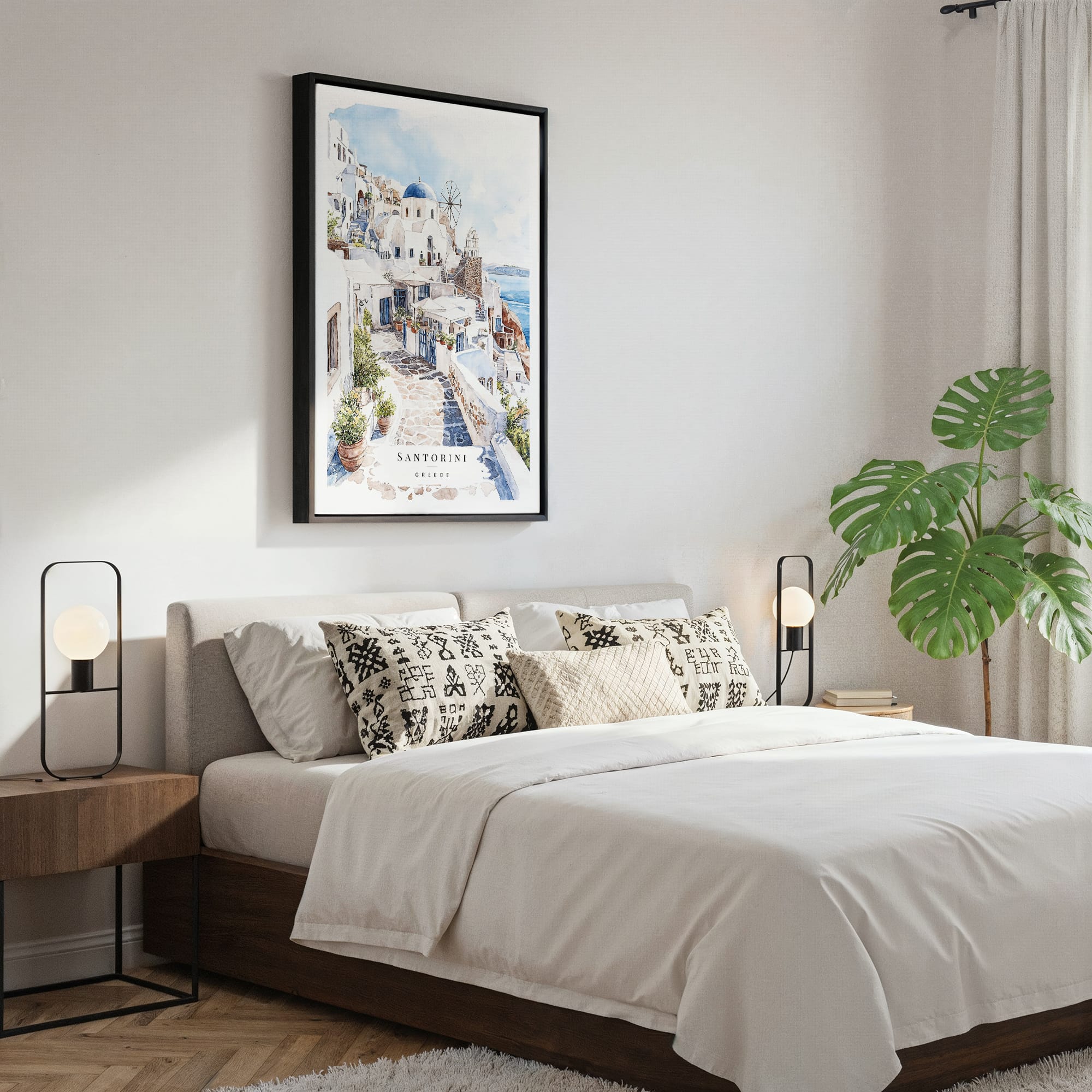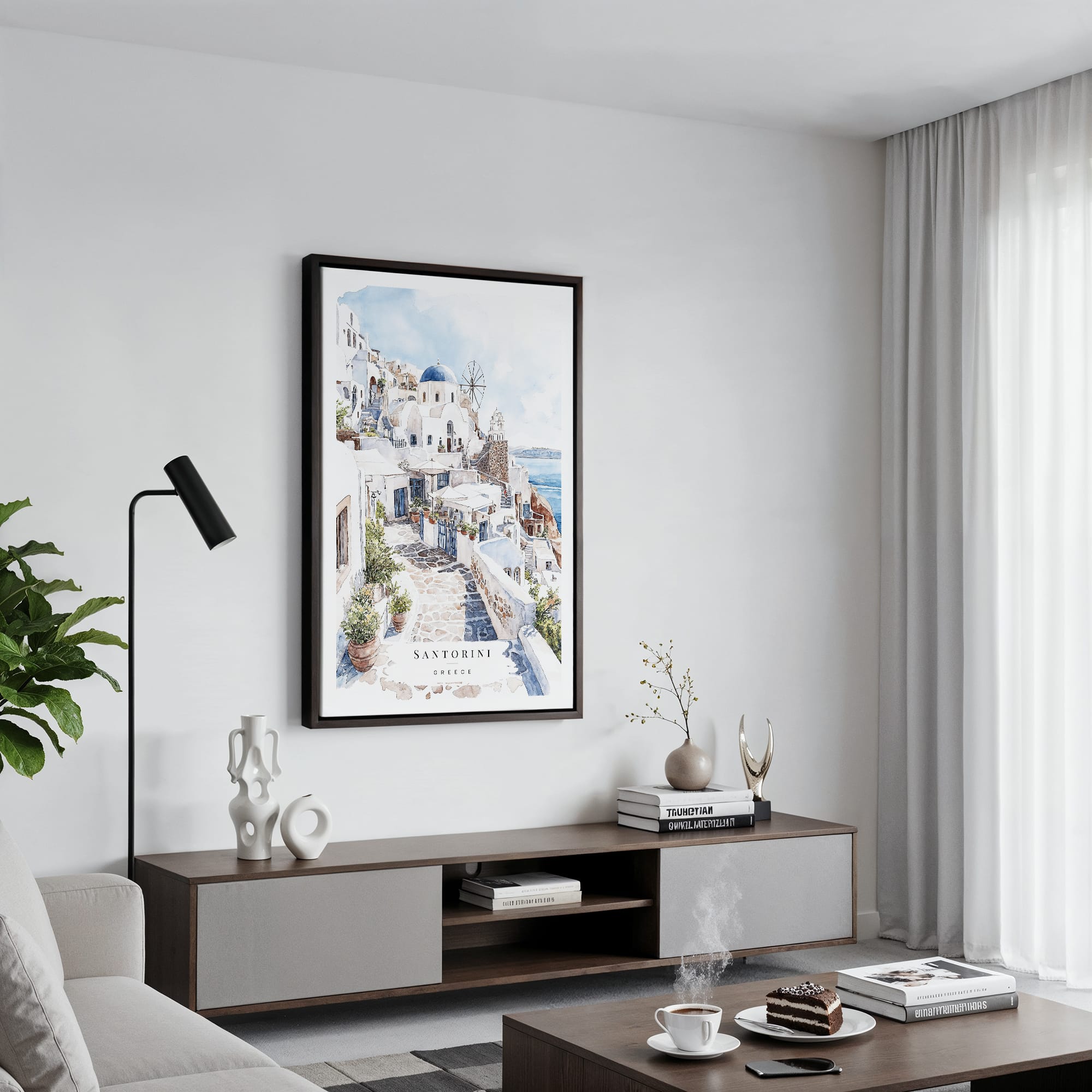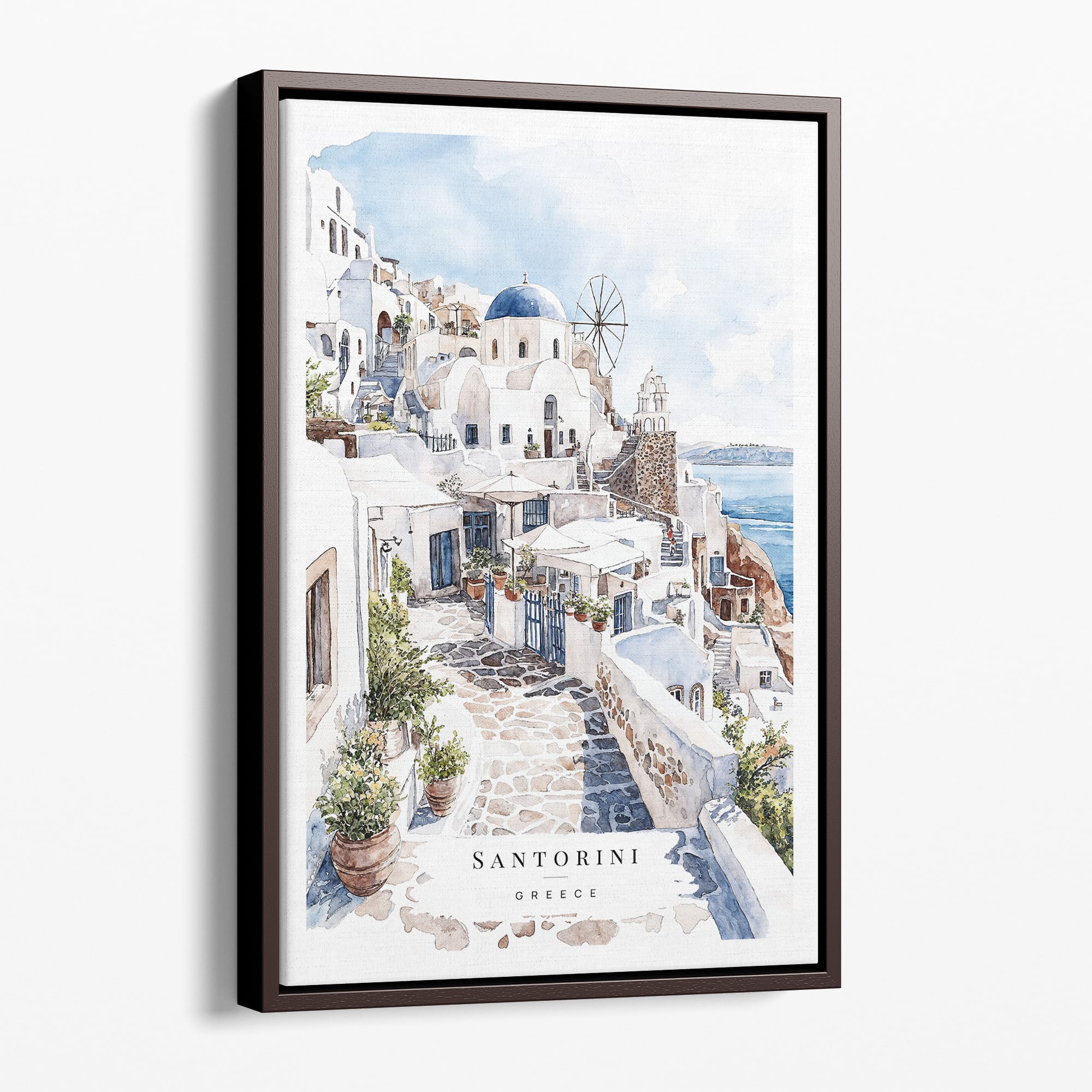 Framed Santorini Blue Dome Watercolor Canvas Print – Charming Coastal Village Art