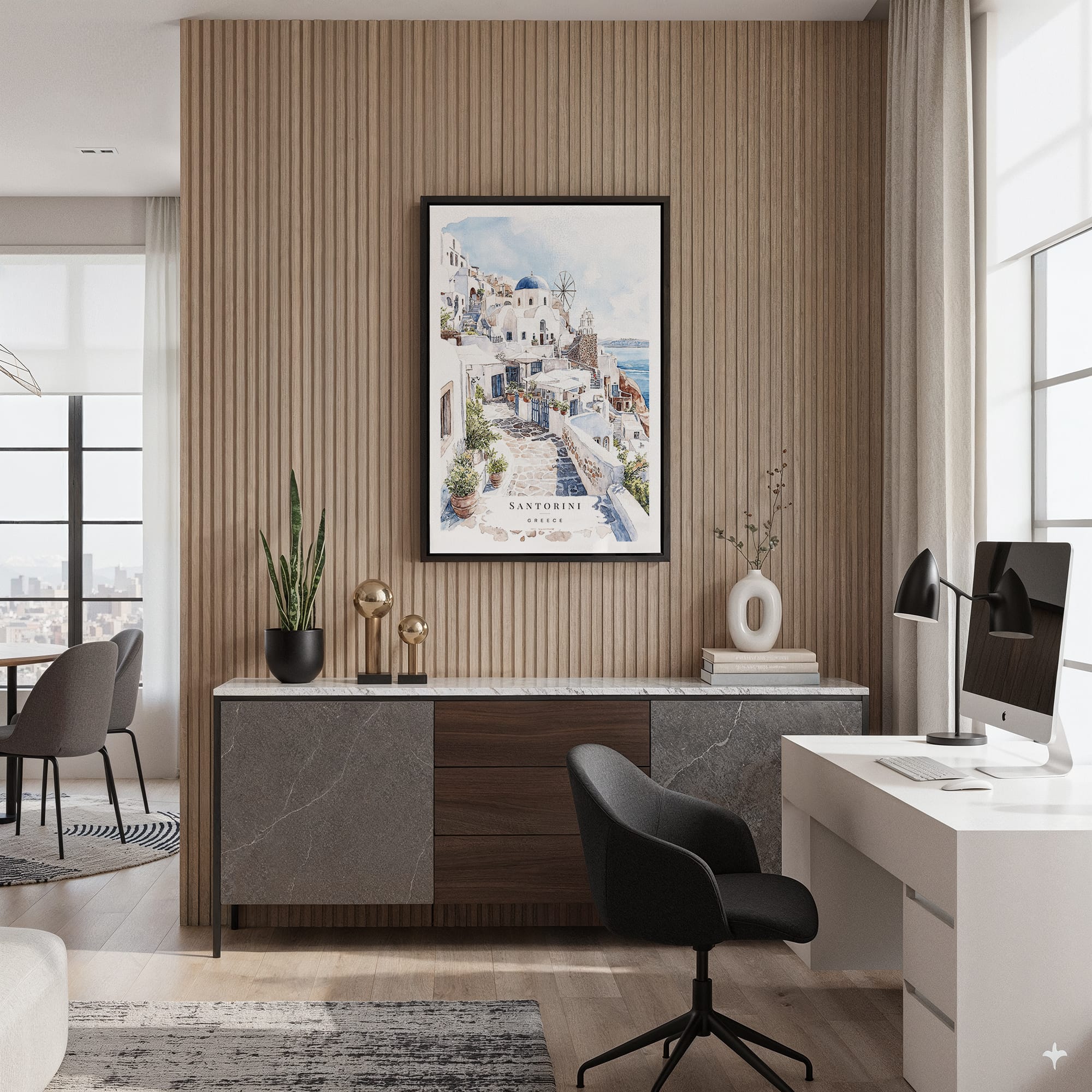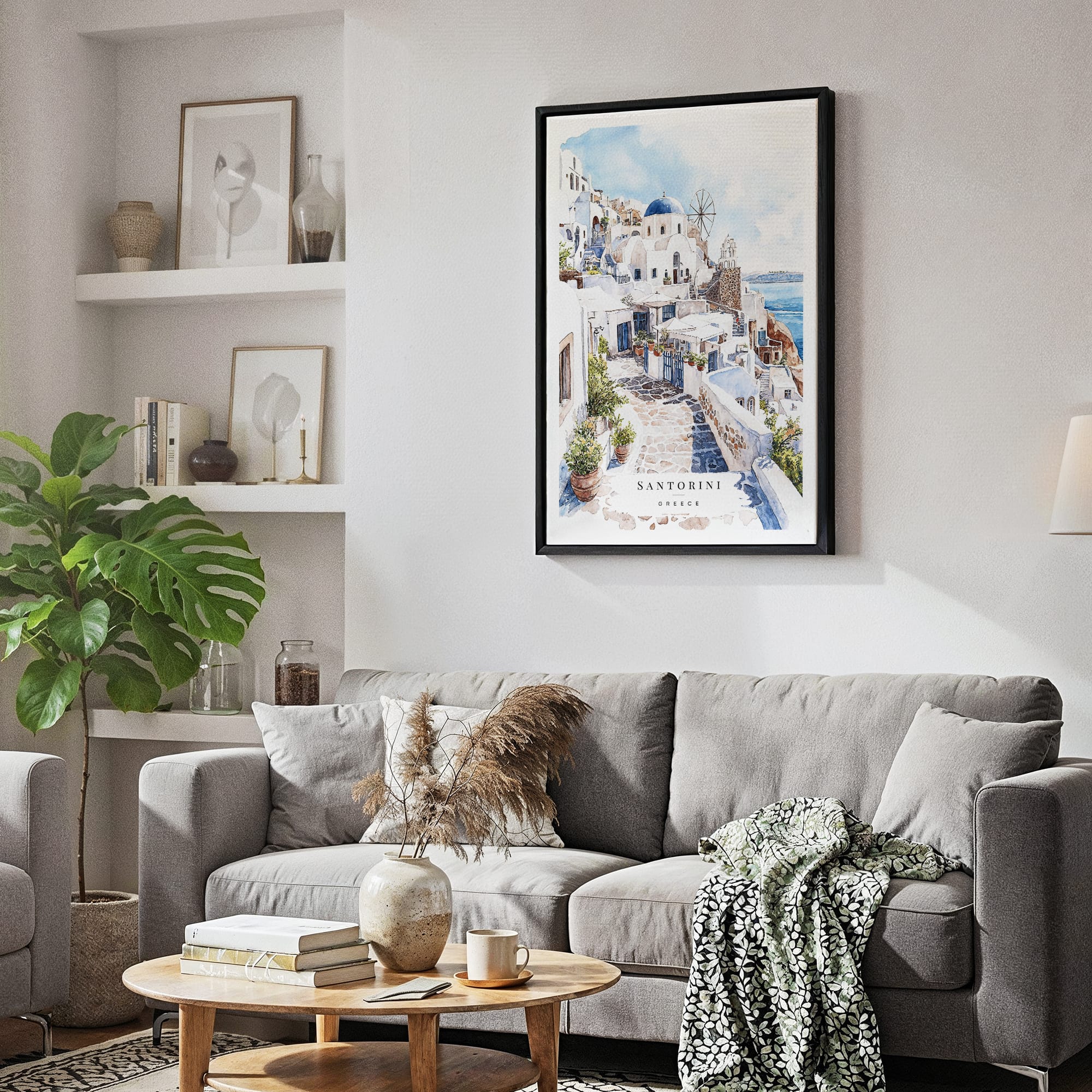 Brighten your space with this Santorini watercolor canvas art print. Featuring soft blues and gentle stone tones, it’s perfect for a living room or bedroom update, and easy to hang.
