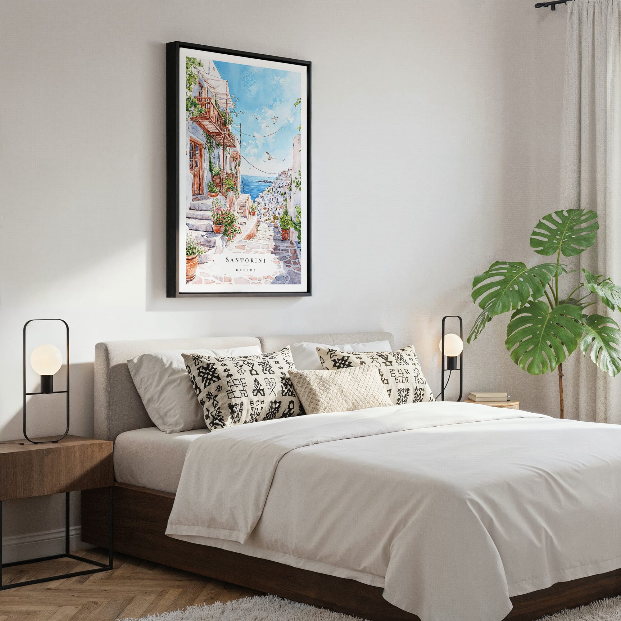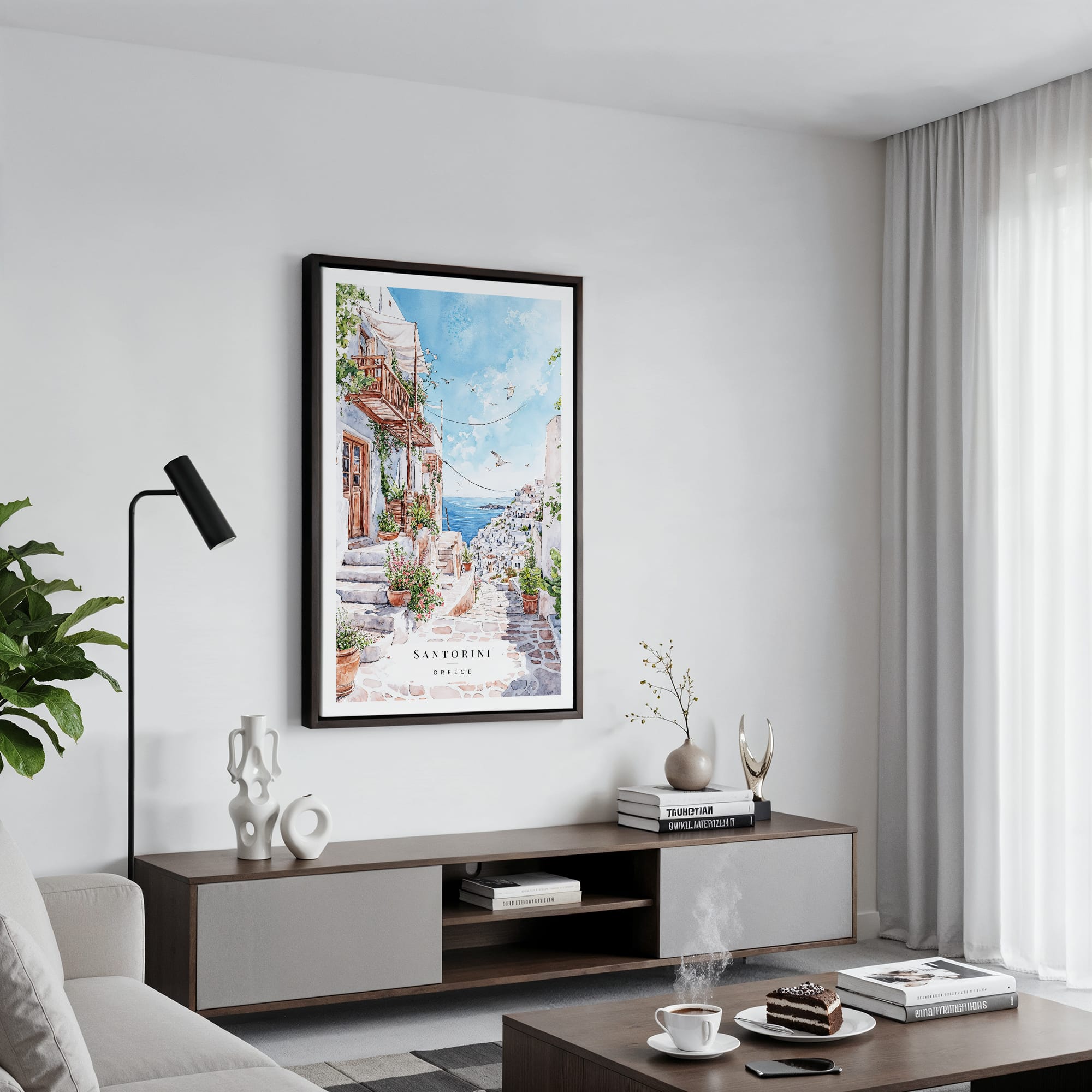 Framed Santorini Watercolor Canvas Art Print – Serene Coastal Scene