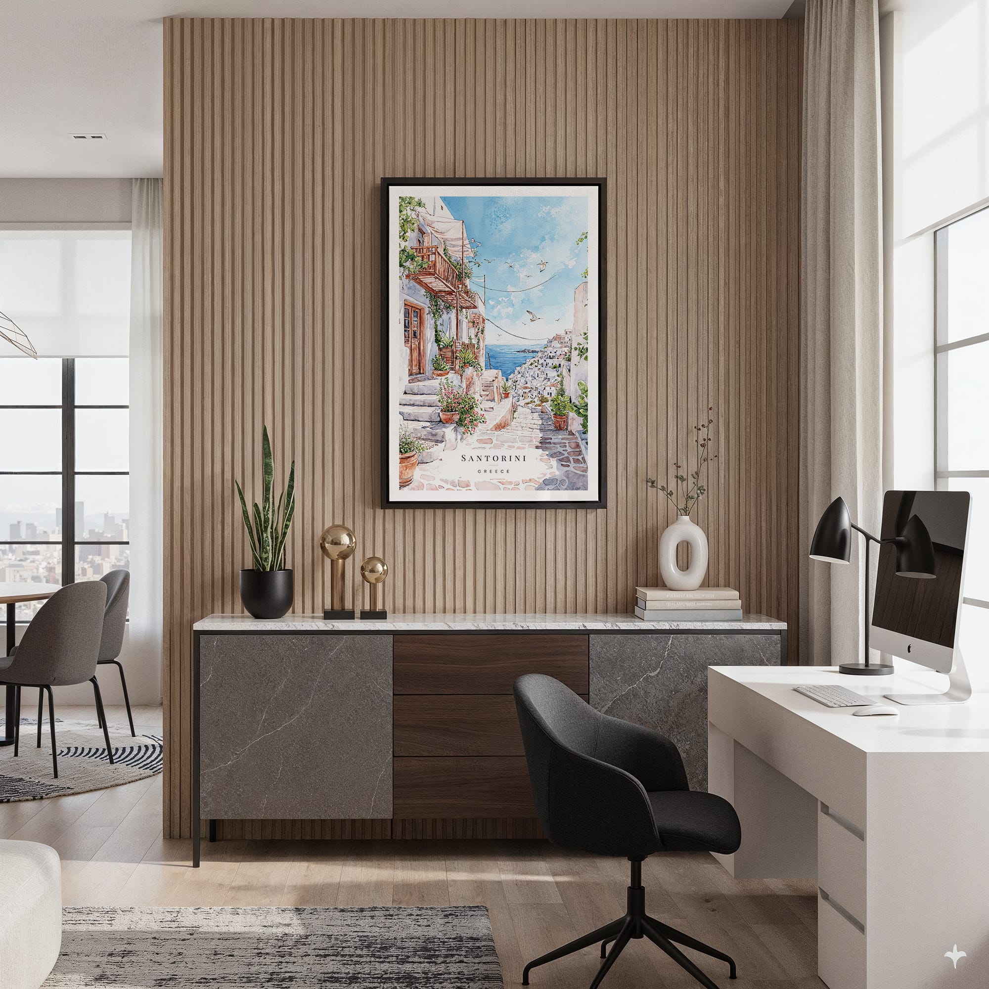 This artwork captures the essence of Santorini with soft blues and vibrant greens, creating a cheerful and inviting atmosphere. The detailed view of the coastal village and blooming flowers enhances the charm of your home or office. Printed on durable canvas using fade-resistant inks, it arrives ready to hang. This piece fits seamlessly into living rooms, bedrooms, or workspaces, making it a lovely gift for anyone who cherishes travel.
