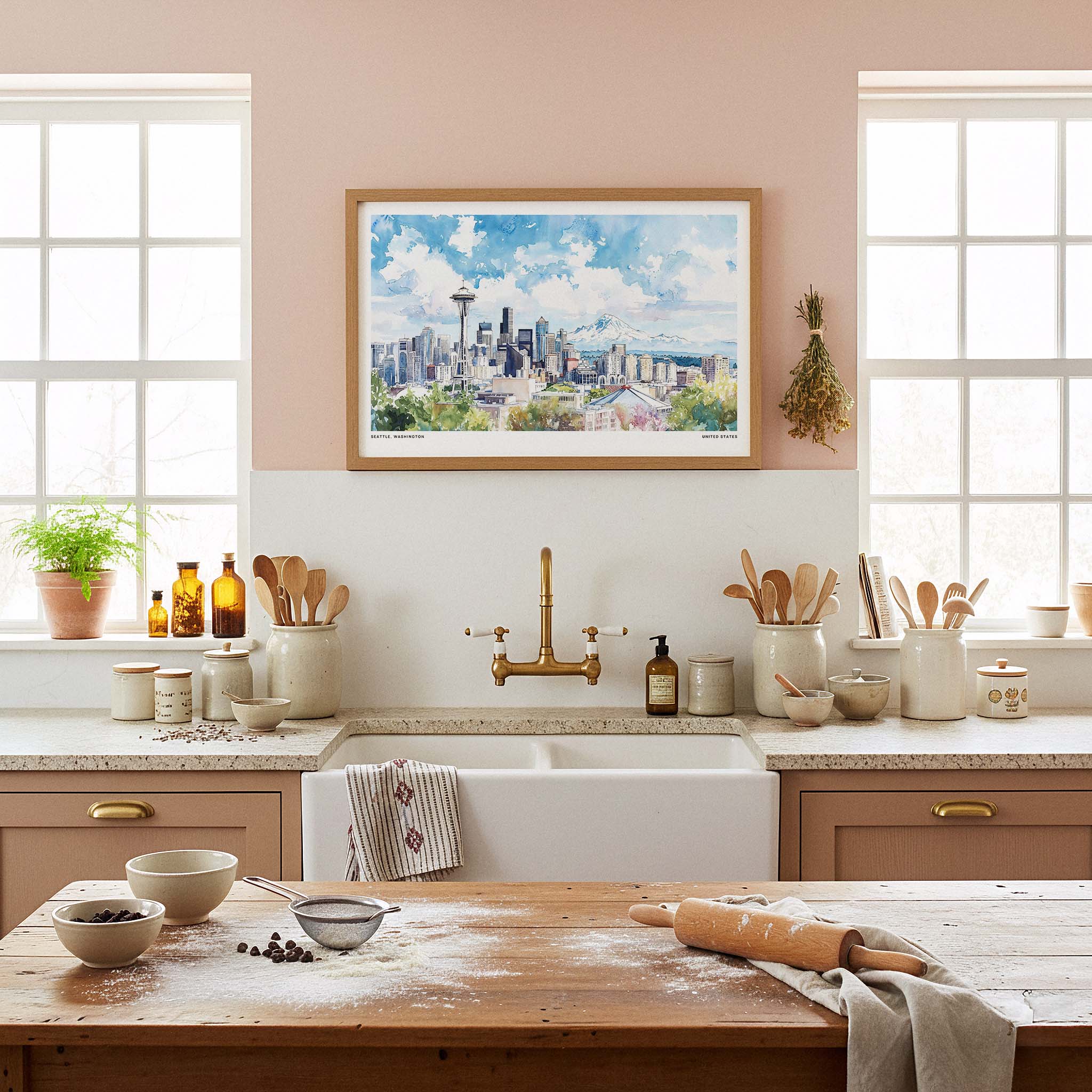 Experience the beauty of Seattle in this watercolor art print, featuring a stunning skyline set against the backdrop of Mount Rainier. The soft colors and gentle lines evoke a sense of adventure and nostalgia, making it a charming addition to your living room or workspace. Ideal for those who appreciate travel and architecture, this print serves as both decor and a reminder of cherished journeys. It’s a thoughtful gift for someone who dreams of exploring the Pacific Northwest.