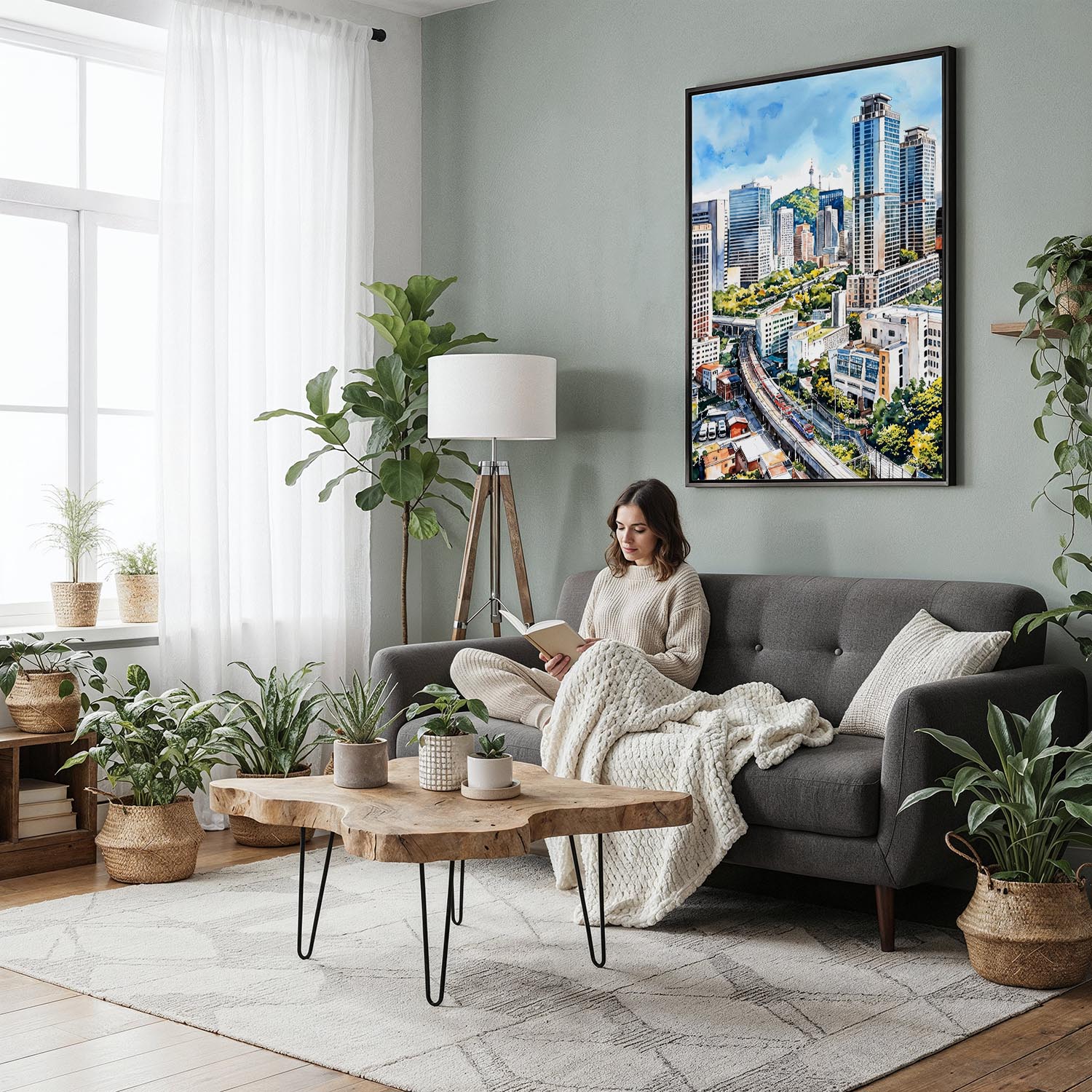 Framed Seoul Skyline Watercolor Canvas Print – Urban Cityscape Art