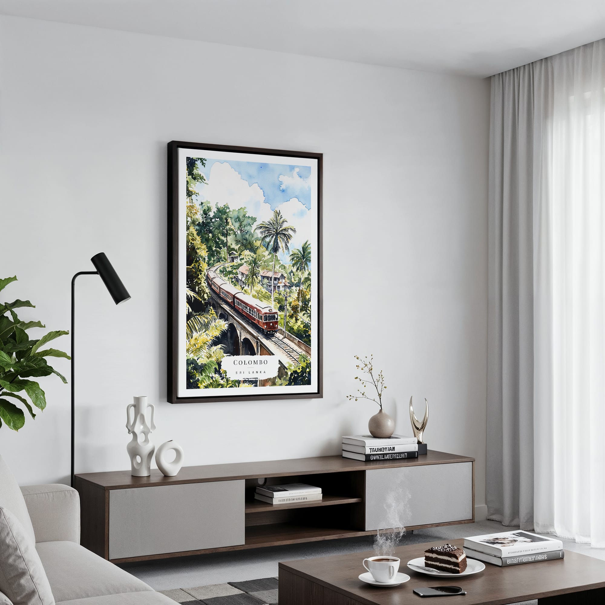 Framed Sri Lanka Train Watercolor Canvas Print – Lush Jungle Landscape Wall Art