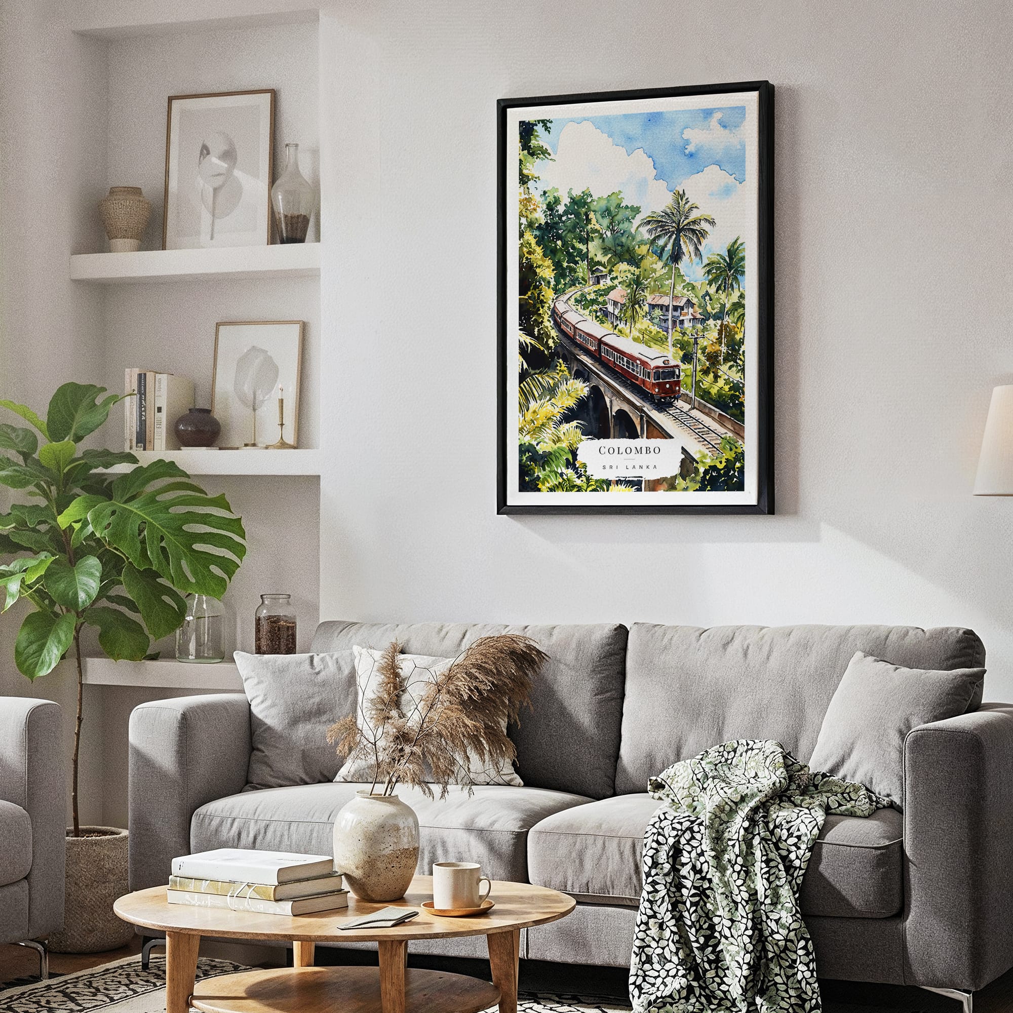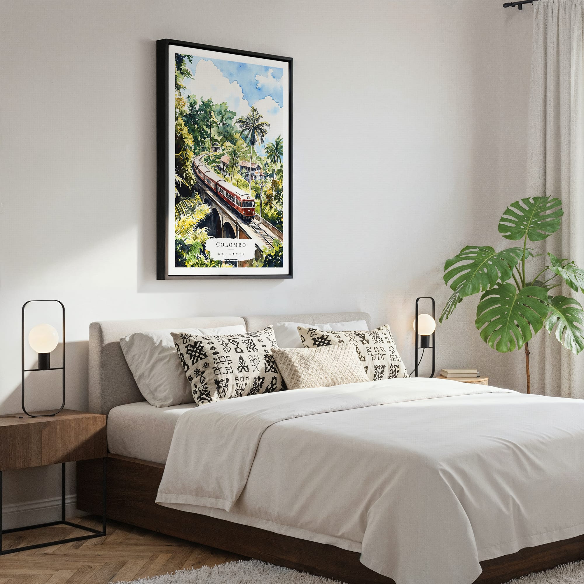 This watercolor canvas print captures a scenic train journey through Sri Lanka’s vibrant greenery. With its rich colors and serene mood, it’s a great addition to any room and easy to hang.