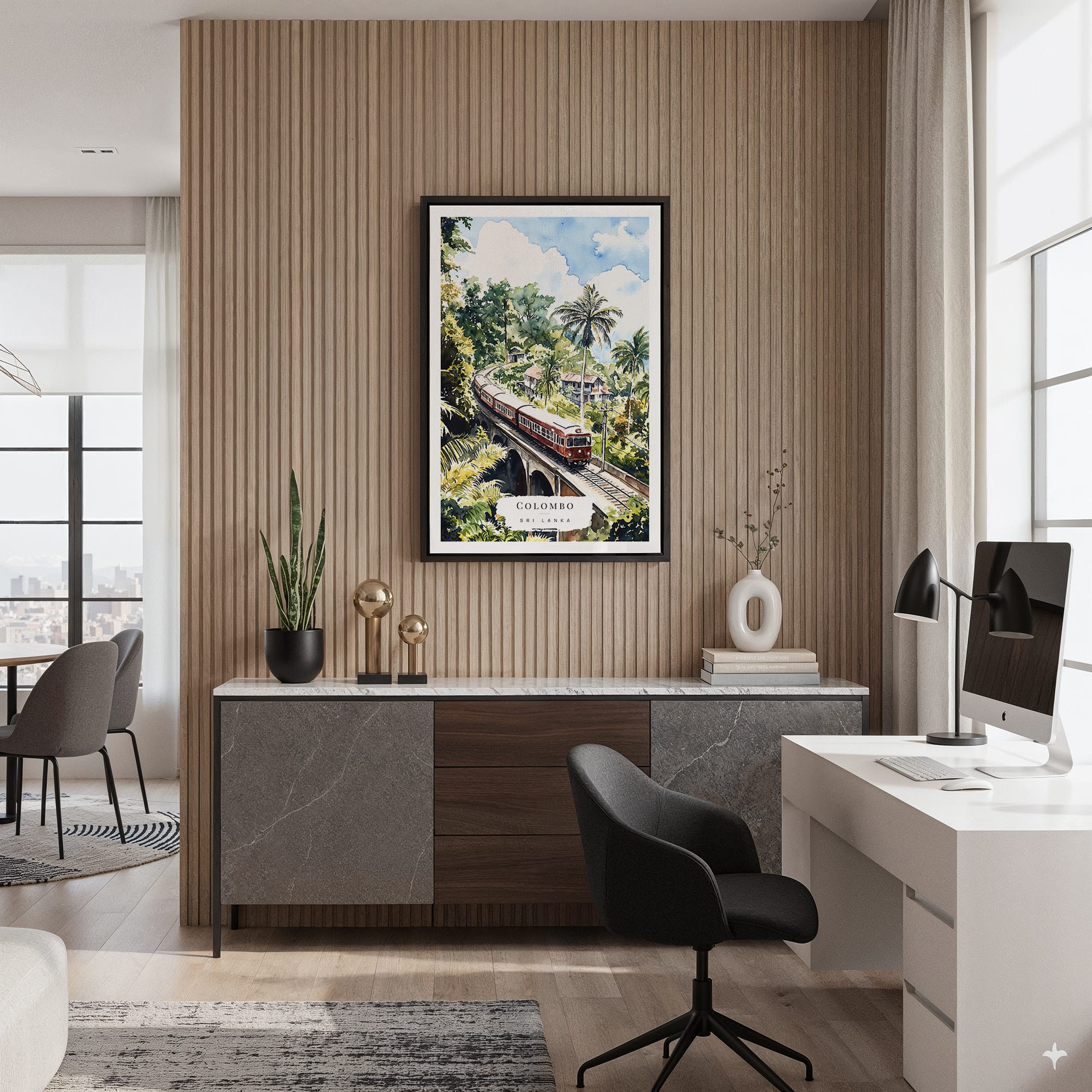 This artwork brings to life a picturesque train traveling through lush Sri Lankan jungles, showcasing vibrant greens and the warmth of tropical landscapes. Its calming atmosphere makes it perfect for living spaces, offices, or personal nooks. Printed on high-quality canvas with fade-resistant inks and featuring a matte finish, it arrives ready to hang. An ideal choice for those enamored with travel or anyone looking to refresh their space.