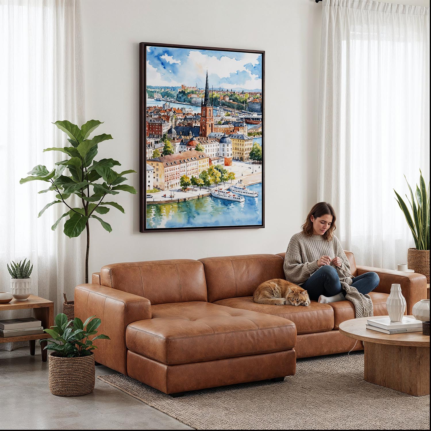 This artwork captures the vibrant skyline of Stockholm, where colorful buildings meet tranquil waters. The watercolor style brings a lively atmosphere to your space, inviting warmth and creativity.