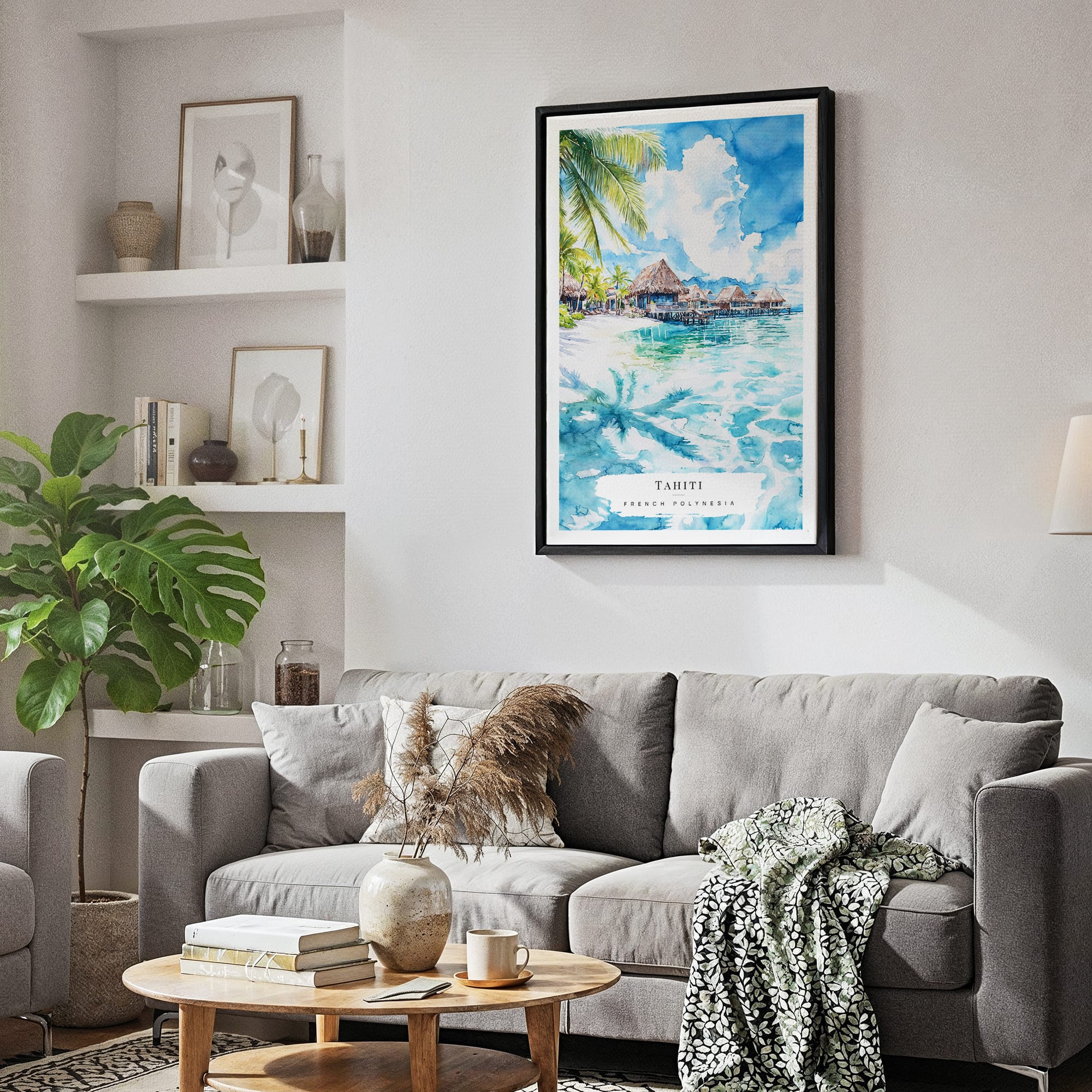 Framed Tahiti Watercolor Canvas Print – Tropical Beach Scene with Palm Trees