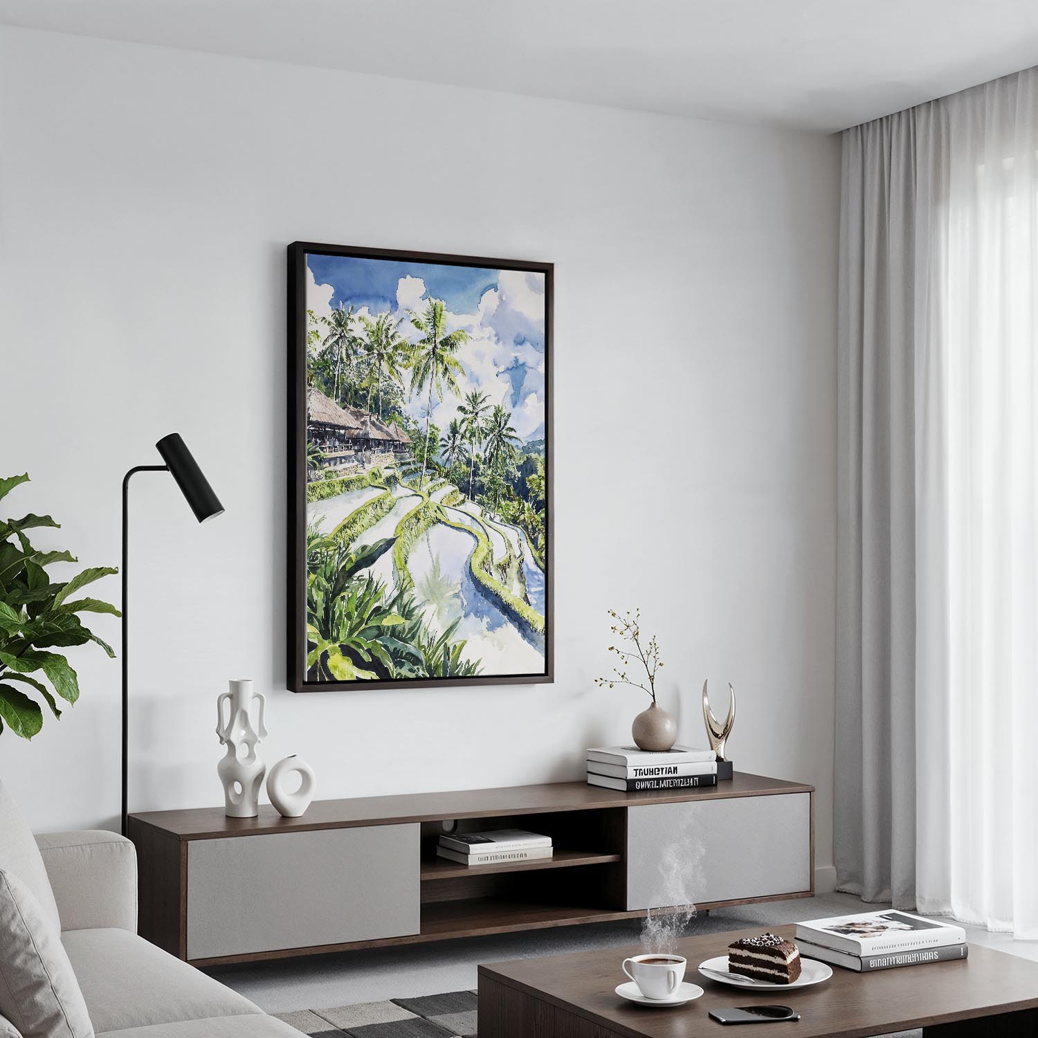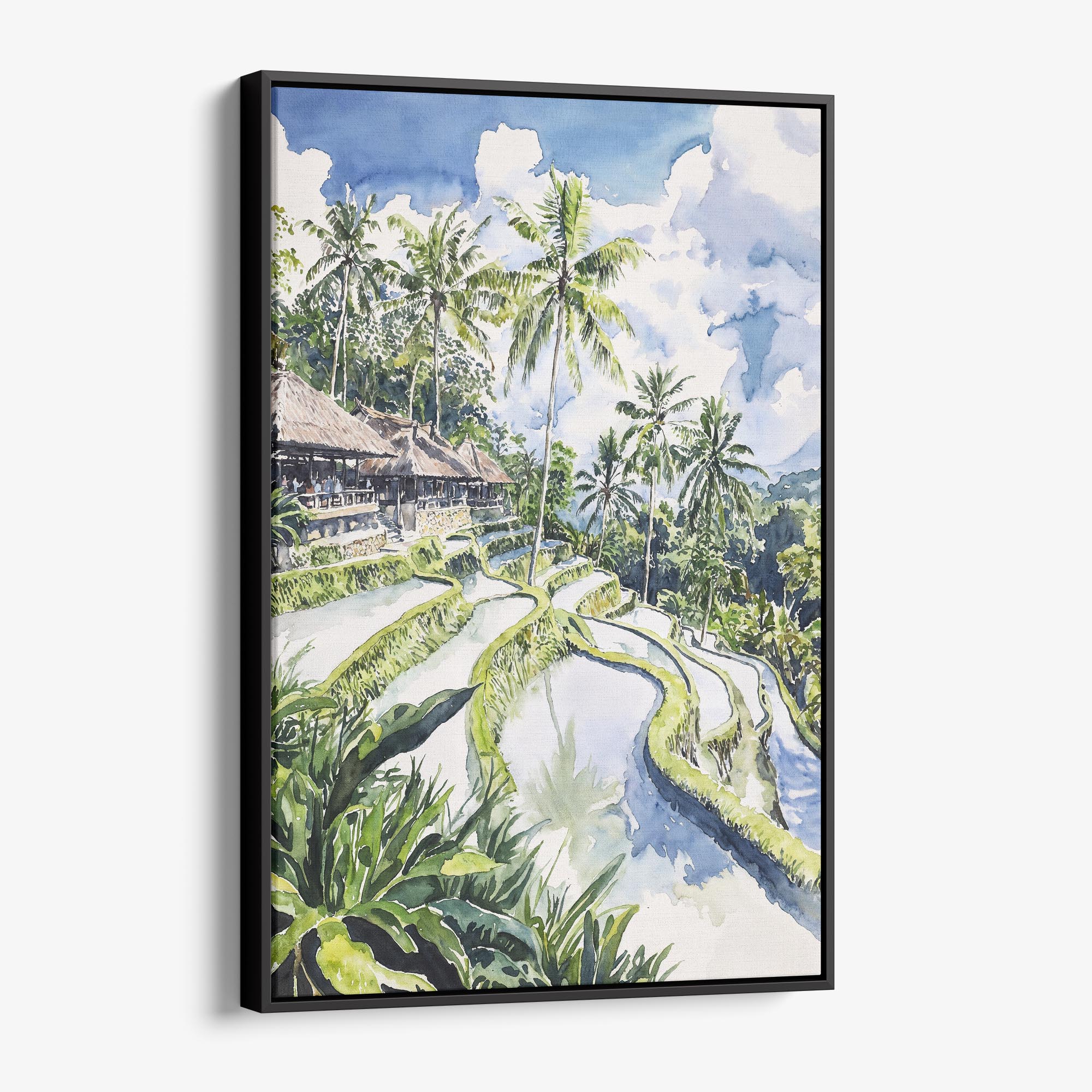 Framed Tegallalang Rice Terrace Ubud Bali Canvas Print – Watercolor Landscape Art