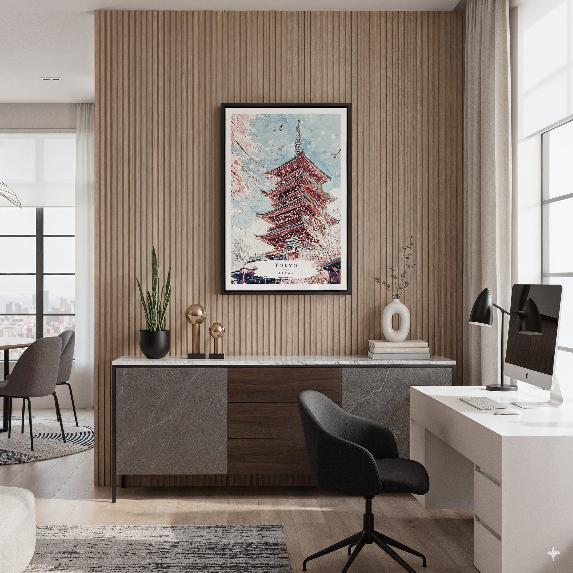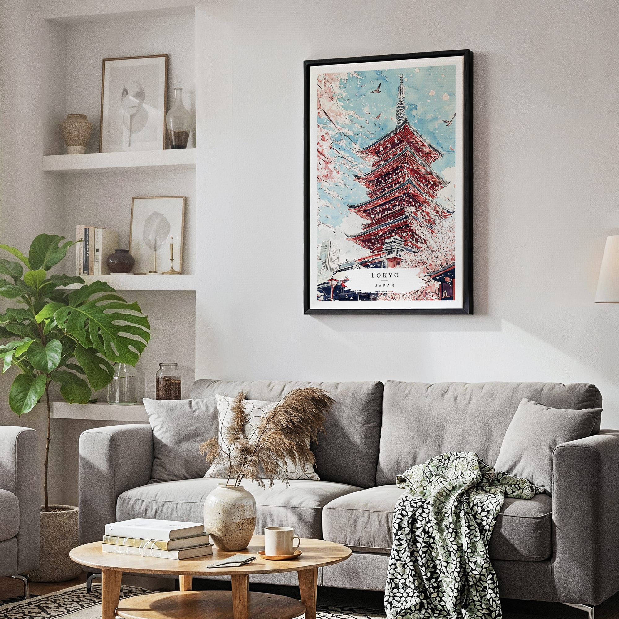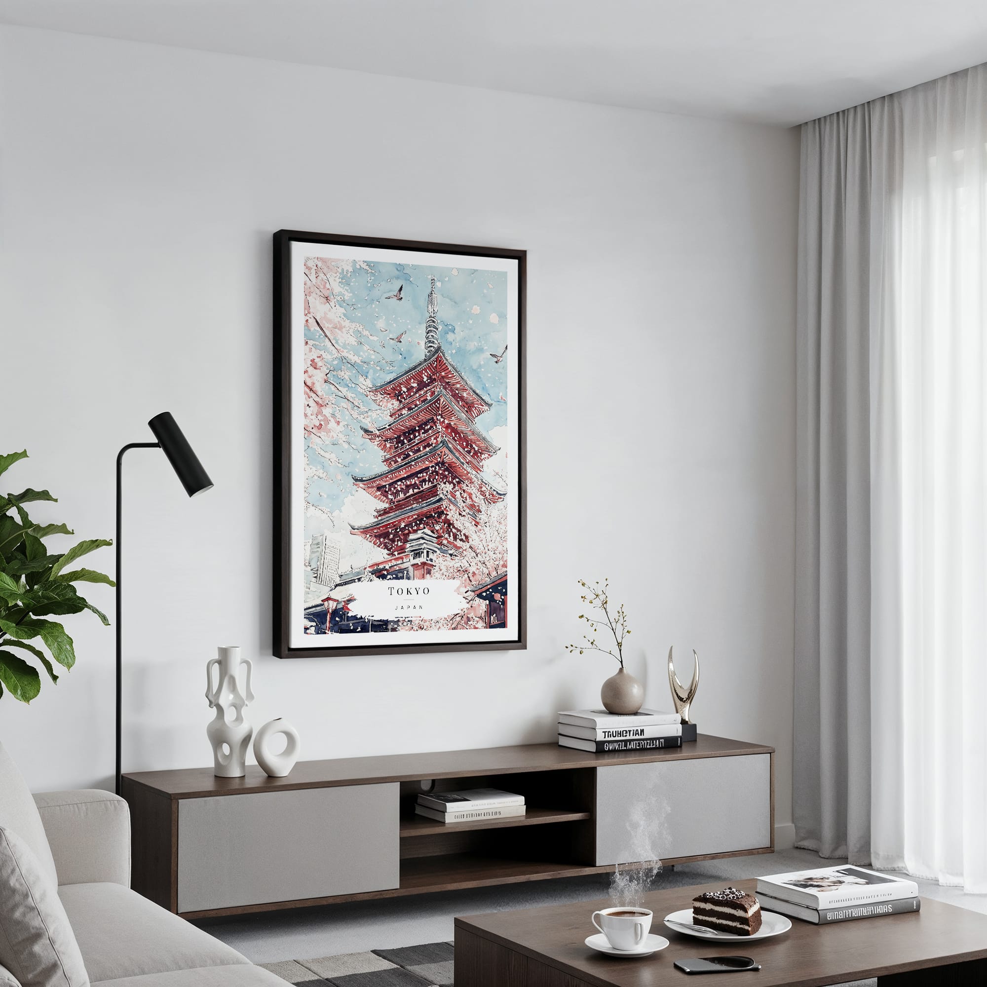 Framed Tokyo Sakura Watercolor Canvas Print – Cherry Blossom Pagoda Art