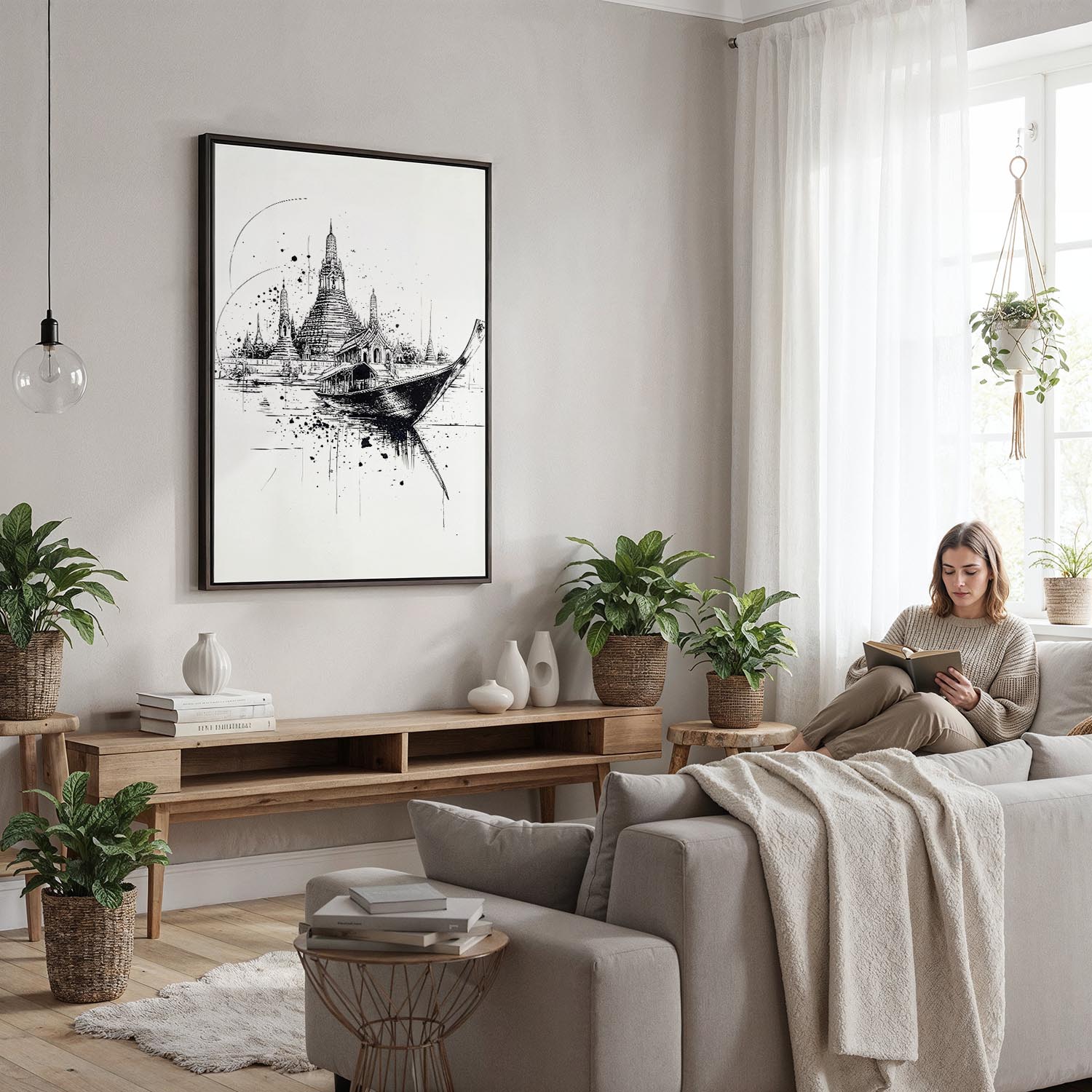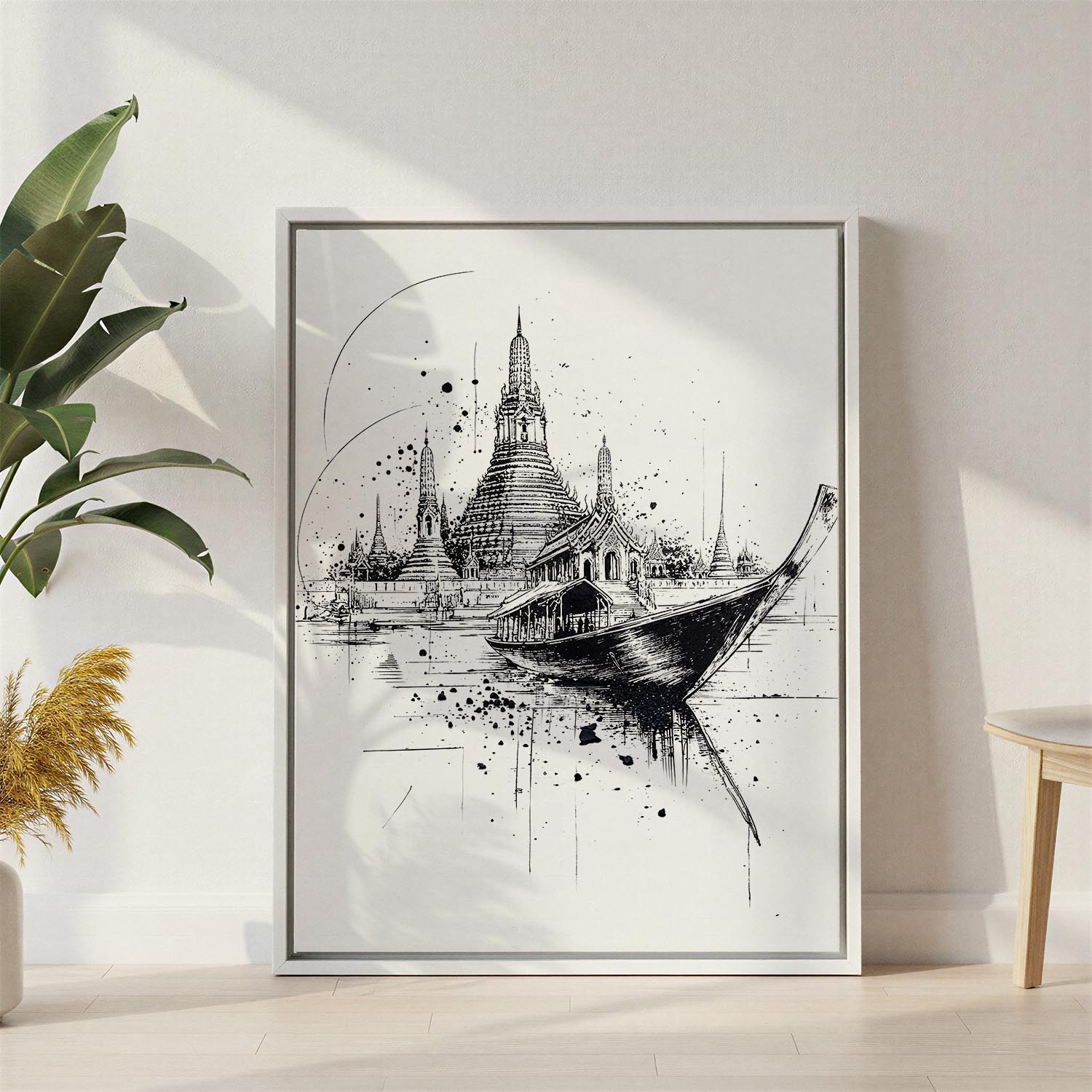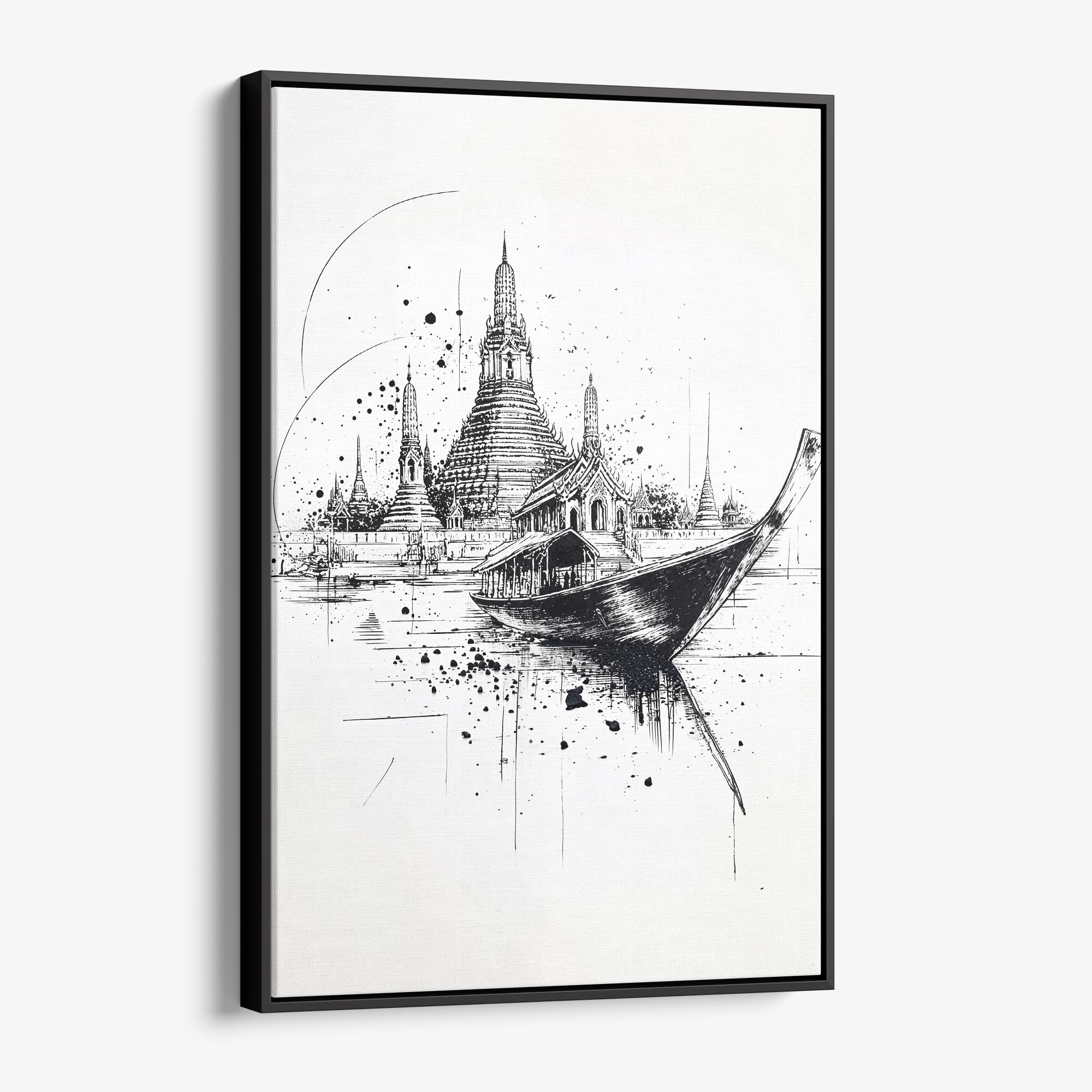 Framed Wat Arun Canvas Print – Thai Temple Pencil Drawing Art