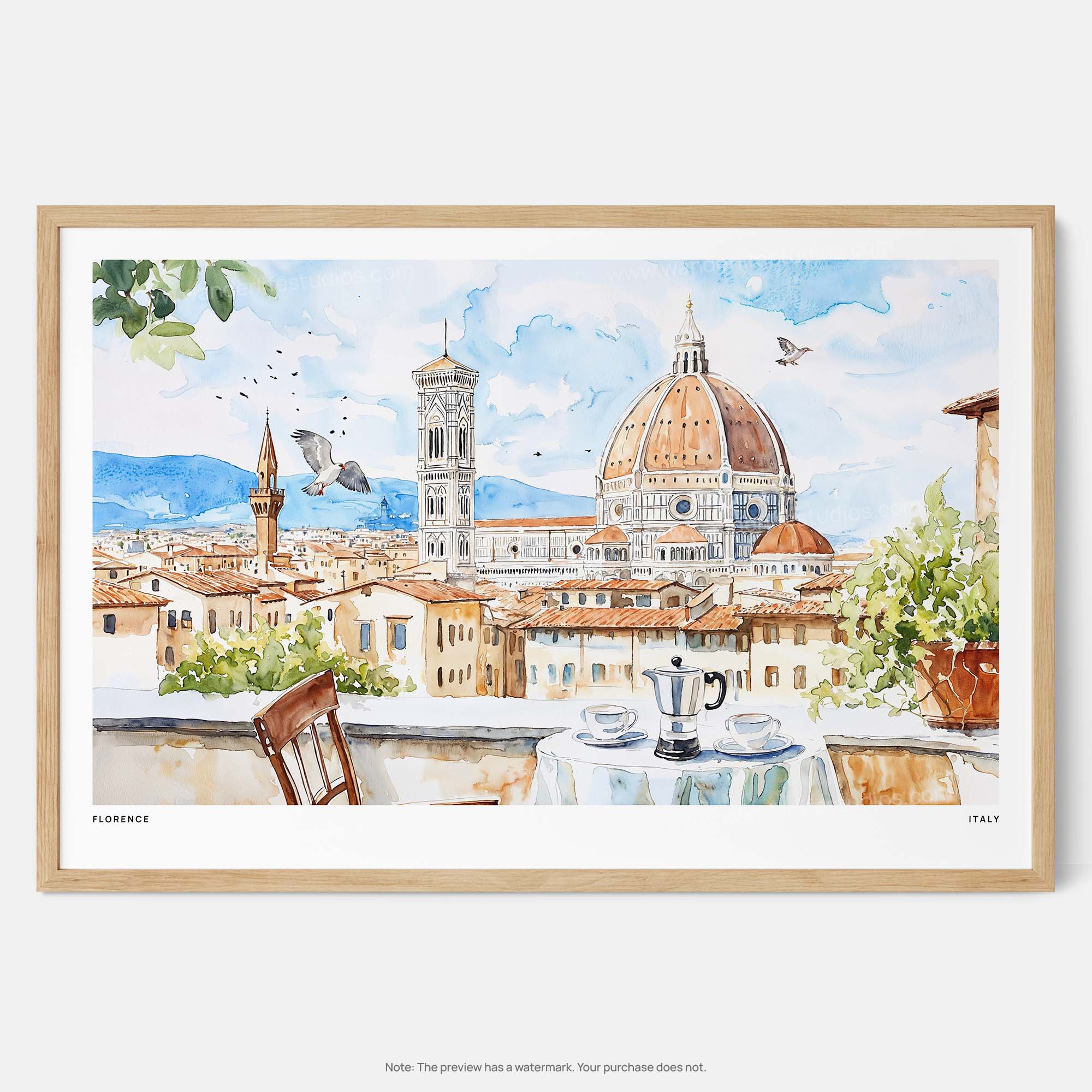 Experience the charm of Florence with this watercolor art print featuring a serene morning coffee scene. Ideal for those who love travel and beautiful cityscapes.