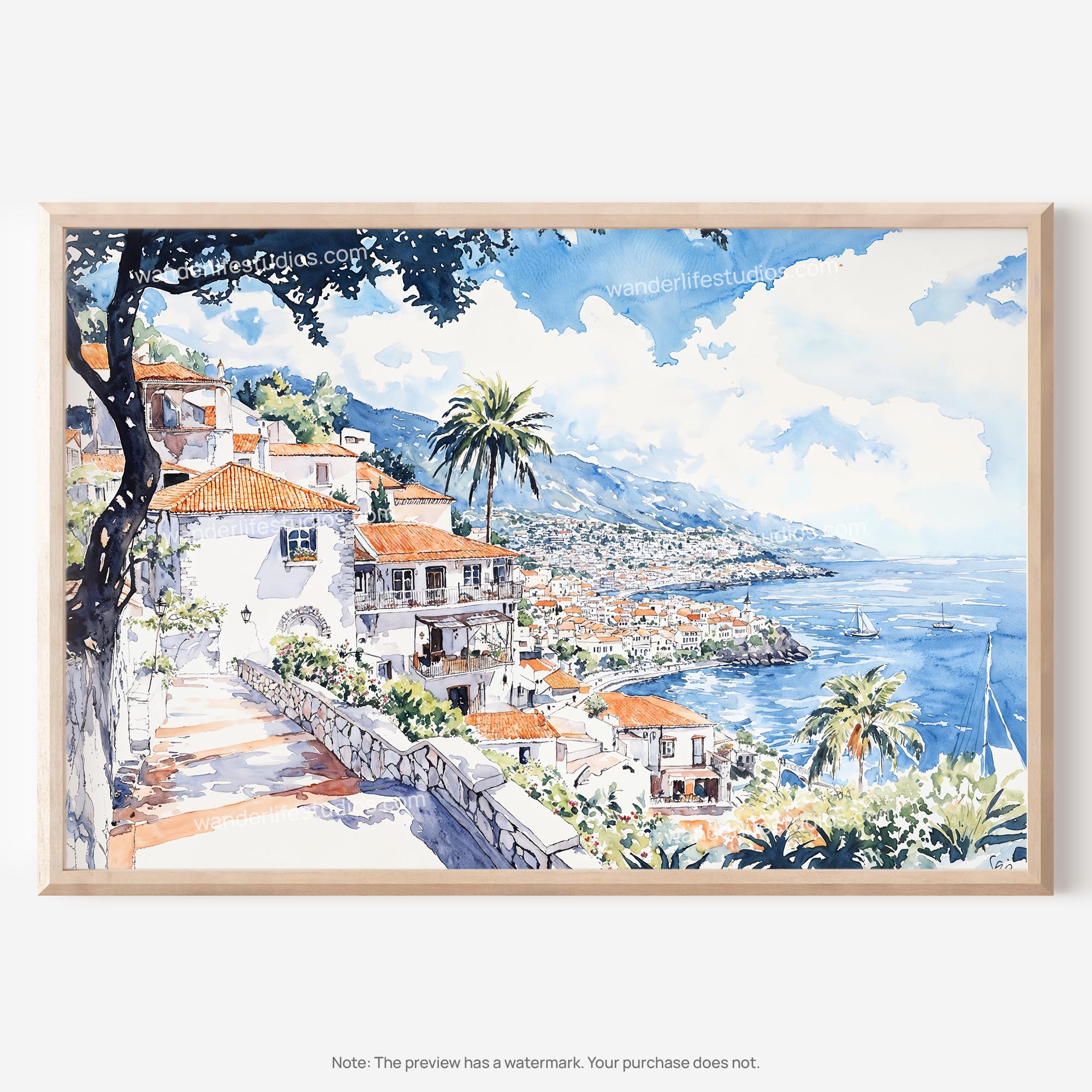 Funchal Portugal Watercolor Art Print – Coastal Scene Digital Download