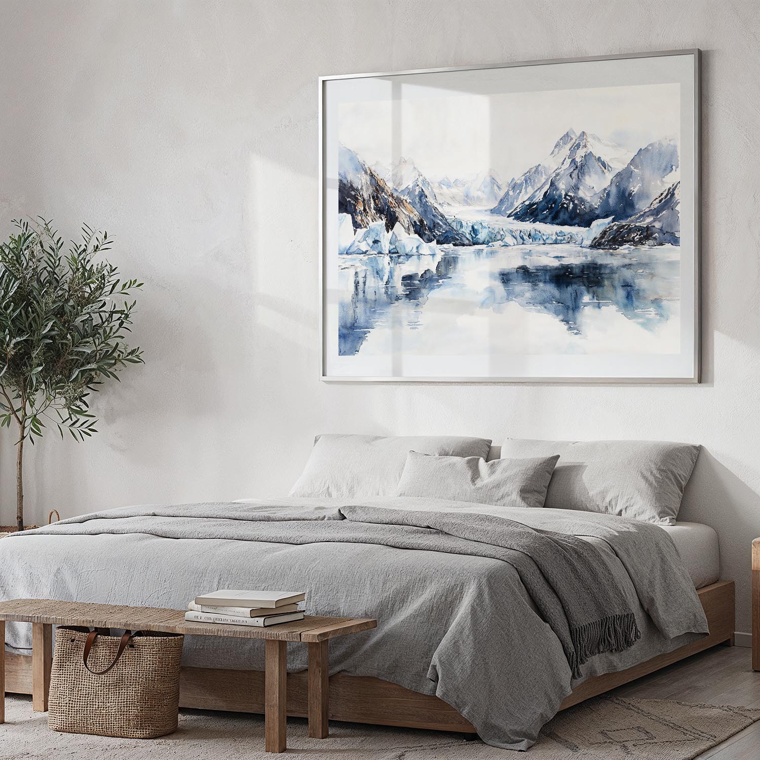 A gentle breeze whispers through the icy fjords of Glacier Bay. Crisp air fills your lungs as majestic peaks rise from the water’s edge, showcasing their rugged beauty. The soft blend of blues and whites in this watercolor evokes the tranquility of nature.