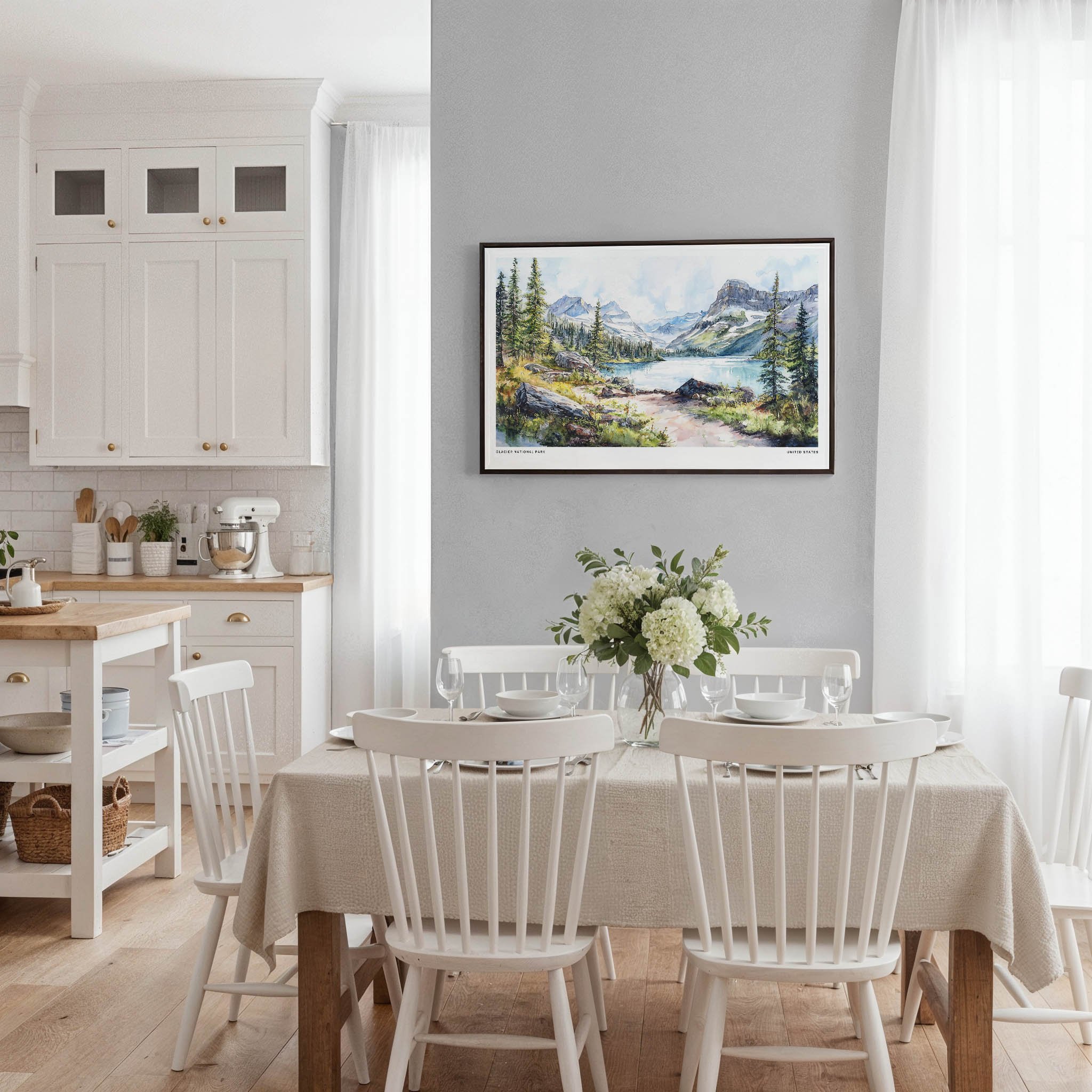 This canvas print captures the breathtaking scenery of Glacier National Park, highlighting serene lakes, majestic mountains, and rich greenery in a soothing watercolor style. The artwork adds a warm, inviting feel to any space, making it ideal for living rooms, bedrooms, or offices. Crafted from a durable hand-stretched canvas with solid wood stretcher bars and fade-resistant inks, it arrives ready to hang. A wonderful piece for personal enjoyment or as a thoughtful gift for nature enthusiasts.