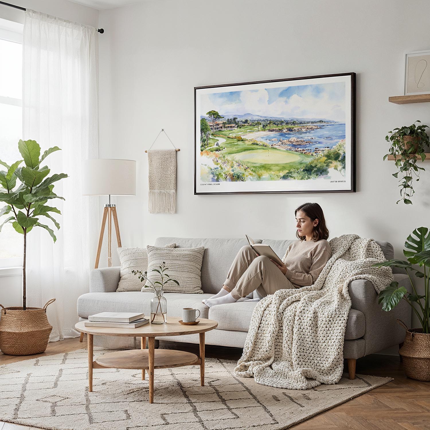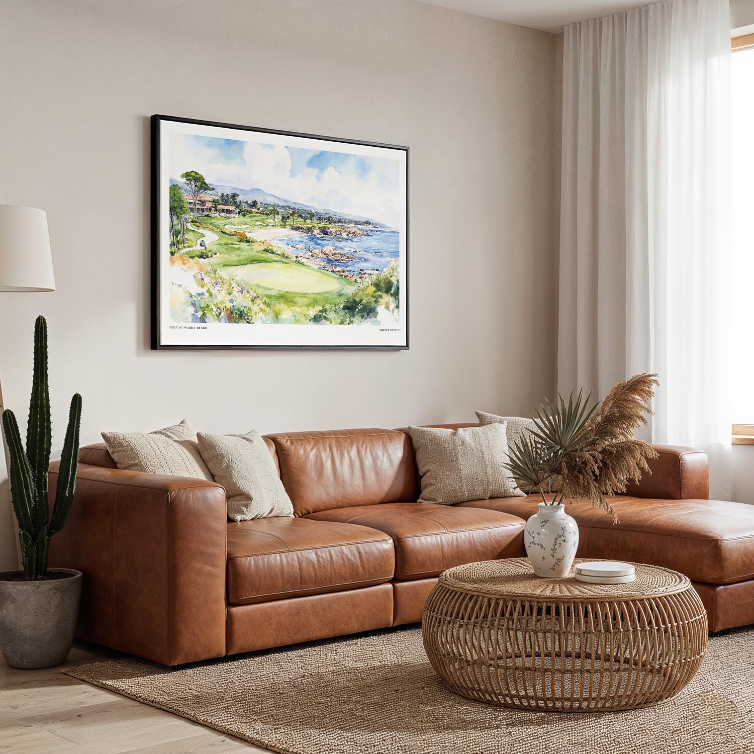 This canvas print captures the stunning coastal landscape of Pebble Beach, showcasing lush greens and serene waters. The watercolor style creates a fresh, inviting atmosphere that brightens any room. Made from hand-stretched canvas with fade-resistant inks, it arrives ready to hang. Perfect for living rooms, bedrooms, or offices, this piece also makes a thoughtful gift for golf enthusiasts or coastal lovers.